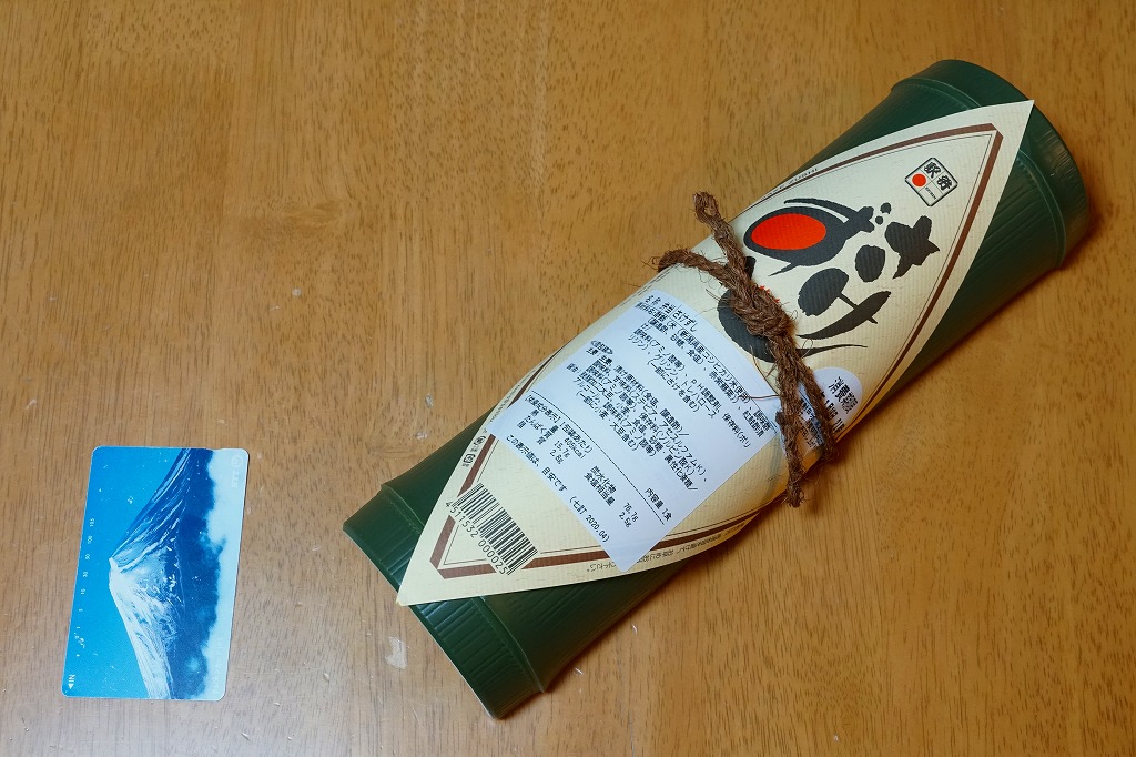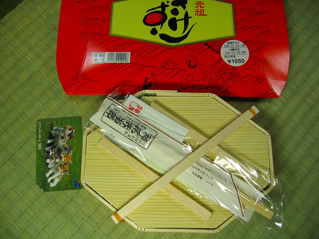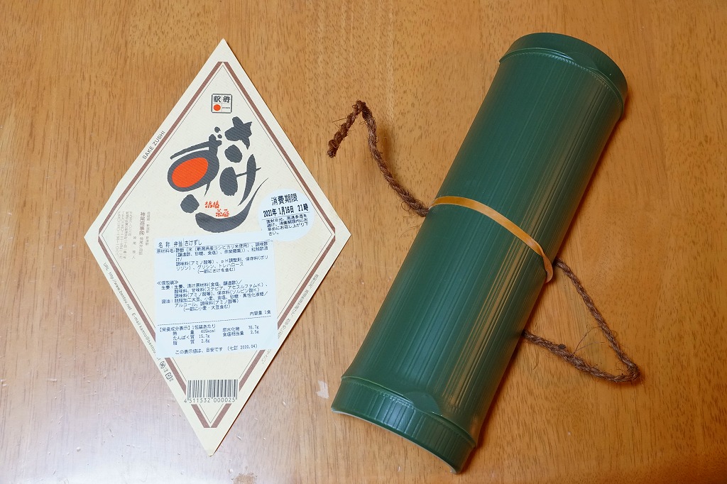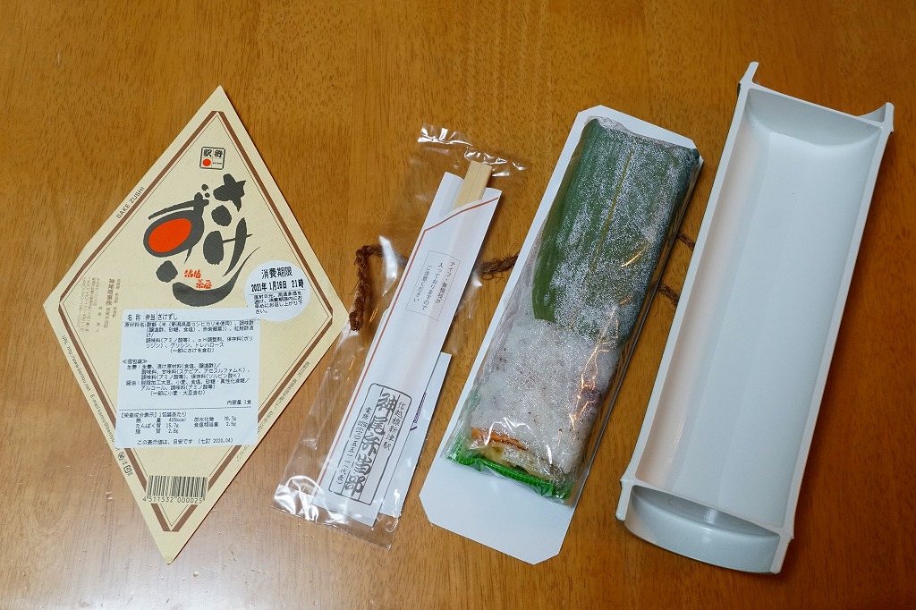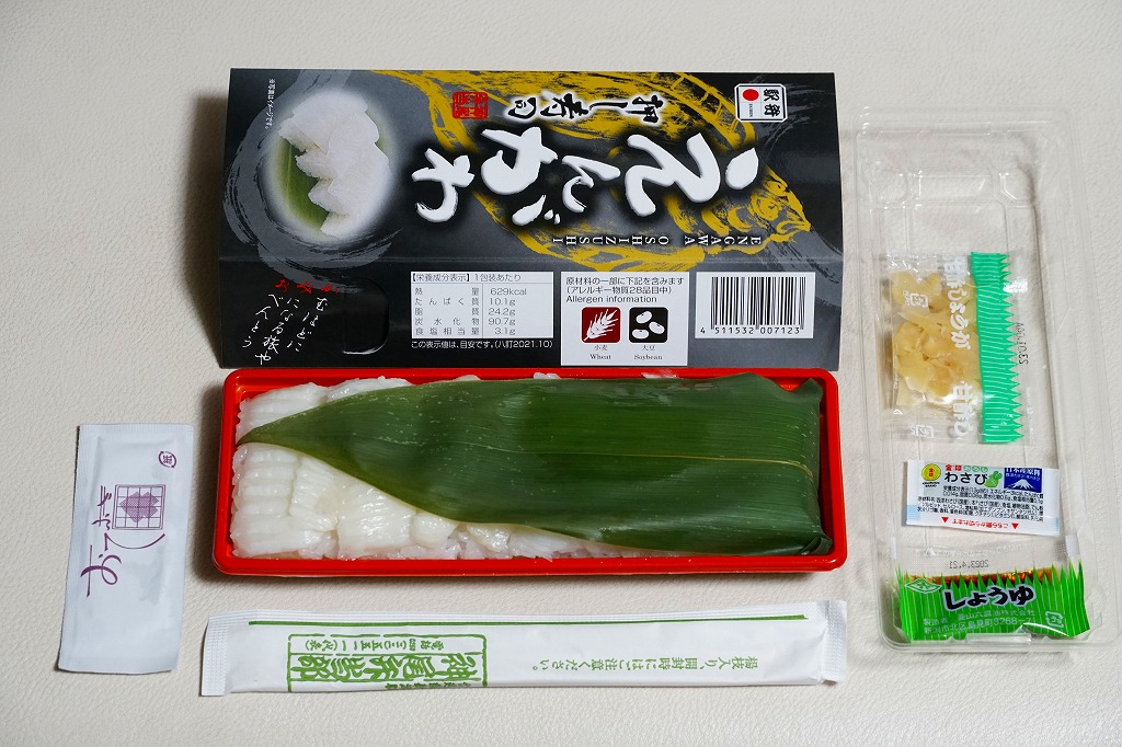 昔は本物の竹を使ったという、竹を縦に割った形状のプラスティック製容器を使用、そこに笹の葉を敷き、コシヒカリ使用のすし飯の上にたっぷりとカズノコ醤油漬が載る。その間に挟まる鰹節の効果か、カズノコも酢飯も本当にふんわりした感じが出ている。紅生姜と醤油が袋で付くが、かける前に一口はそのままでいただきたい。