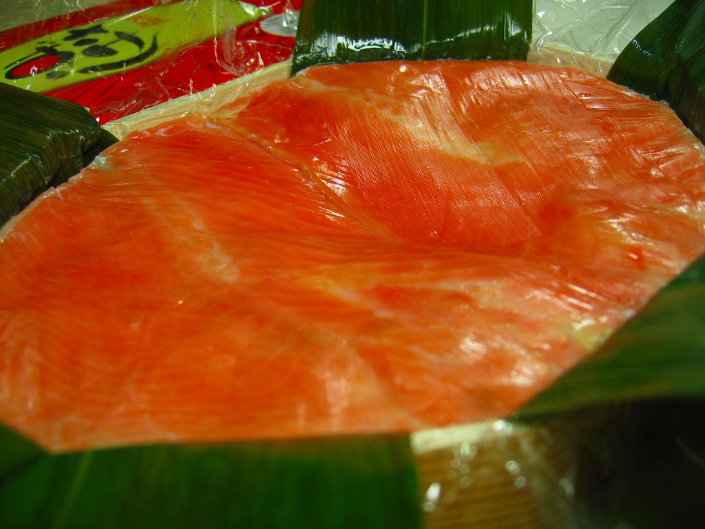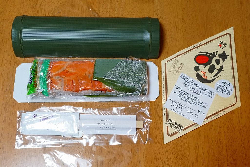 調製元の公式サイトによると昔から好評の駅弁らしく、朝の時間帯で駅弁の種類がとても少なかった新潟駅でもちゃんと取り扱いがあった。パッケージで鮭色に染まる柄は、新潟県村上市を流れる三面川の伝統漁法「居繰網漁」だろうか。今も10月中旬から12月初旬にかけて見学できる。価格は2005年の購入時で1,050円、2015年時点で「特製さけずし」1,250円になっている。2020年までの販売か。
