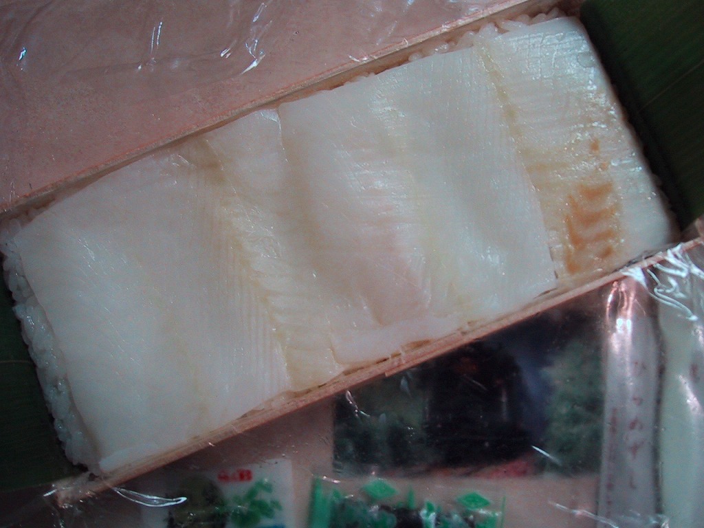 全国で唯一のヒラメ駅弁だとか。経木とボール紙でできた強度のある長方形の容器を、ボール紙のパッケージに収納する。中身は酢飯の上に塩と酢で締めた透き通るような白さの平目、正確には北太平洋産のハリバット(大ひらめ)を敷いている。