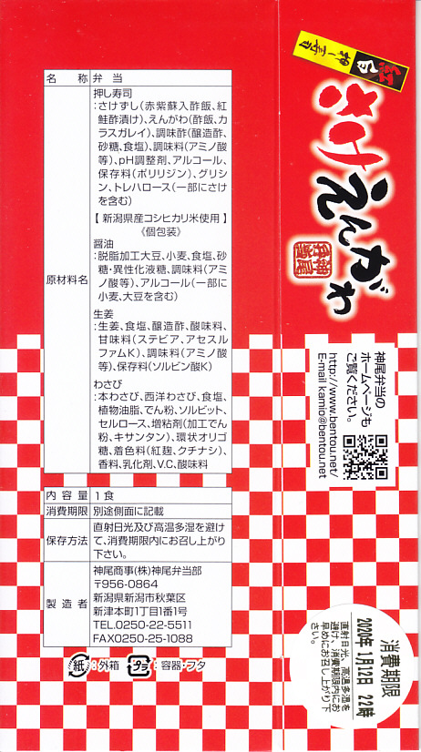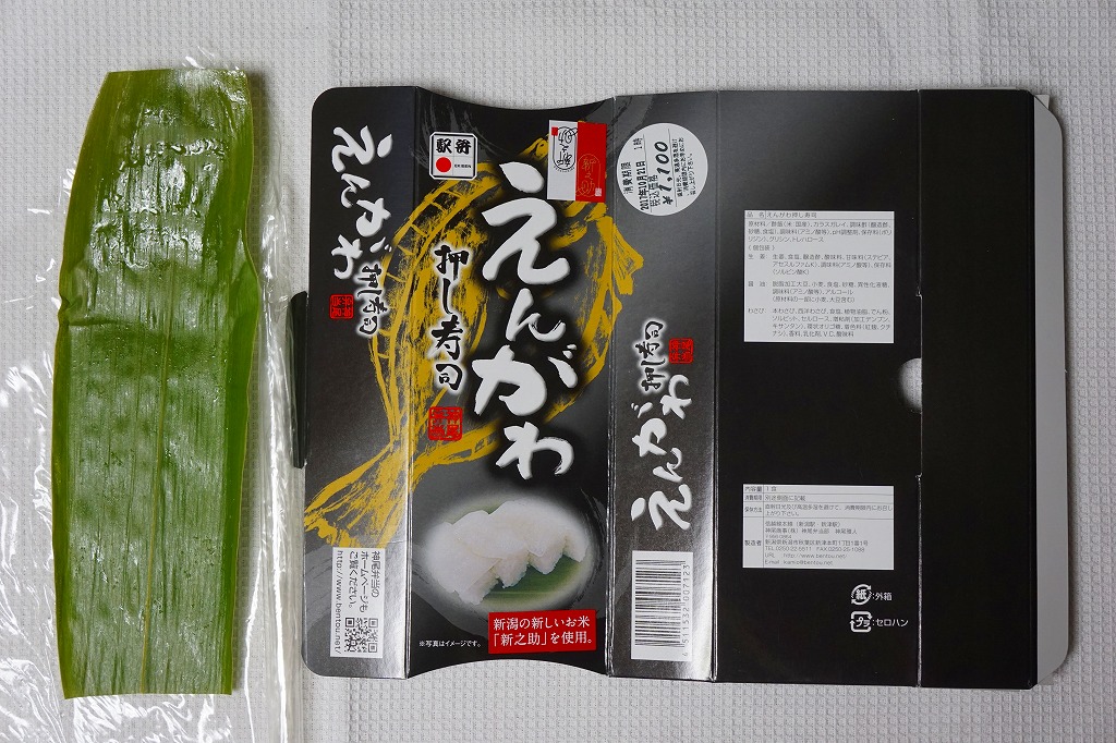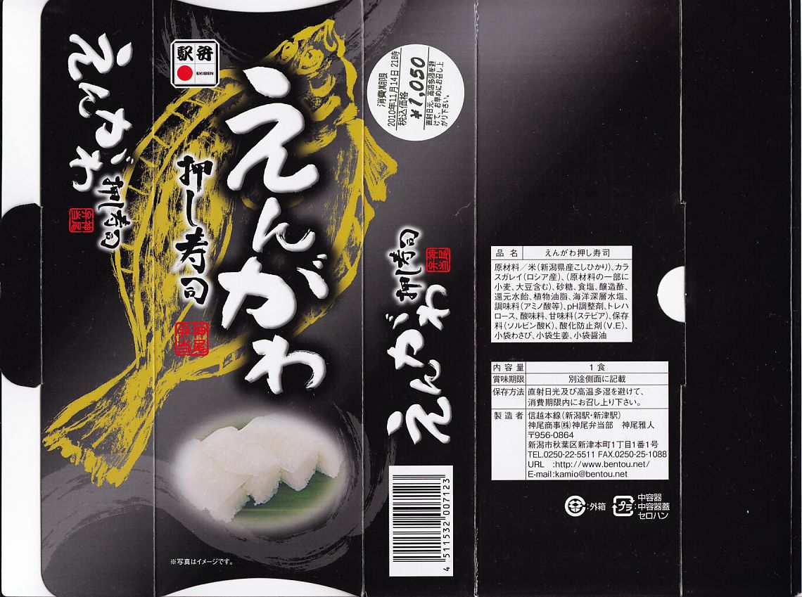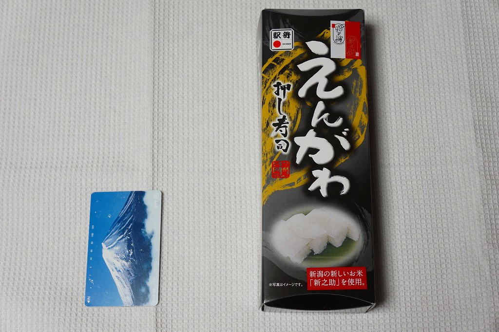 2017(平成29)年10月20日に購入した、新津駅弁のパッケージ。上記の駅弁「えんがわ押し寿司」の米を、2017(平成29)年の秋に本格デビューした新潟県一押しの新品種「新之助」に、同年9月から置き換えて販売した。加えて同年秋のJR東日本の駅弁キャンペーン「駅弁味の陣2017」にエントリー。