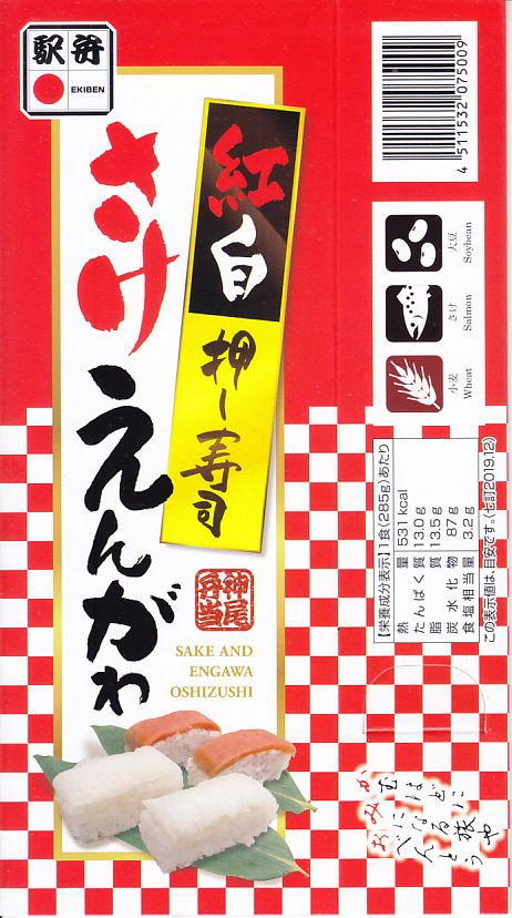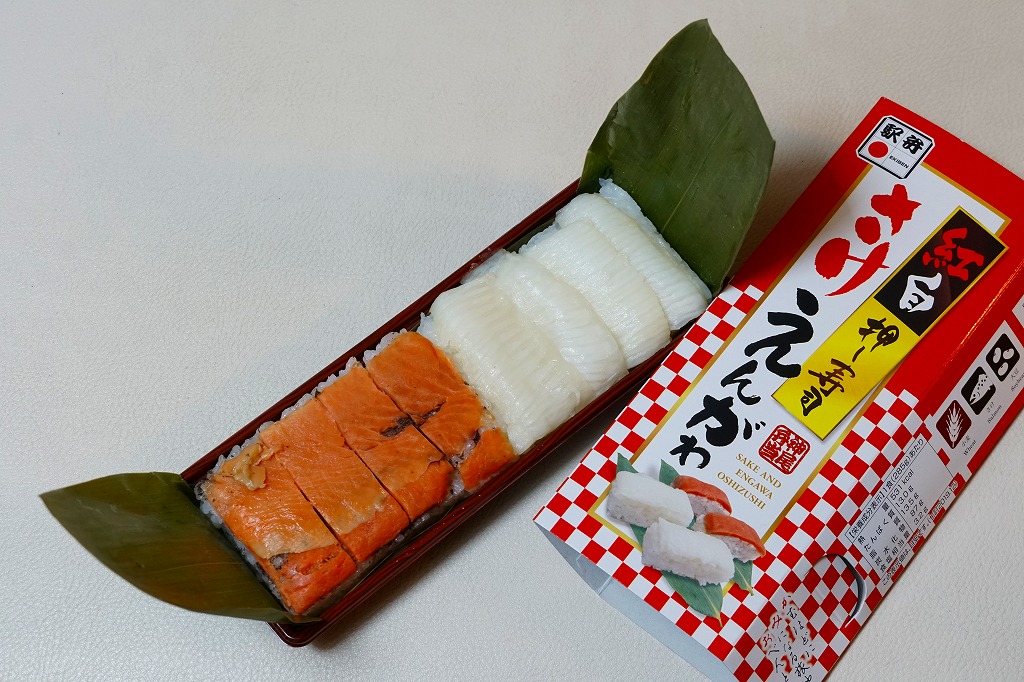 2020(令和2)年1月の京王百貨店の駅弁大会で実演販売。人気の駅弁「えんがわ押し寿司」の、具の半分をサケに替え、これで「紅白」を名乗る。紅の色が不思議と黒く悪く見えるが、味に影響はなく、むしろ見た目が鮮やかでもまるで紙を食べているような、過去に各地で食べた鮭寿司駅弁よりも、少しは脂が乗る感じ。価格は2020年の発売時や購入時で1,200円、2023年時点で1,300円。