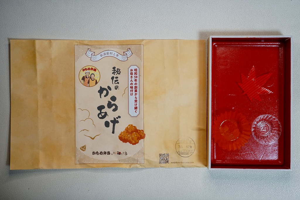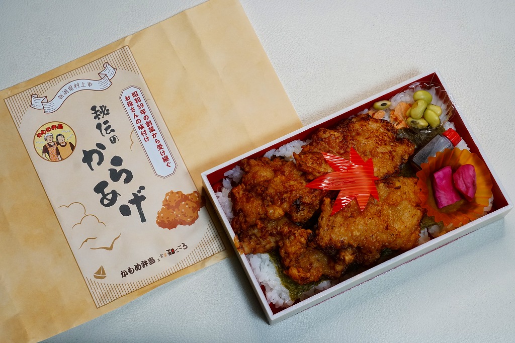 2025(令和6)年1月の京王百貨店の駅弁大会で、JR米坂線の坂町駅の駅弁として実演販売。大会での商品名は「秘伝ダレから揚げ弁当」。長方形の平たいプラ容器に白飯を敷き、海苔を貼り、たっぷりの鶏唐揚で覆い、鮭ほぐし身を少し詰め、煮豆と漬物とたれを添える。つまり前年と同じ。掛紙の絵柄を変え、「昭和59年の創業から受け継ぐお母さんの味付け」「かもめ弁当」と記し、坂町駅では売られない弁当であり、坂町駅に駅弁はない。他の駅弁催事でも実演販売をしているらしい疑義駅弁。