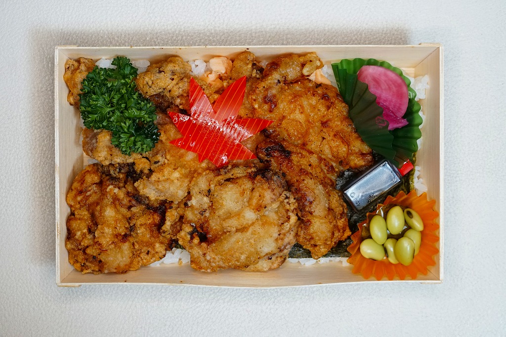 長方形の木質エコ容器に白飯を敷き、海苔を貼り、たっぷりの鶏唐揚で覆い、鮭ほぐし身を少し詰め、煮豆と漬物とたれを添える。日本全国のスーパーや惣菜・弁当店でおなじみの唐揚げ弁当を、元気にした感じ。実演販売ブースで配布したチラシによると、坂町駅から20kmくらい北で日本海に面した、羽越本線の線路と国道345号に沿う弁当店で、のりからあげ弁当(600円)を販売するという。