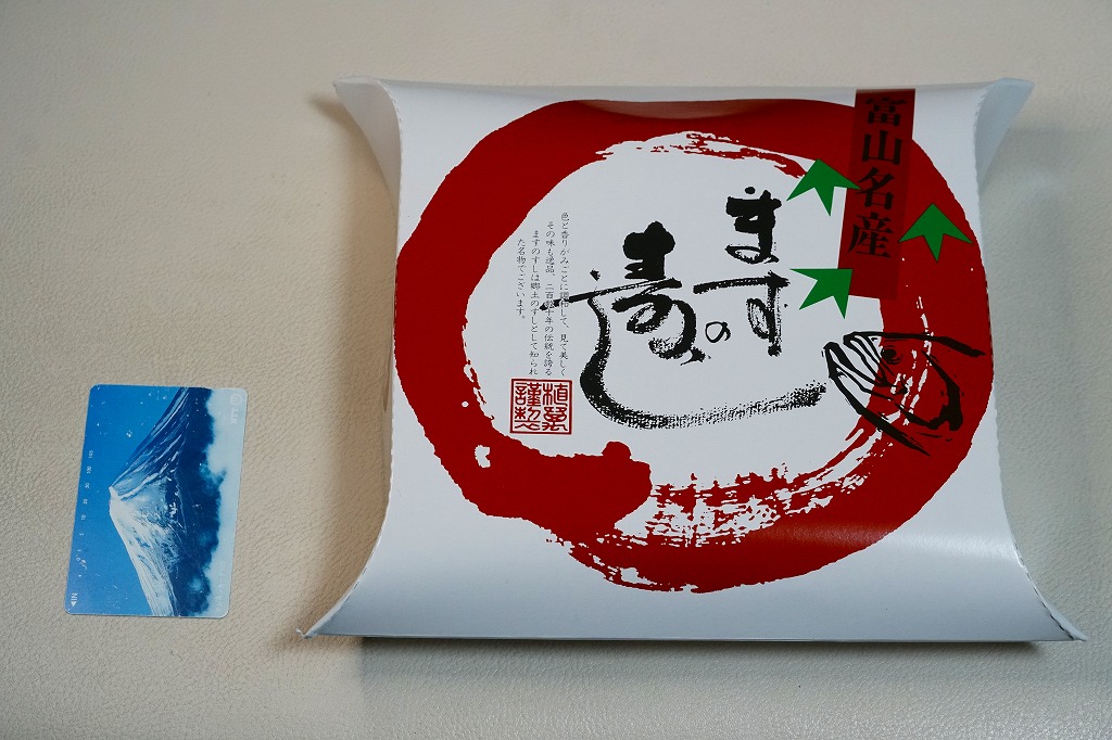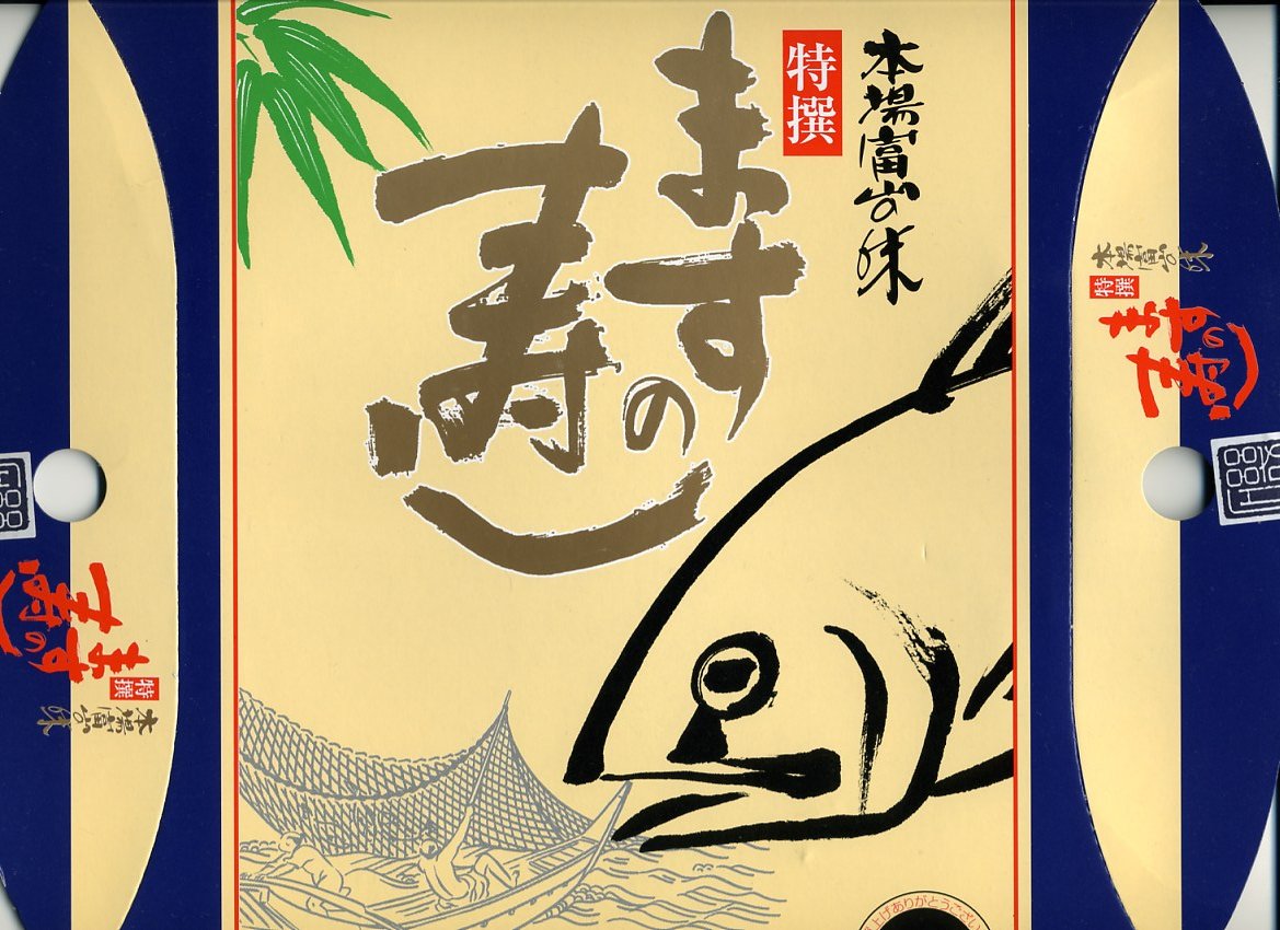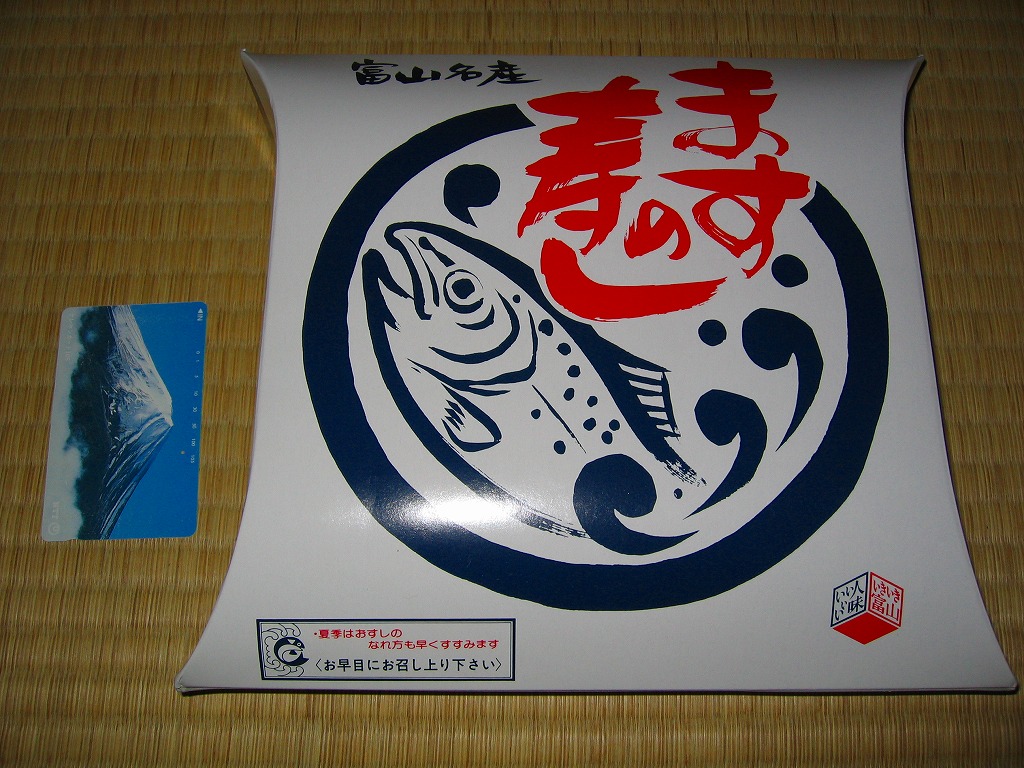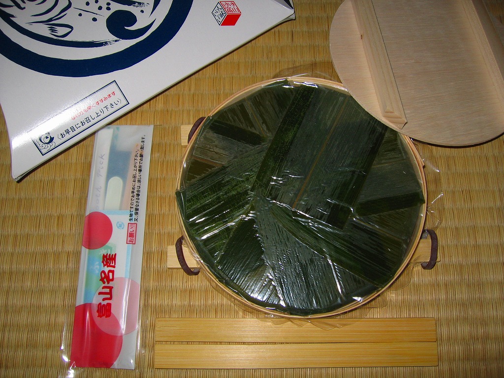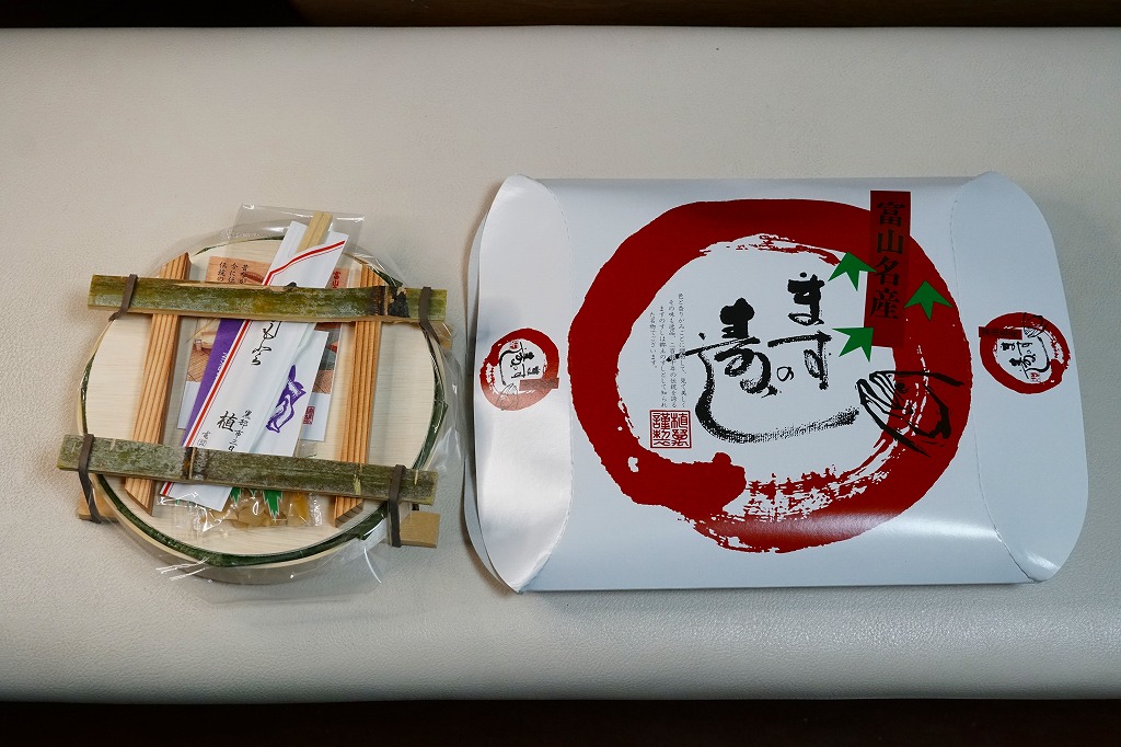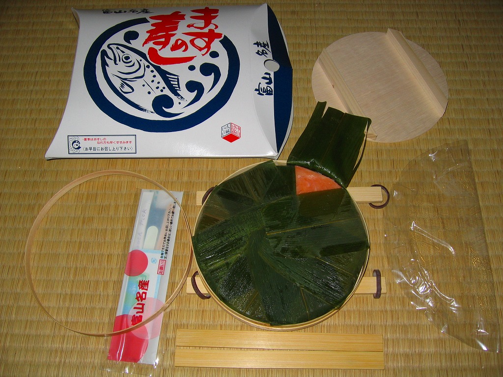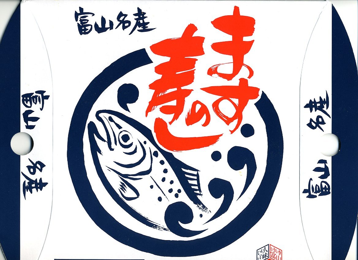 富山のマス寿司でおなじみの名前と形状のパッケージを細長くしたものに、おなじみでない四角い木製押寿司容器が収まる。中身はバッテラか押し寿司かに見えて、棒状の酢飯に身の厚いマスを180度巻いたものが、ぴったり整然と列べられていた。全体の分量はとても少なく、その割にはいい値段がするが、身の割合とサーモンばりのジューシーさはなかなか。価格は2013年の購入時で1,260円。