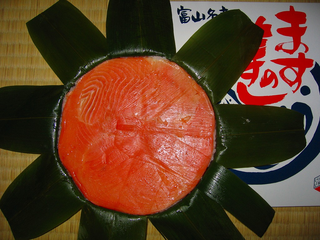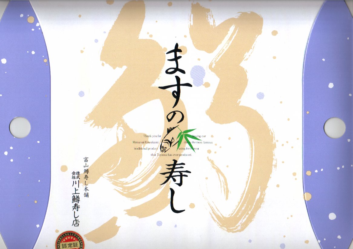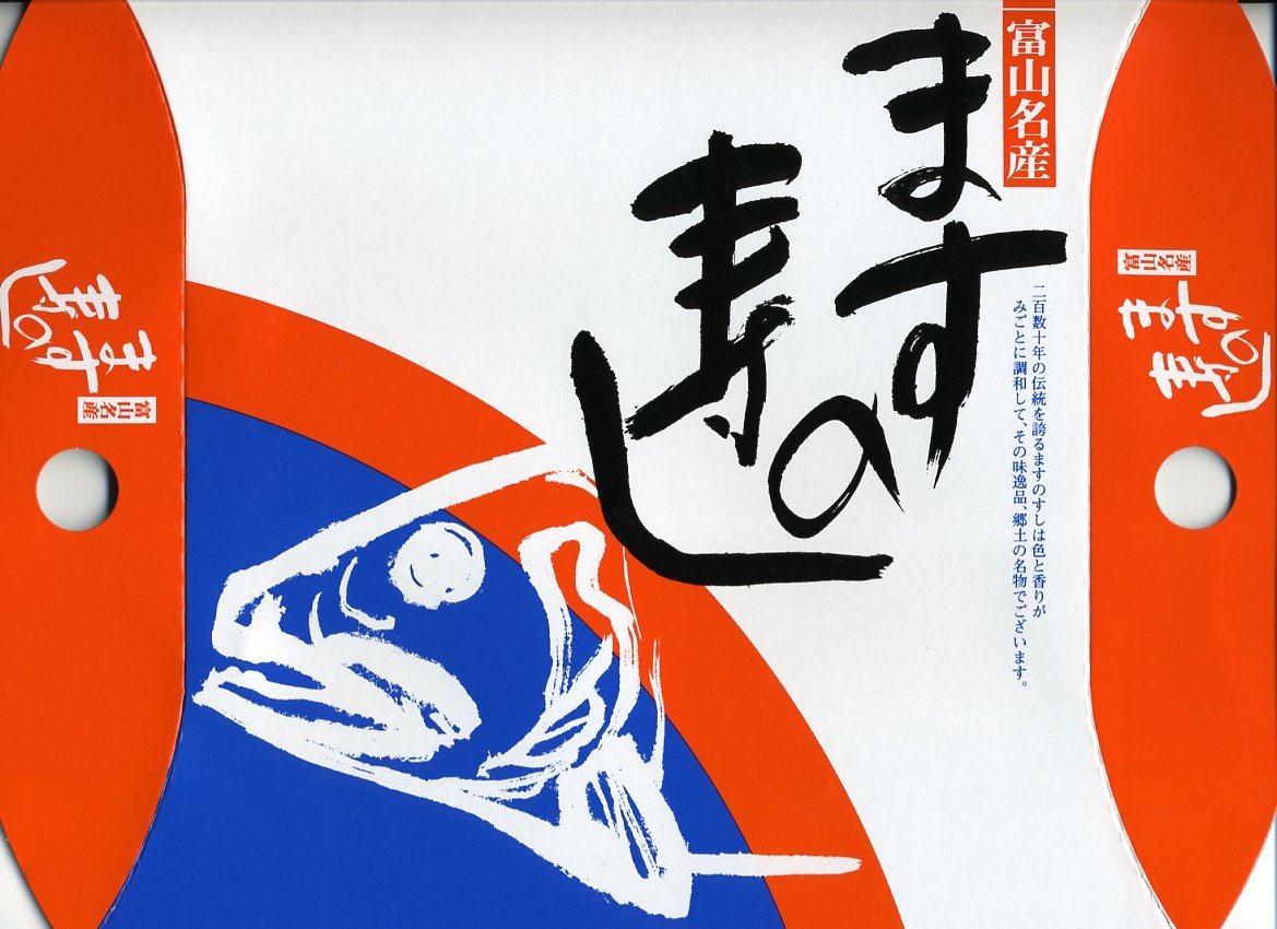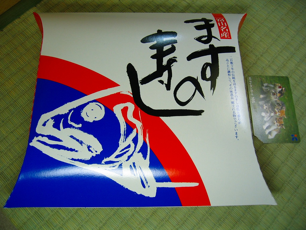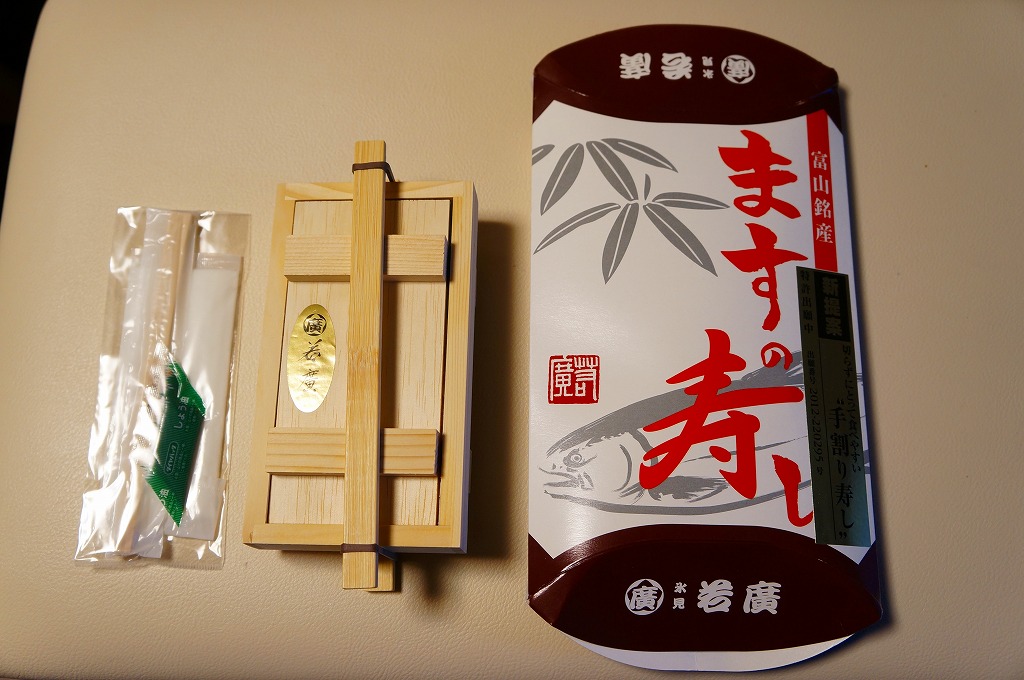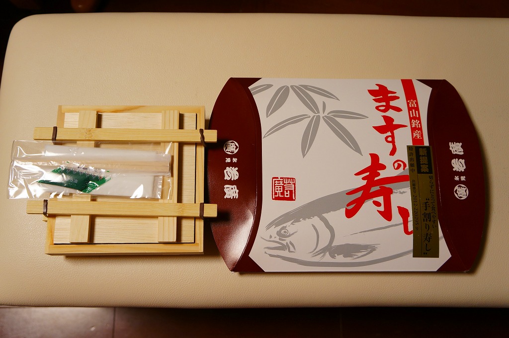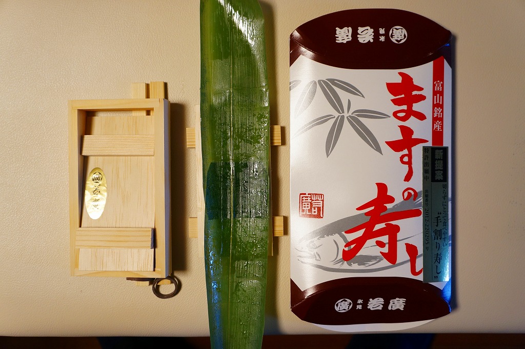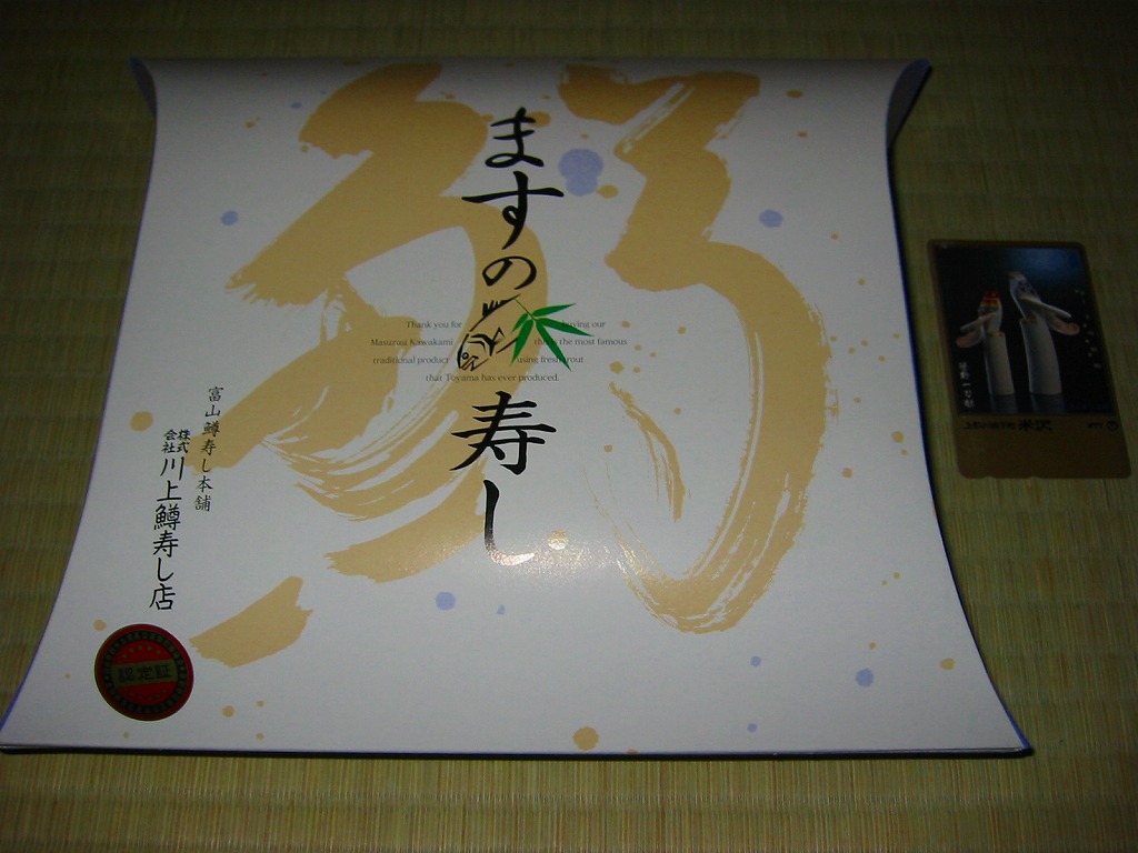 富山のマス寿司でおなじみの名前と形状のパッケージを細長くしたものに、おなじみでない四角い木製押寿司容器が収まる。中身はバッテラか押し寿司かに見えて、棒状の酢飯に身の厚いマスを180度巻いたものが、ぴったり整然と列べられていた。全体の分量はとても少なく、その割にはいい値段がするが、身の割合とサーモンばりのジューシーさはなかなか。価格は2013年の購入時で1,260円。