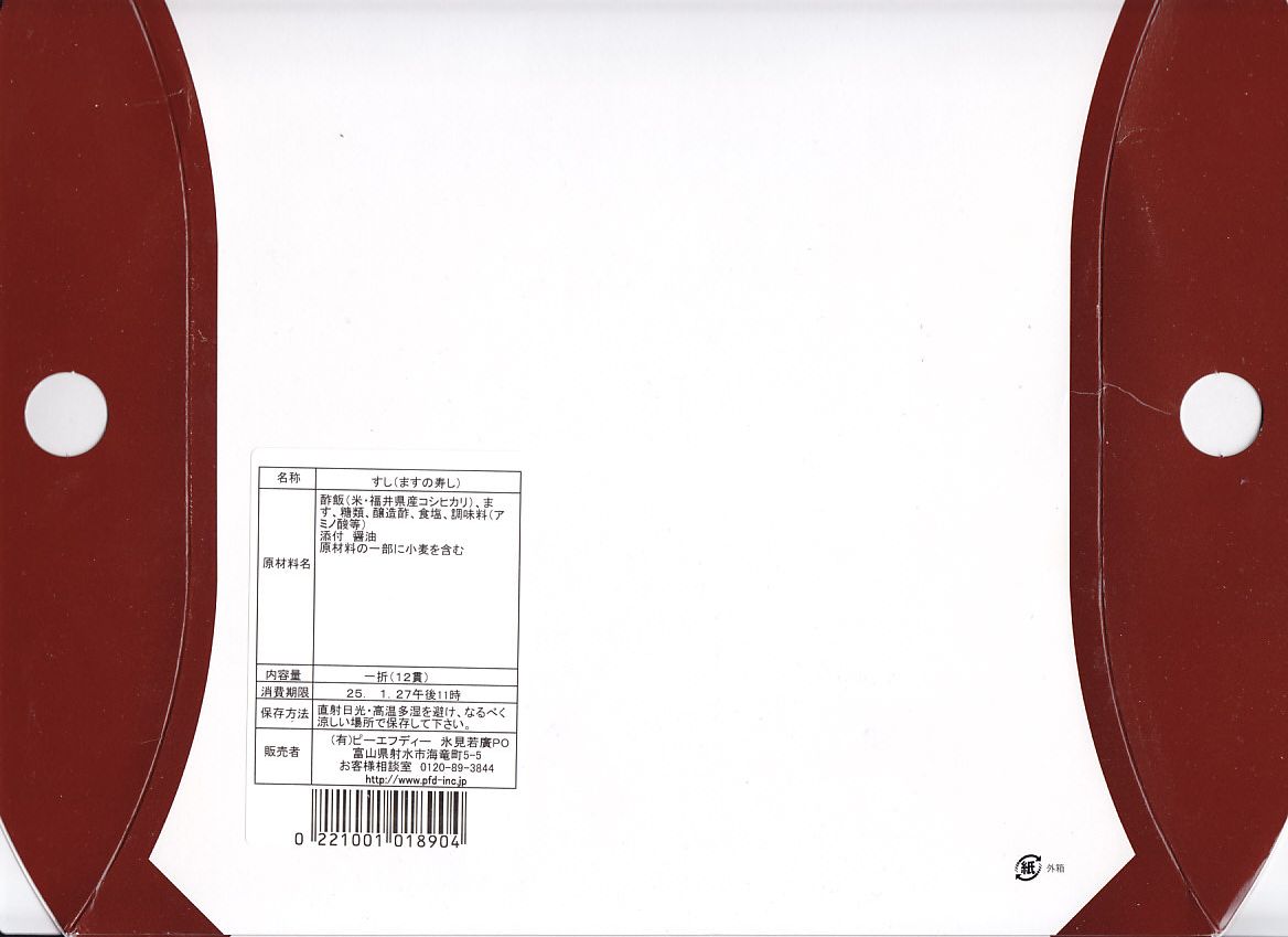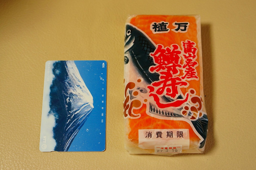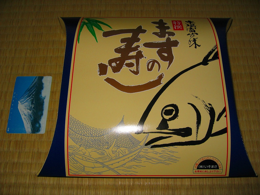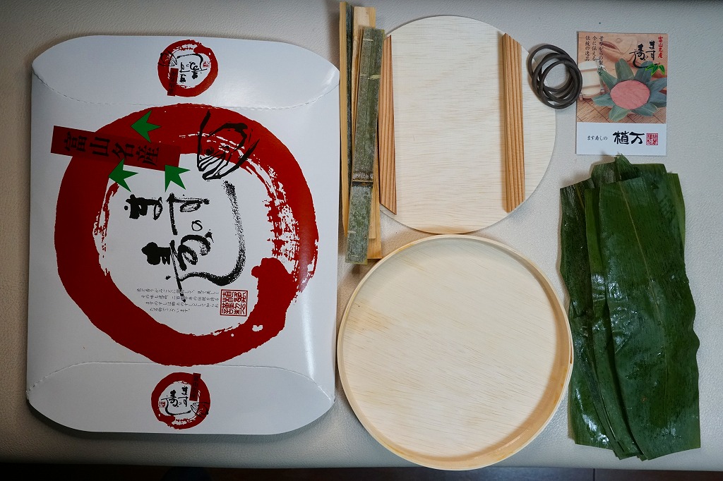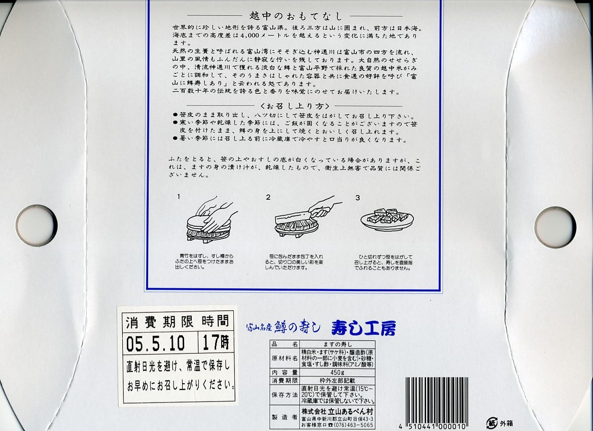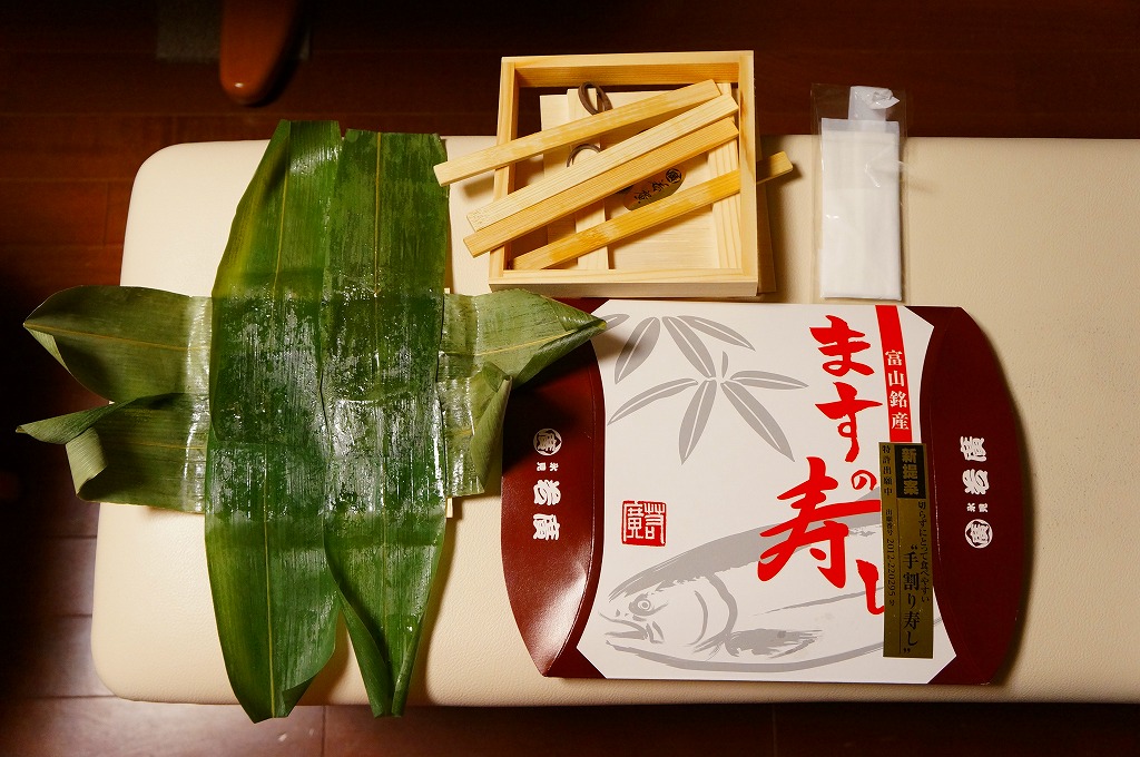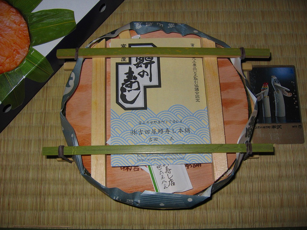 富山のマス寿司でおなじみの名前と形状のパッケージを細長くしたものに、おなじみでない四角い木製押寿司容器が収まる。中身はバッテラか押し寿司かに見えて、棒状の酢飯に身の厚いマスを180度巻いたものが、ぴったり整然と列べられていた。全体の分量はとても少なく、その割にはいい値段がするが、身の割合とサーモンばりのジューシーさはなかなか。価格は2013年の購入時で1,260円。