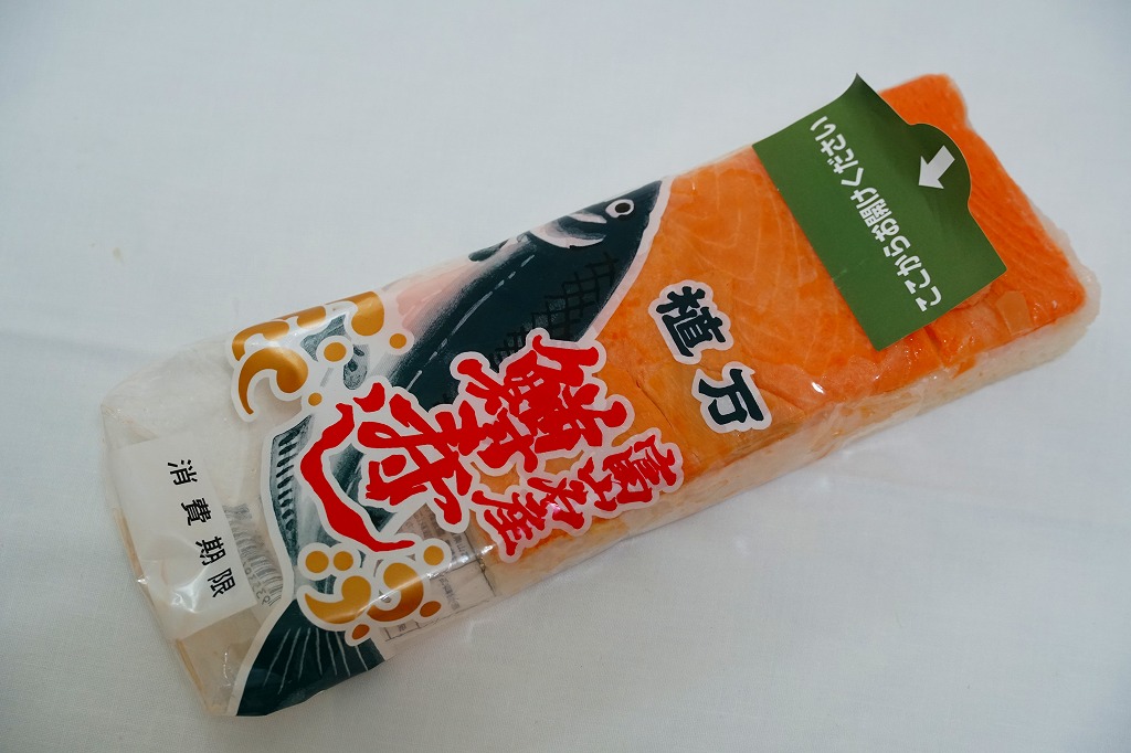 富山県内の駅売店などで買える、普通の形でないマス寿司。調製元が「かまぼこ型」と表現する、小銭入れくらいの大きさの板がひとつ、商品名などを記した透明なフィルムに直接包まれる。近年は東京のコンビニでもおにぎりサイズのマス寿司を買えるようになったが、そんな機能を持つ商品。腹の足しにされるよう、マスが薄めで酢飯が多めになっているようなことも、公式に紹介されている。価格は2015年の購入時で390円、2019年時点で420円、2023年時点で450円、2024年時点で480円、2025年時点で520円。