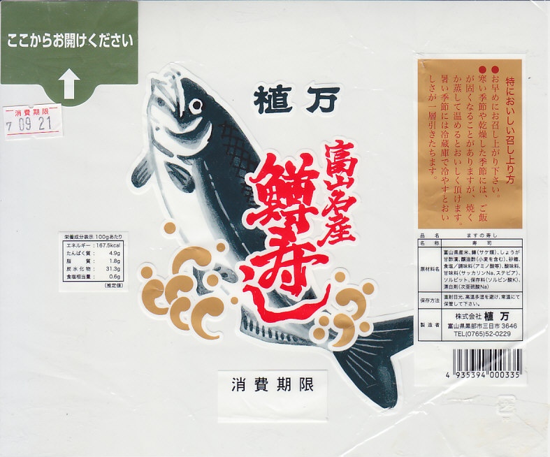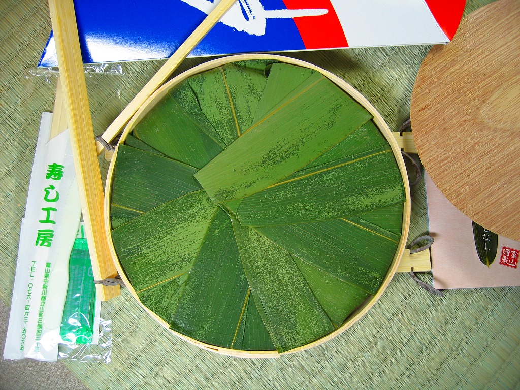 駅弁屋でない業者さんが作る、富山名物ますのすし。パッケージは他と異なり上方だけが開く縦型、細めの竹が輪ゴムでふたを押す容器の基本構造は他と同じで、中身は鱒が底に敷かれる反転型。味はかなり脂豊かな、または脂っぽい感じで、価格は珍しく横一線でない、2004年の購入時で1,260円。添付のしおりと笹の上のビニールで食べ方を念押しする。
