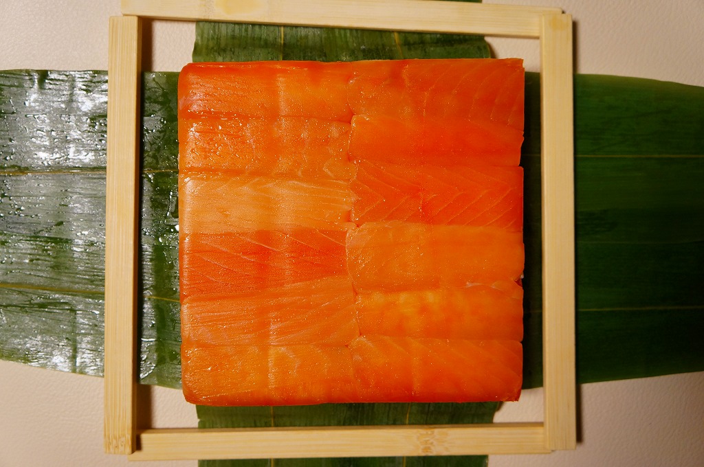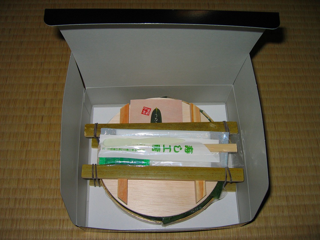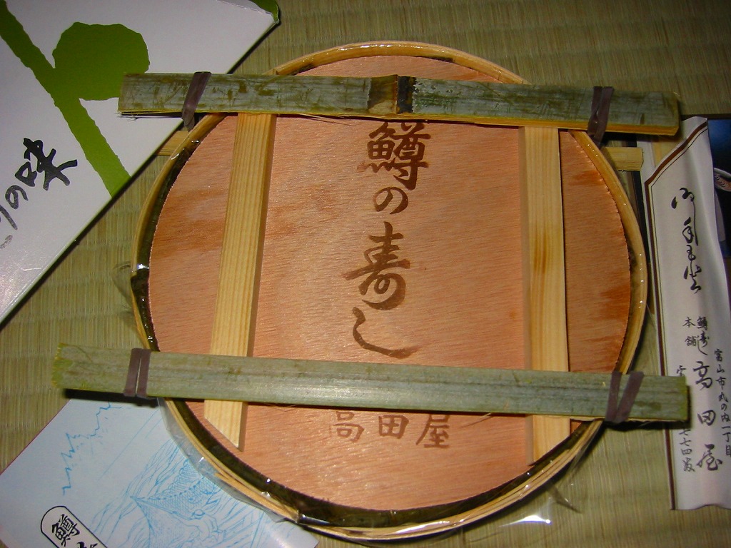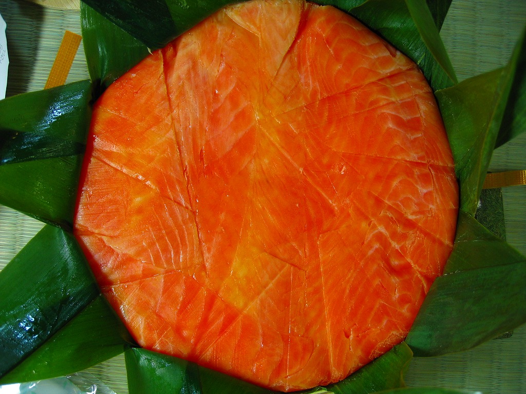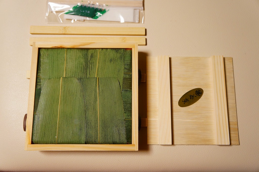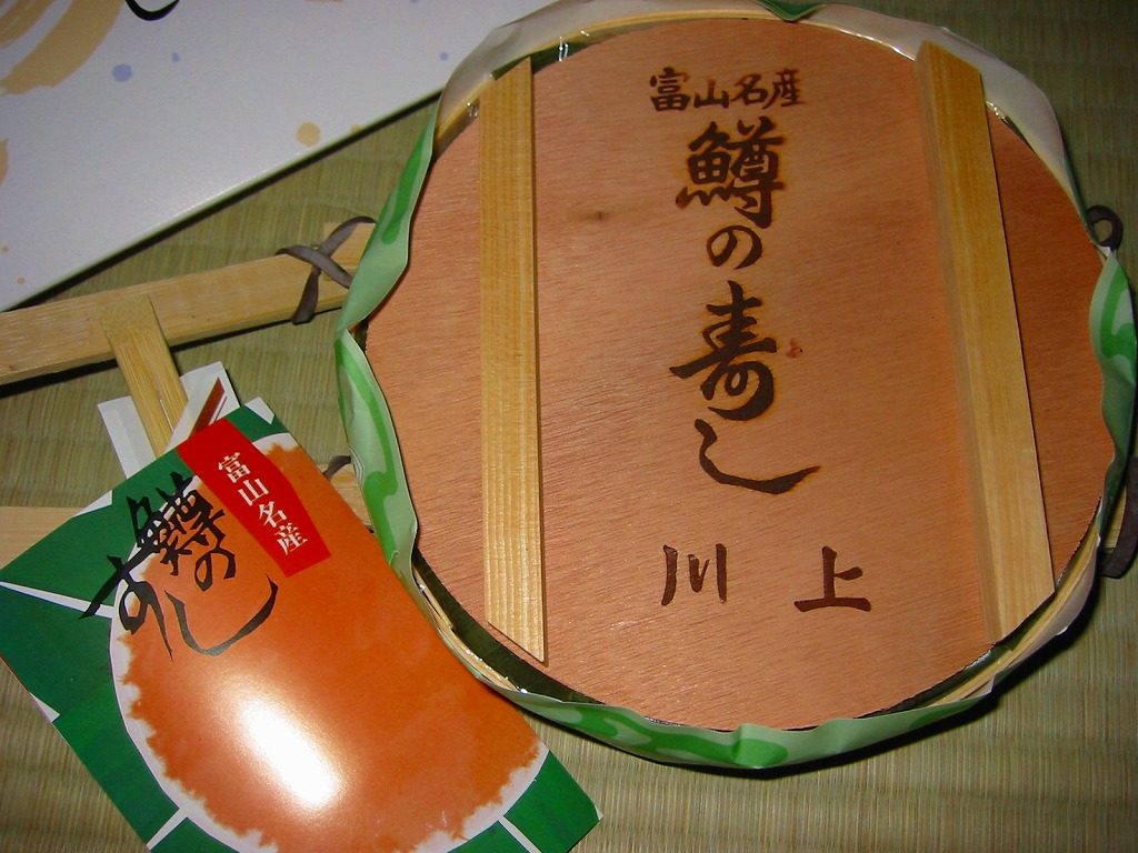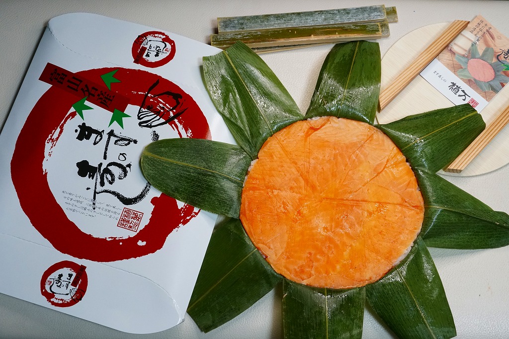 富山のマス寿司でおなじみの名前と形状のパッケージに、おなじみでない四角い木製押寿司容器が収まる。中身は単に四角いマス寿司に見えて、棒状の酢飯に身の厚いマスを180度巻いたものが、ぴったり整然と列べられていた。全体の分量は少ないが、身の割合とサーモンばりのジューシーさはなかなか。価格は2013年の購入時で1,890円。