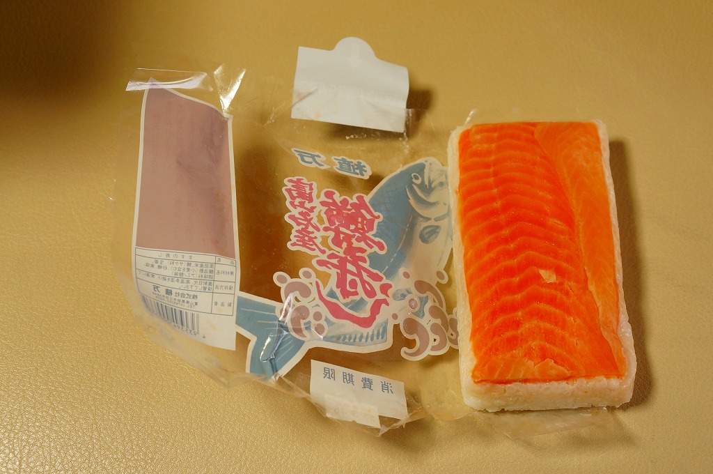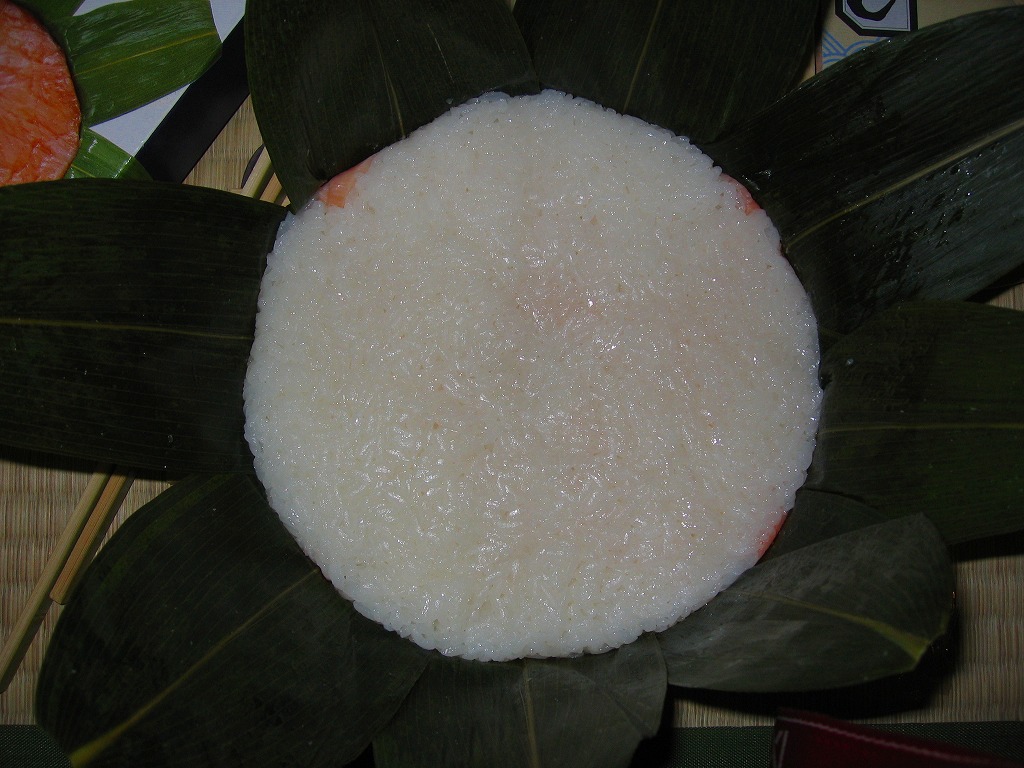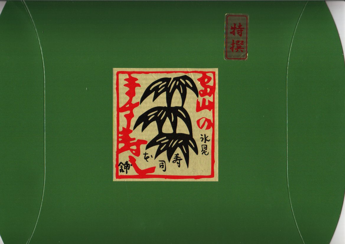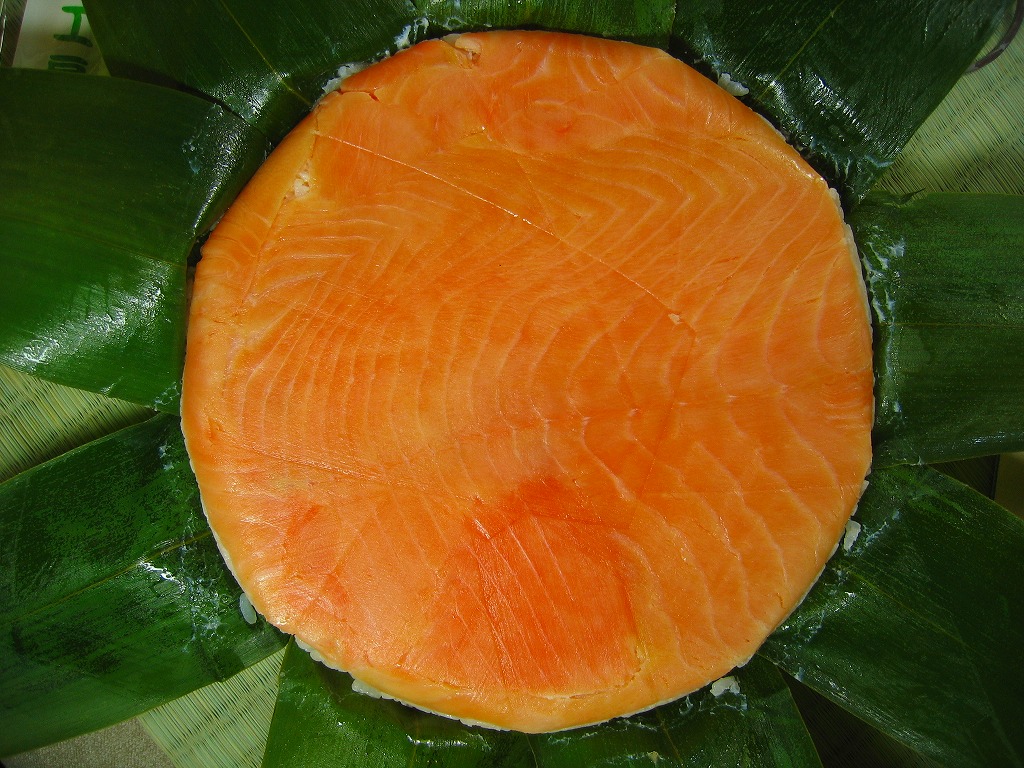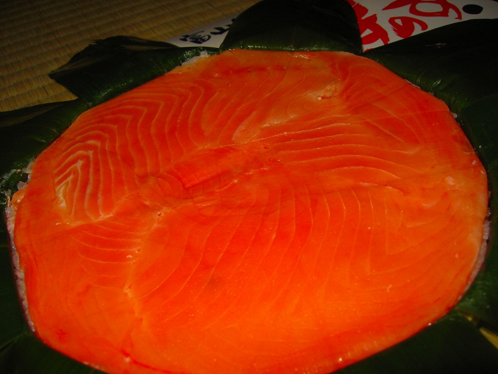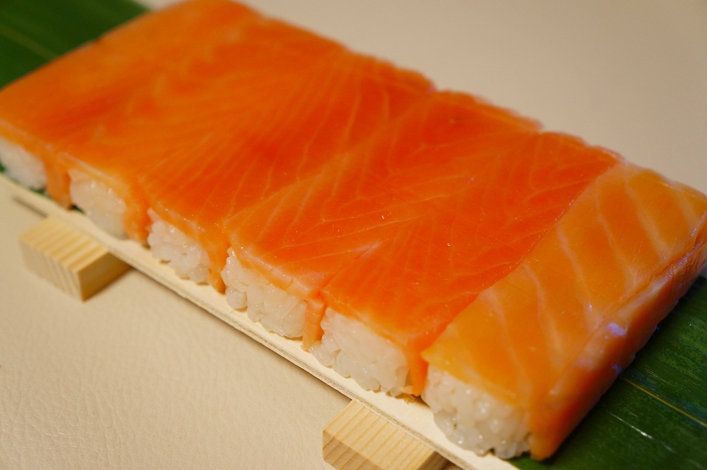 富山のマス寿司でおなじみの名前と形状のパッケージに、おなじみでない四角い木製押寿司容器が収まる。中身は単に四角いマス寿司に見えて、棒状の酢飯に身の厚いマスを180度巻いたものが、ぴったり整然と列べられていた。全体の分量は少ないが、身の割合とサーモンばりのジューシーさはなかなか。価格は2013年の購入時で1,890円。