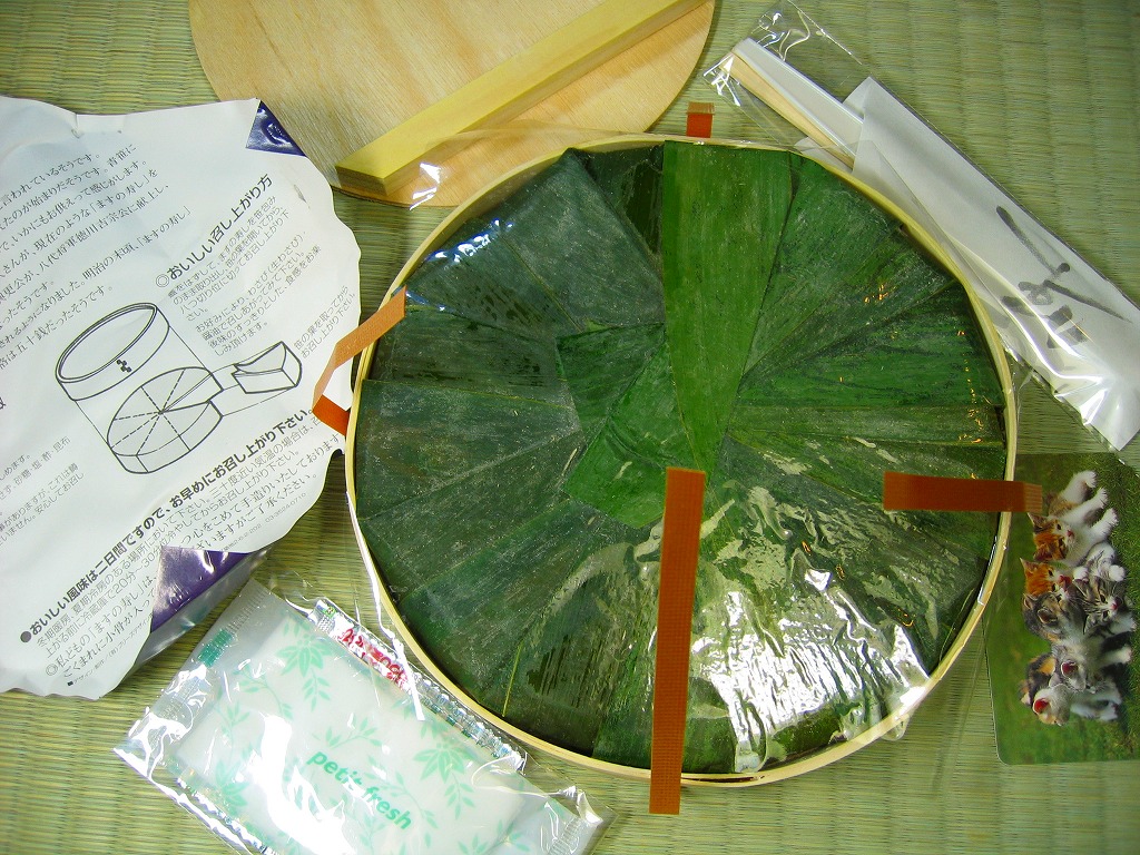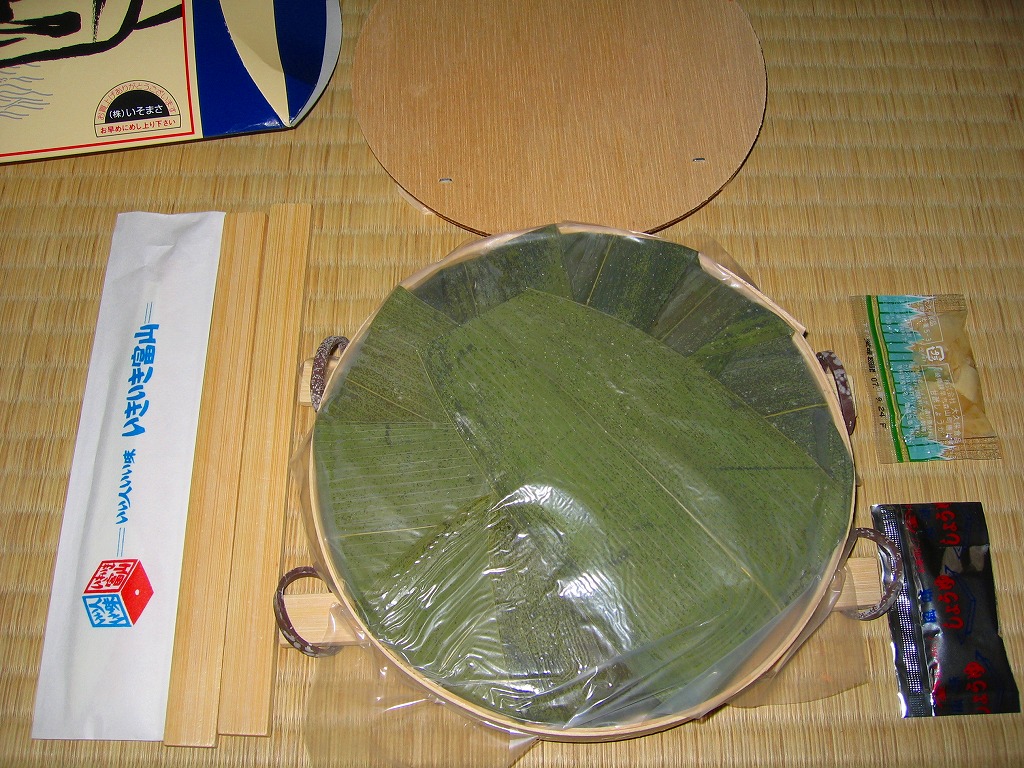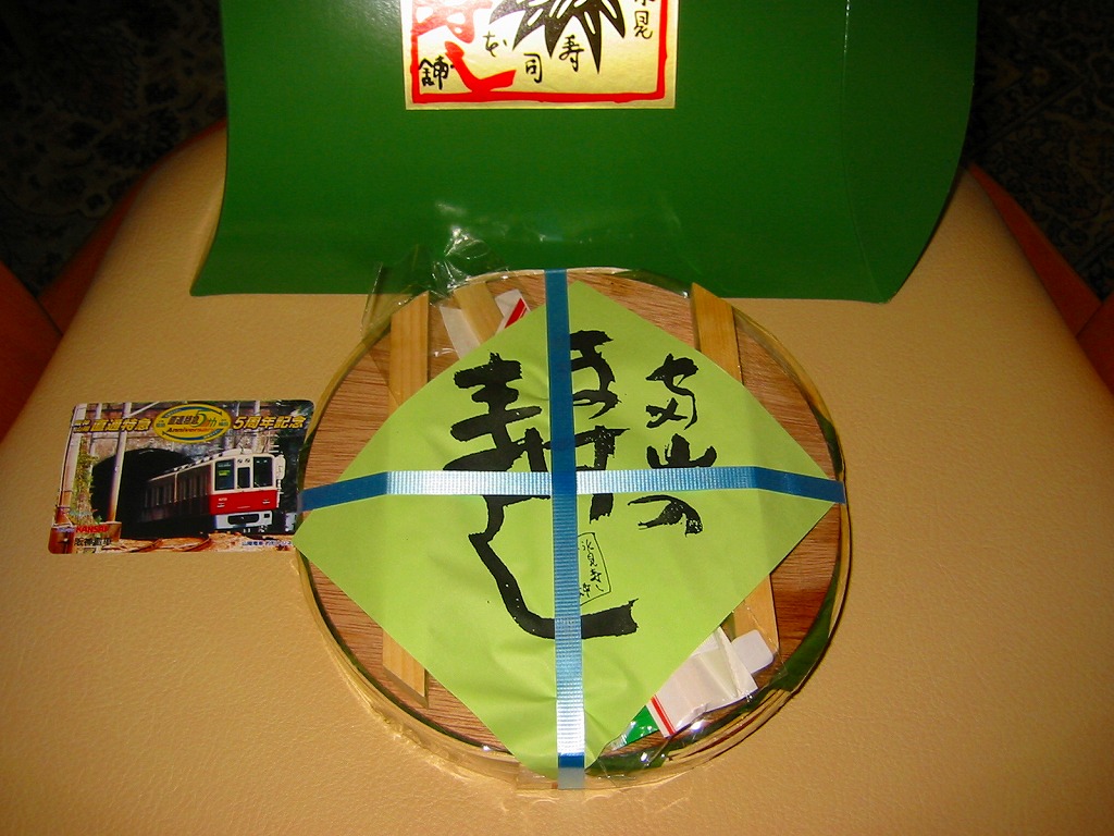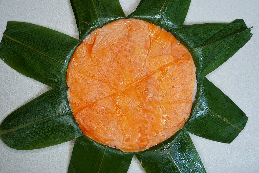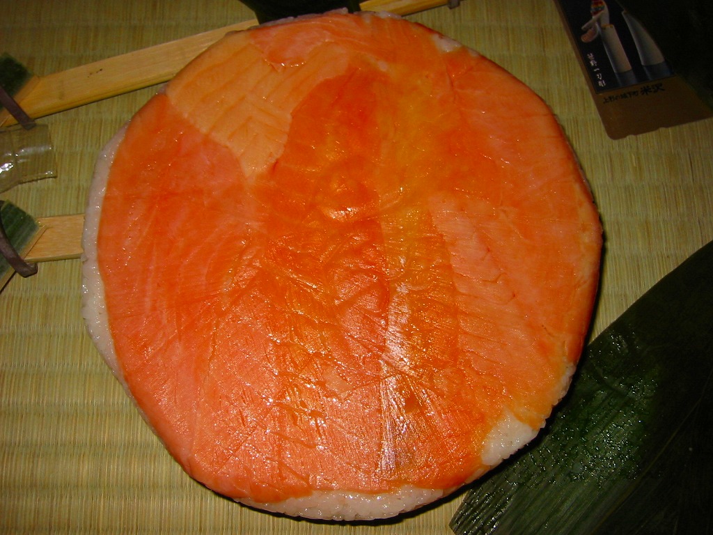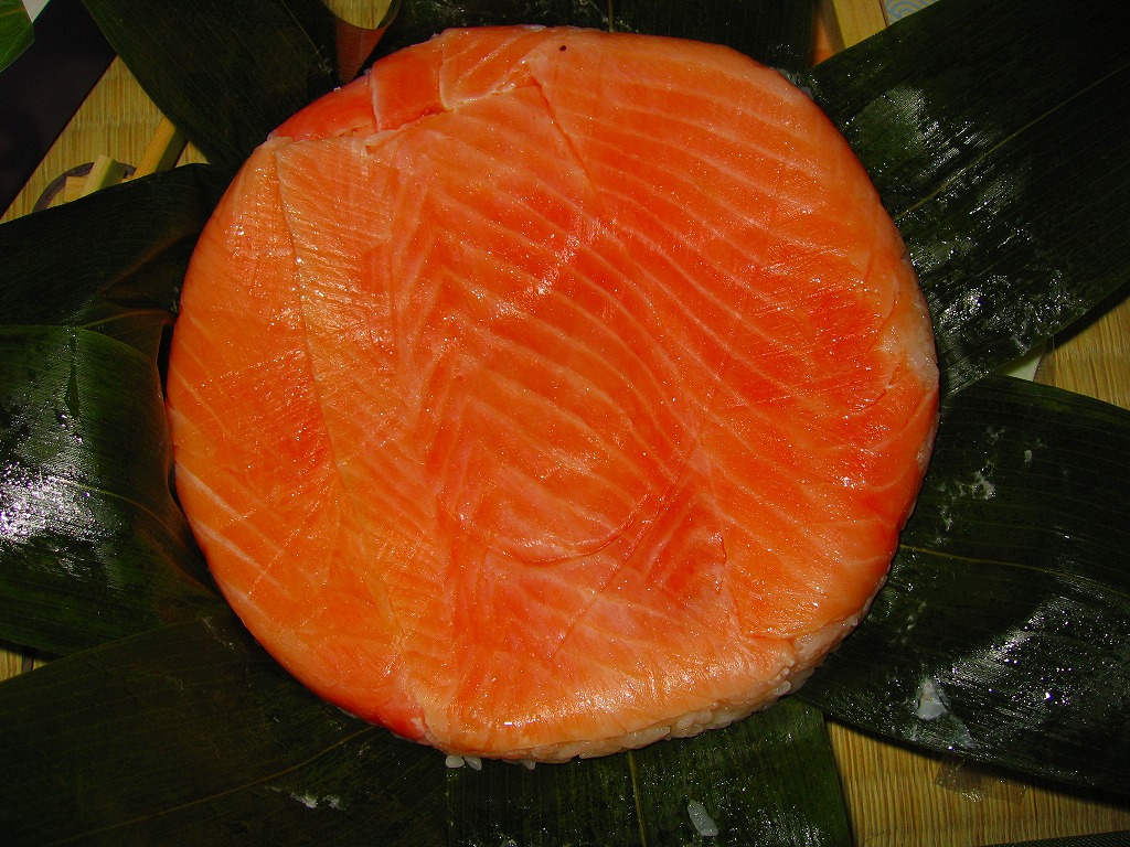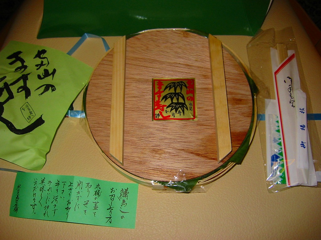 富山のマス寿司でおなじみの名前と形状のパッケージに、おなじみでない四角い木製押寿司容器が収まる。中身は単に四角いマス寿司に見えて、棒状の酢飯に身の厚いマスを180度巻いたものが、ぴったり整然と列べられていた。全体の分量は少ないが、身の割合とサーモンばりのジューシーさはなかなか。価格は2013年の購入時で1,890円。