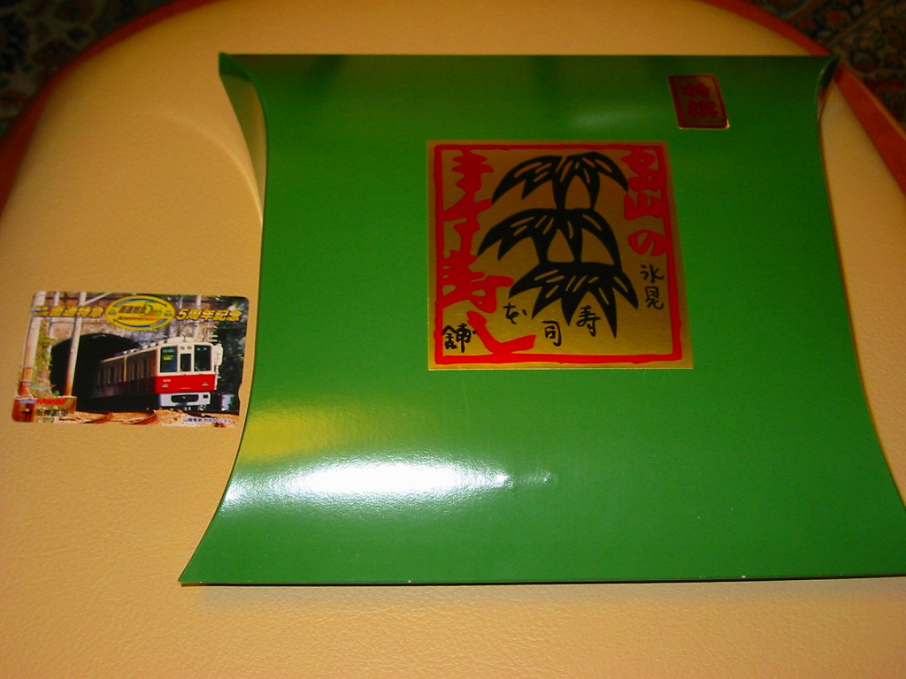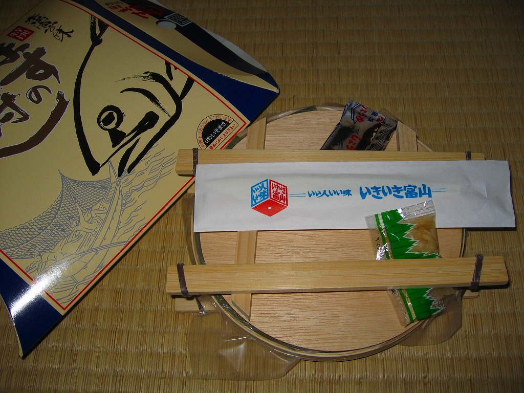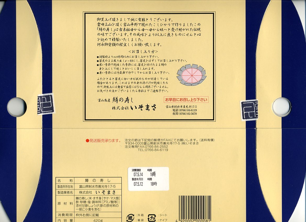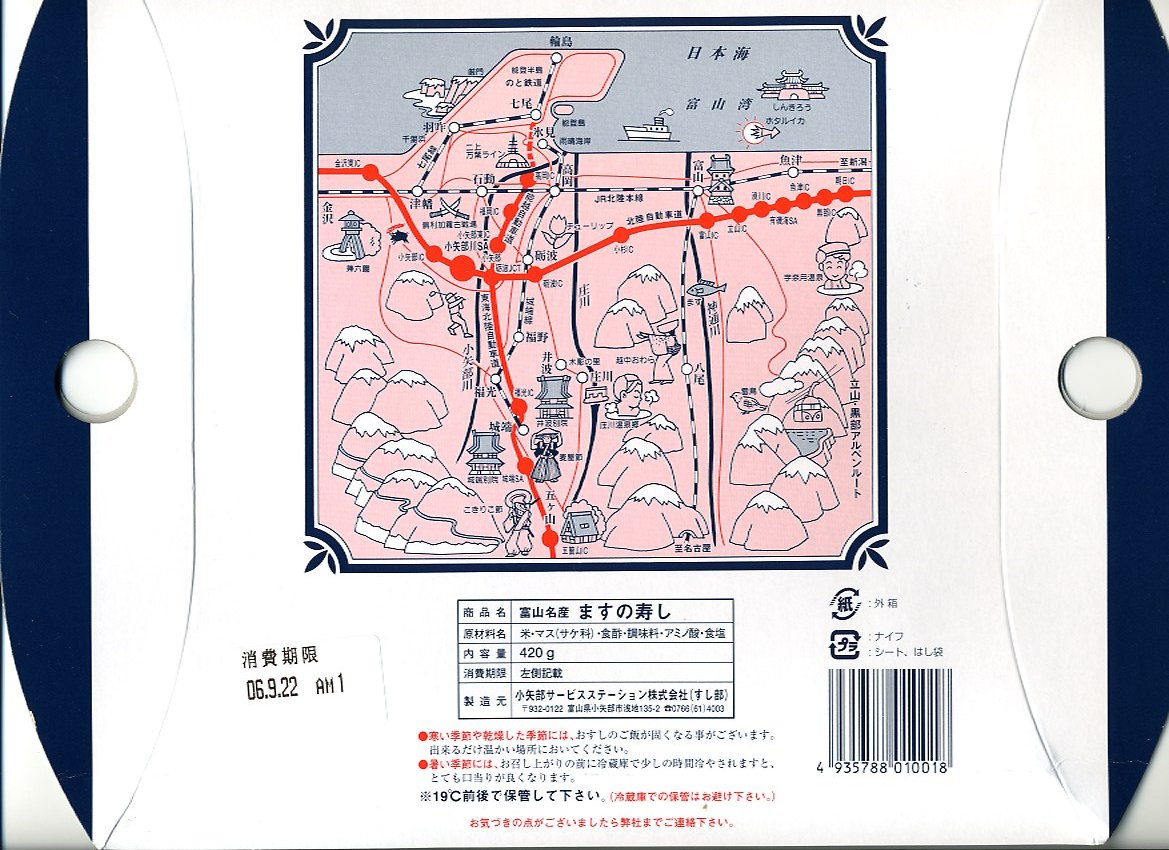 駅弁屋でない業者さんが作る富山名物ますのすしで、今回はなぜか中央自動車道の、しかも東京都に入った石川パーキングエリアで販売されていたもの。外観や容器の構造、中身やその見栄えや風味は、駅弁その他の富山名物ますのすしと、何ら変わることがない。パッケージ裏面の略地図は高速道路をしっかり描き、一方で鉄道はいい加減なので、高速道路のサービスエリアやパーキングエリアで販売するための商品か。富山名物ますのすし収集は、まだまだ続く。価格は2006年の購入時で1,100円。