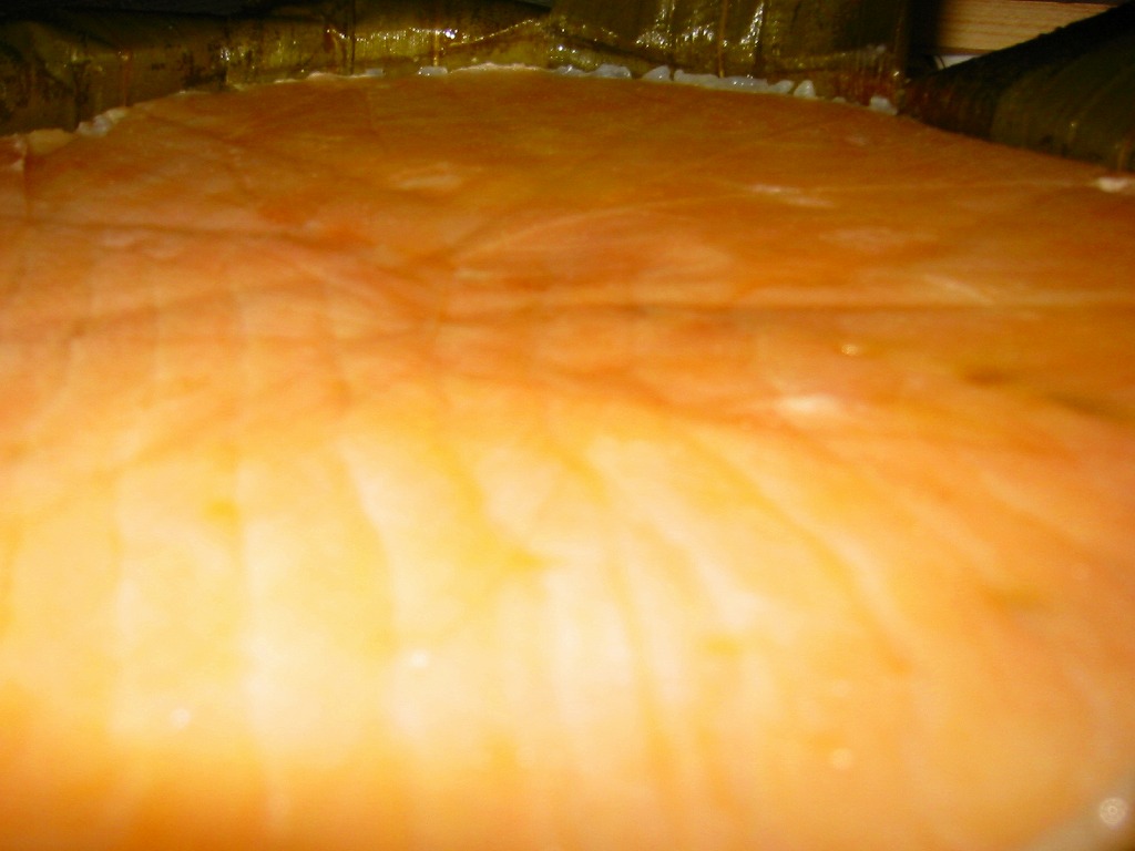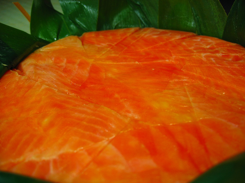 駅弁屋でない業者さんが作る、富山名物ますのすし。高島屋横浜店での北陸物産展で入手した。価格から判断して駅弁の「特選ますのすし」に該当する商品のようで、ピンク色というより朱色に近い鮮やかなノルウェー産サーモントラウトの身が印象的だった。味も駅弁と同等。笹色単色のパッケージに金色のシールという容姿も映える。価格は2003年の購入時で1,500円。