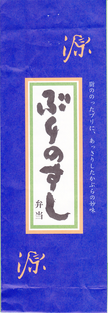 上記の駅弁「ぶりのすし小箱」の、2003(平成15)年時点での姿。名前が「ぶりのすし弁当」であり、紙箱でなく紙袋に詰めていた。