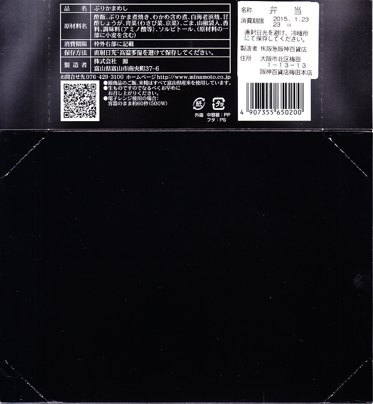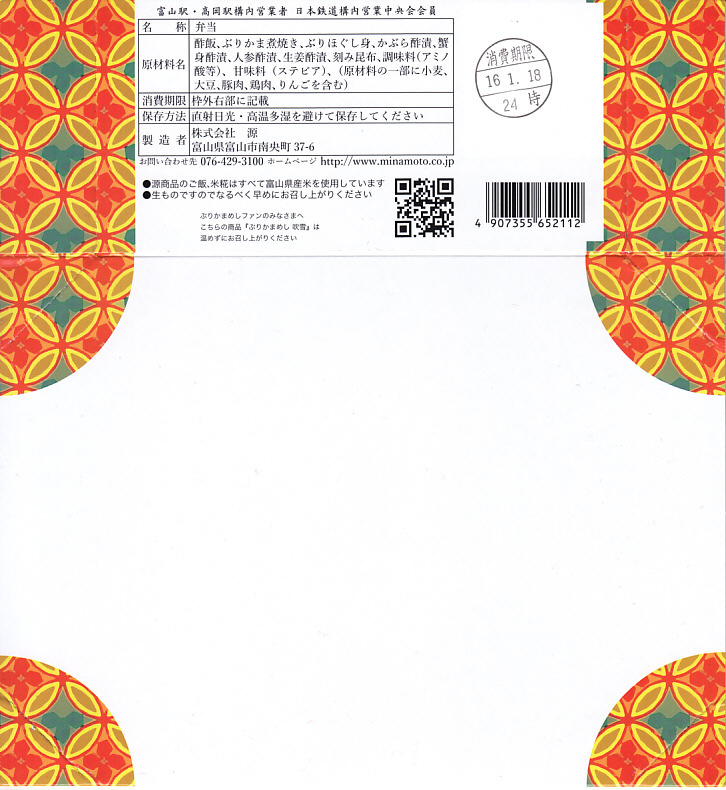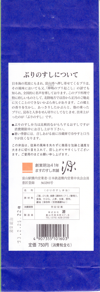 2015(平成27)年1月23日の調製と思われる、富山駅弁のスリーブ。阪神百貨店の駅弁大会で販売されたもの。絵柄は上記のものと同じ。