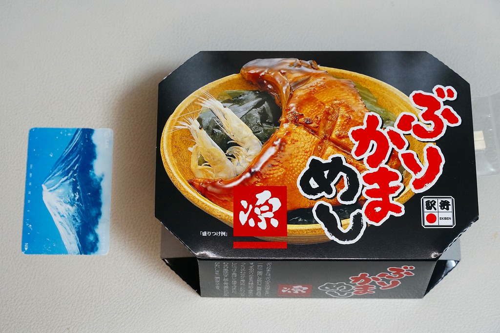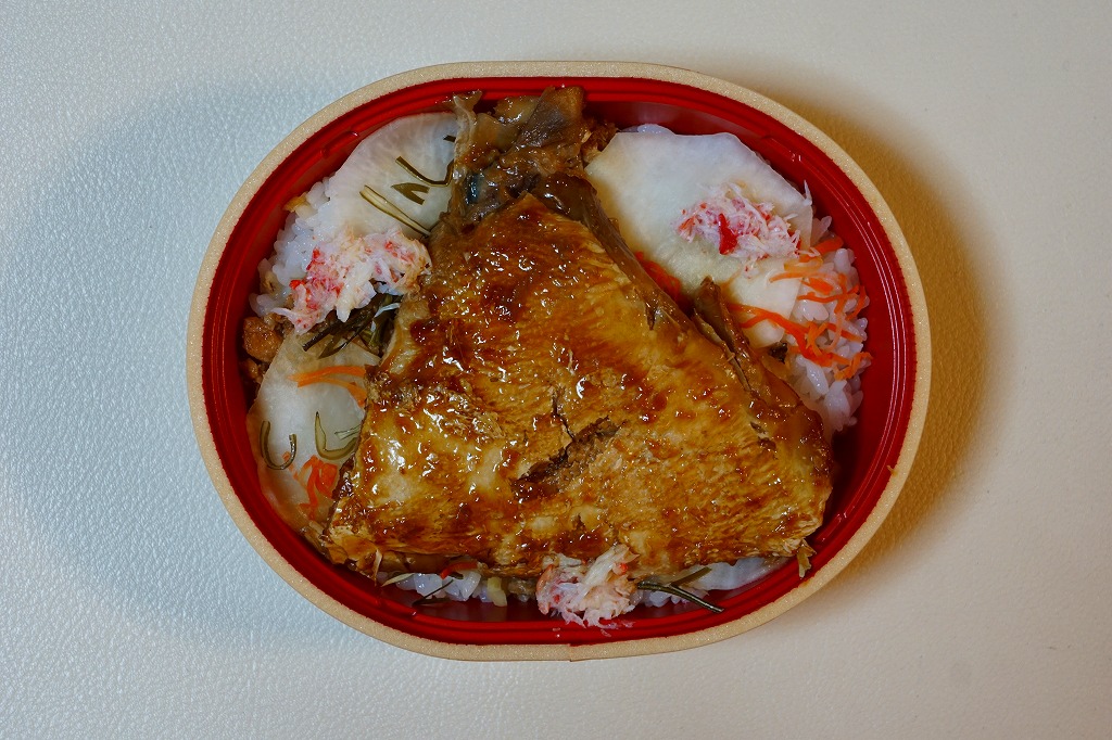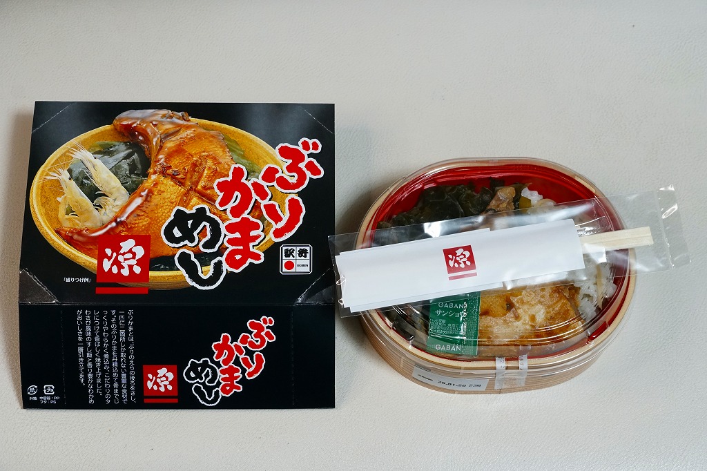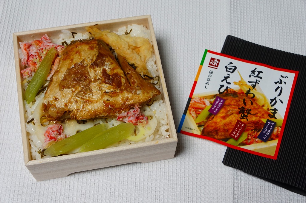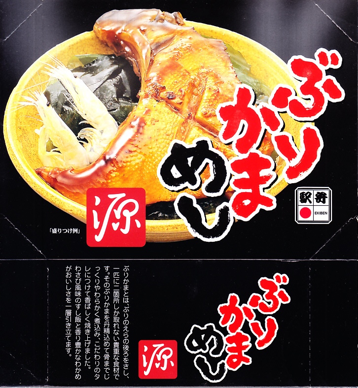 2004(平成16)年11月17日に、翌年3月までの期間限定で登場、後に11月下旬から3月中旬までの冬季限定駅弁として、販売を継続中。高さのある楕円形の容器に透明なふたをかけて、中身の写真を載せたボール紙のパッケージにはめる。中身は、わさび風味の酢飯を薄く敷き、その上にワカメや白エビや生姜などとともに、ブリ一尾でふたつだけ取れるカマを、煮込んでタレに付けて載せる。
