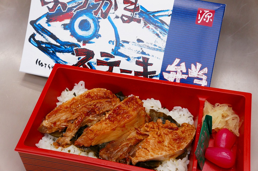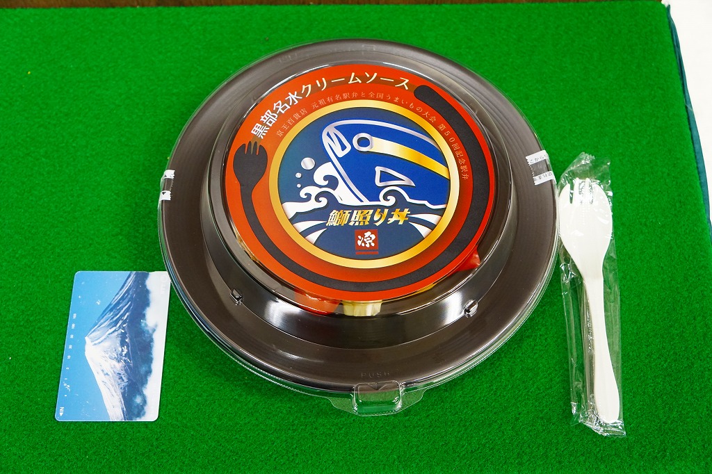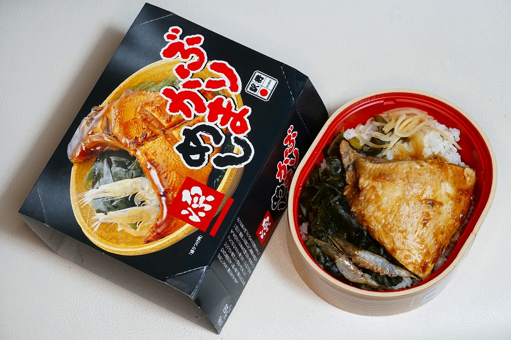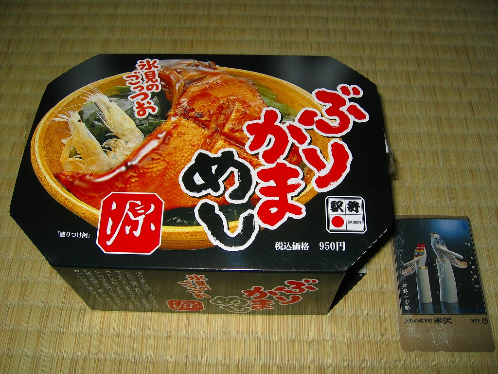 2004(平成16)年11月17日に、翌年3月までの期間限定で登場、後に11月下旬から3月中旬までの冬季限定駅弁として、販売を継続中。高さのある楕円形の容器に透明なふたをかけて、中身の写真を載せたボール紙のパッケージにはめる。中身は、わさび風味の酢飯を薄く敷き、その上にワカメや白エビや生姜などとともに、ブリ一尾でふたつだけ取れるカマを、煮込んでタレに付けて載せる。