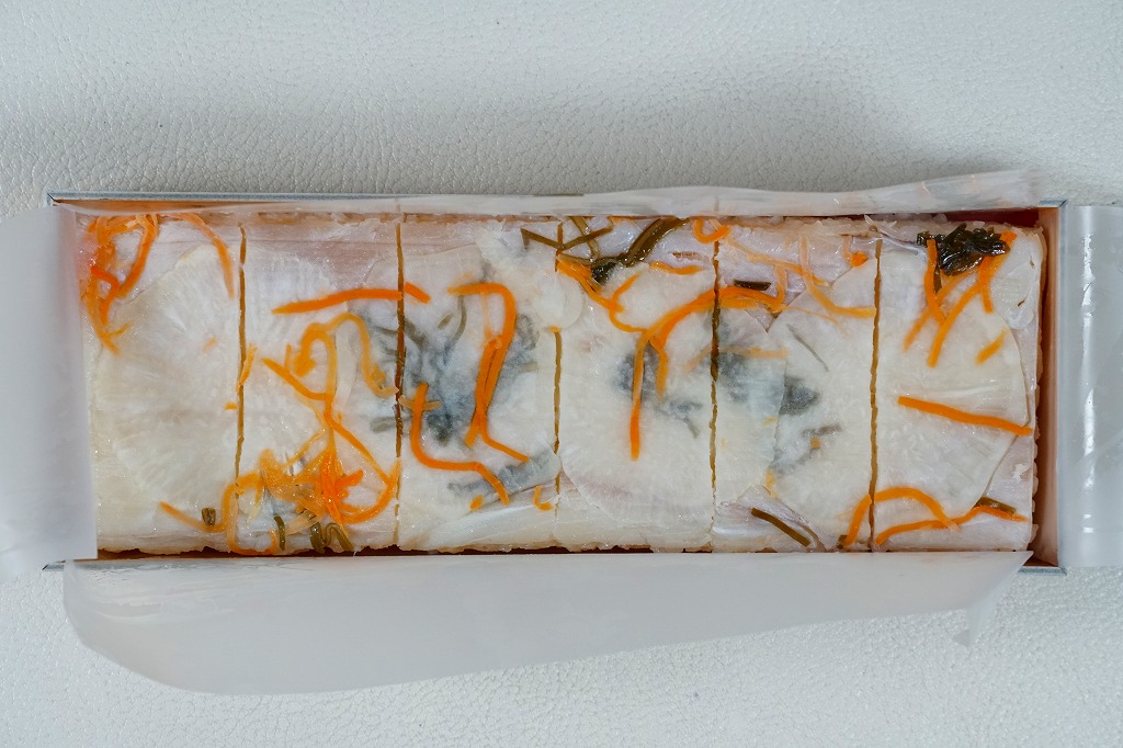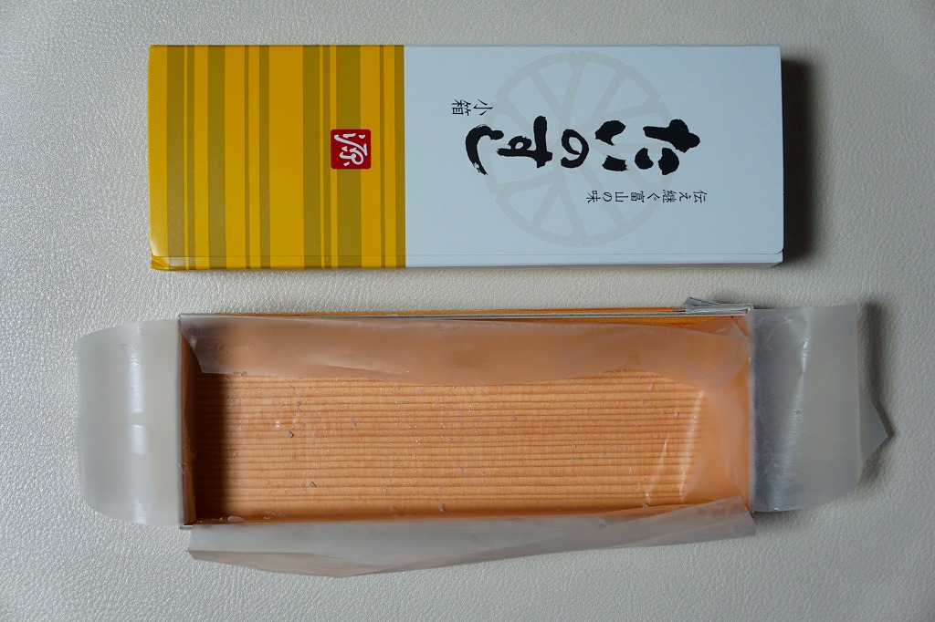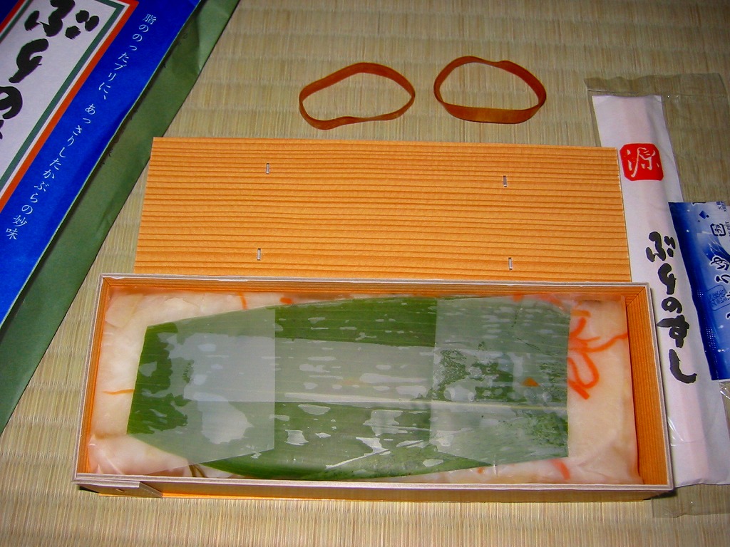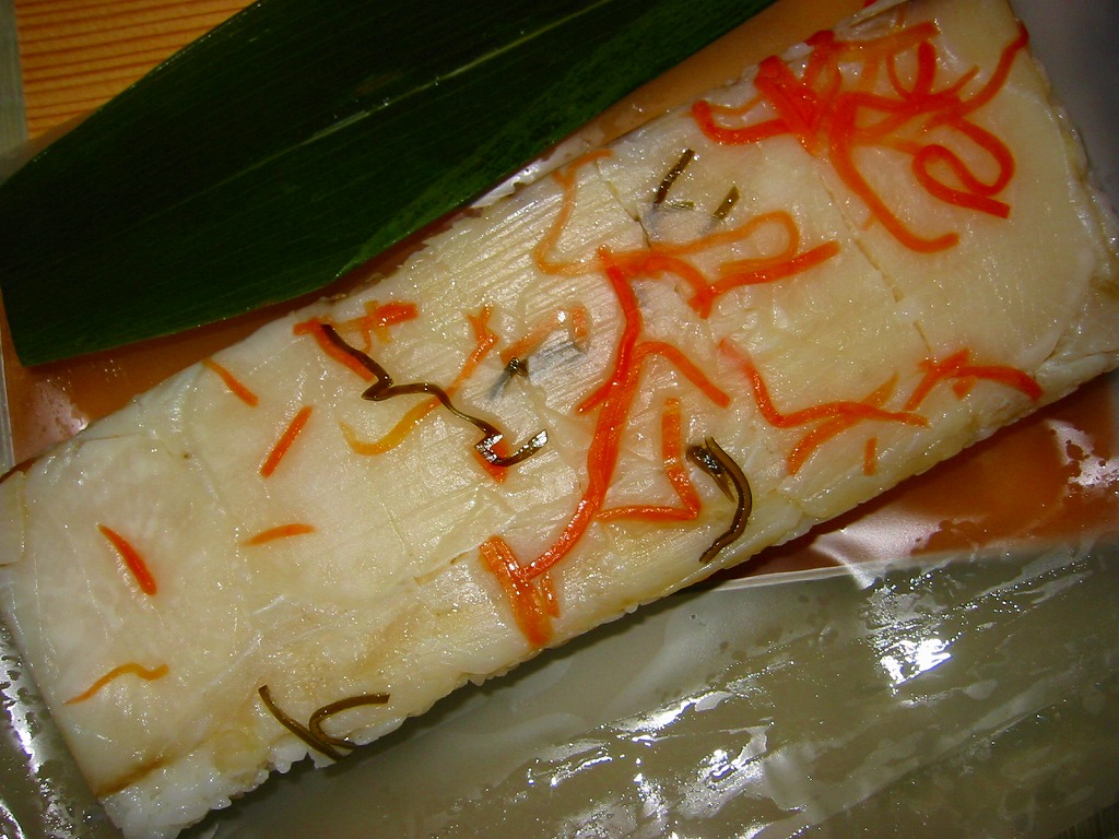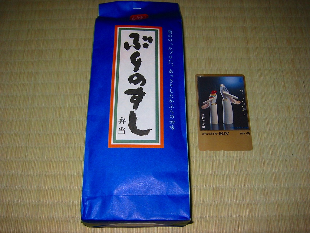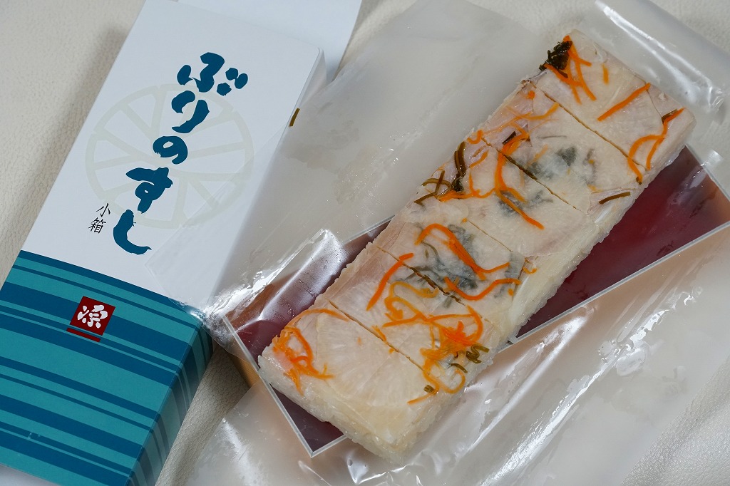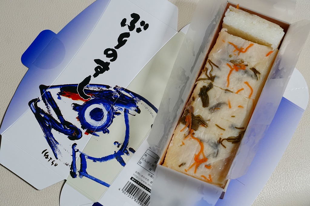 1957(昭和32)年の発売。富山で「ますのすし」より通に好まれる名物。中身はつまり「ますのすし」のマスを、ブリとかぶらと人参と昆布に置き換えたもので、北陸の郷土料理「かぶらずし」をヒントに考案されたらしい。個人的にはかぶらの大根のようなカブのような臭いと酸味がブリの風味を消しているように感じるが、そんなところも通好みといったところだろう。