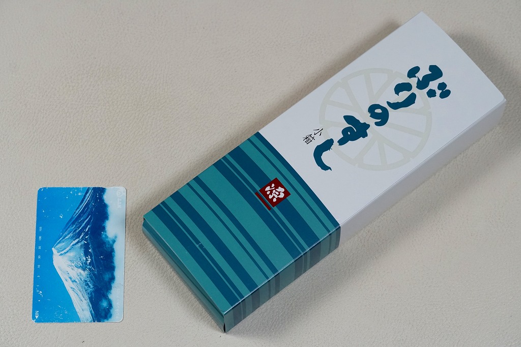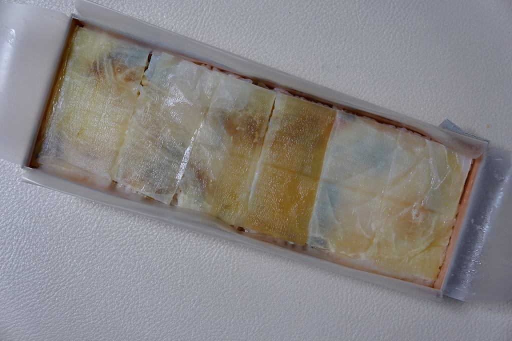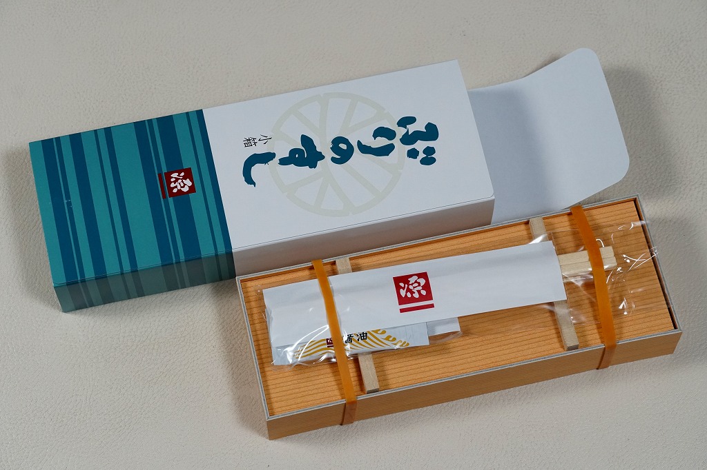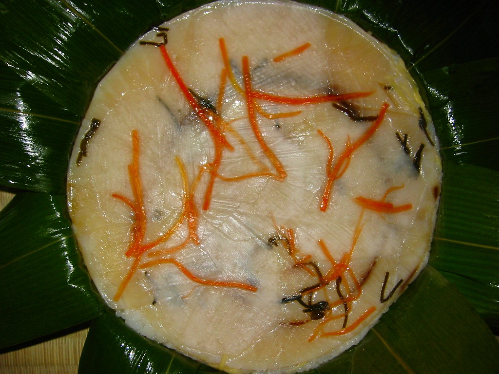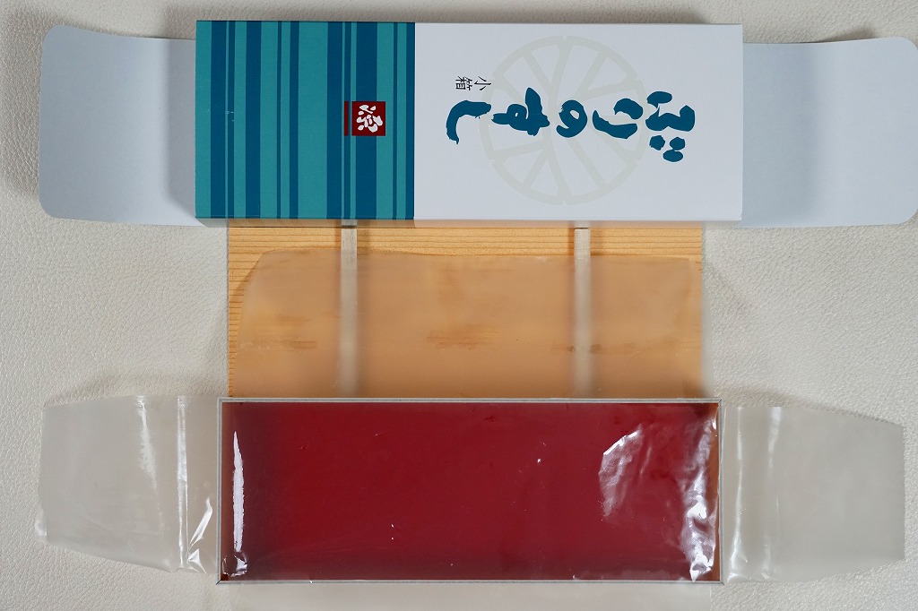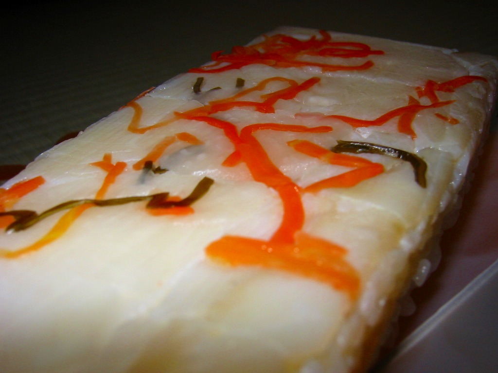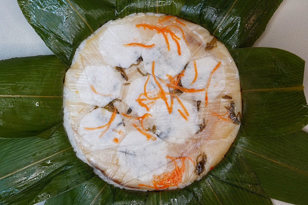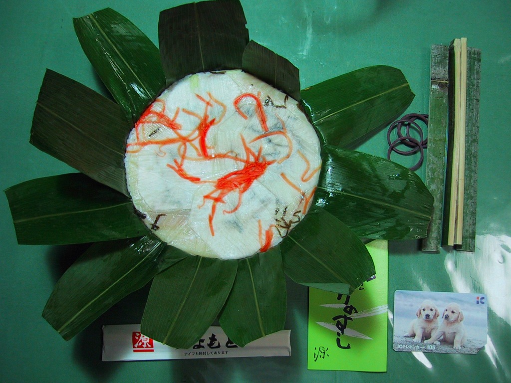 1957(昭和32)年の発売。富山で「ますのすし」より通に好まれる名物。中身はつまり「ますのすし」のマスを、ブリとかぶらと人参と昆布に置き換えたもので、北陸の郷土料理「かぶらずし」をヒントに考案されたらしい。個人的にはかぶらの大根のようなカブのような臭いと酸味がブリの風味を消しているように感じるが、そんなところも通好みといったところだろう。