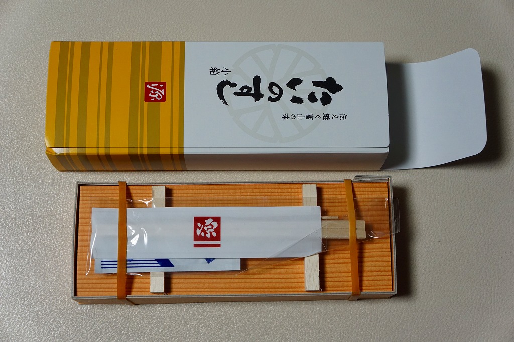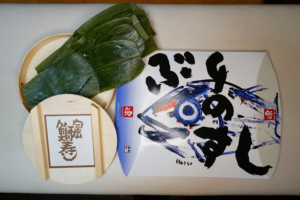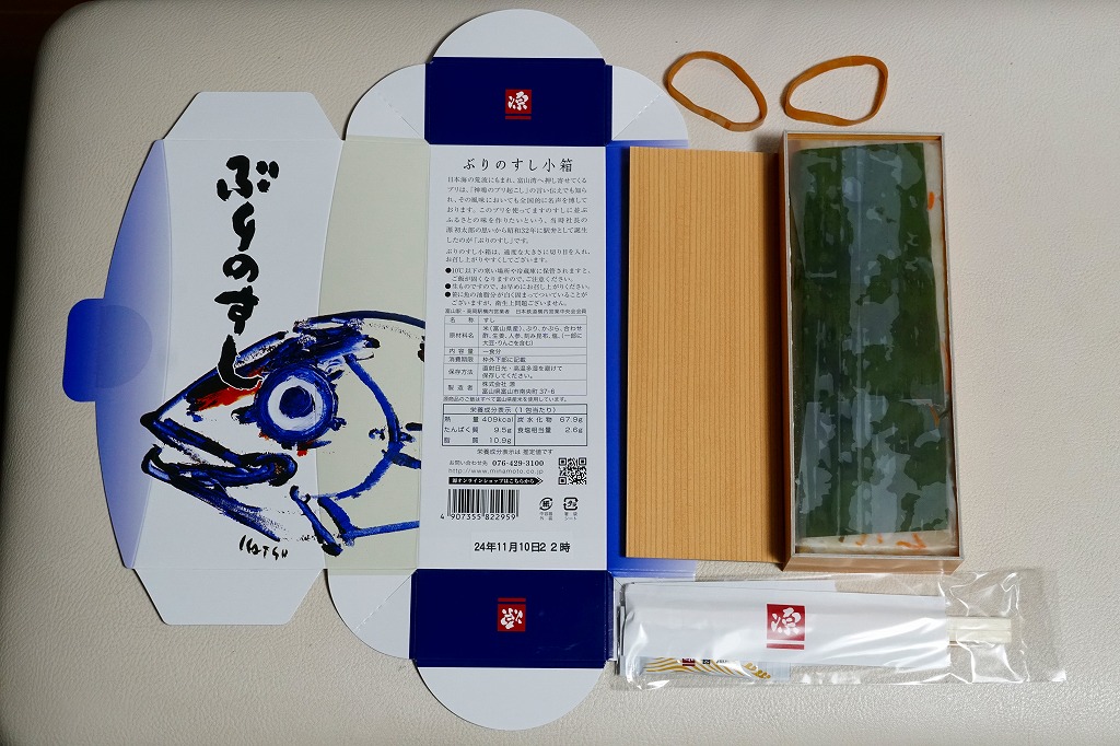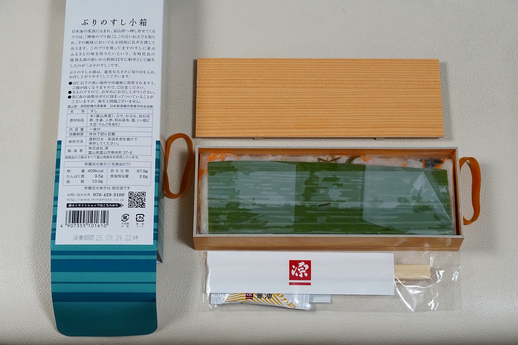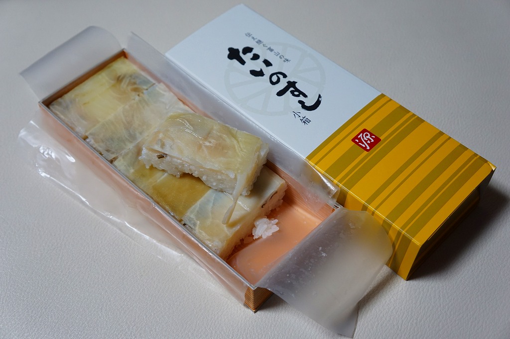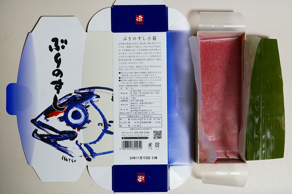 内容は「ぶりのすし」と同じ、魚の押寿司というよりはむしろ野菜寿司に感じる、酸味の強い押寿司。味も同じだと思うが、笹の葉の量により香りと雰囲気が異なる気がした。昭和時代から富山や北陸以外でも売られた「ますのすし」などと違い、これは北陸以外で見かけることはほとんどないと思う。東京で売られる分については2024年から、上記のとおり価格と外箱の絵柄が異なるものとなっている。価格は2003年の購入時で750円、2014年9月から850円、2020年時点で950円、2023年4月から1,100円、2024年4月から1,150円、2025年時点で1,300円、2026年1月から1,400円。