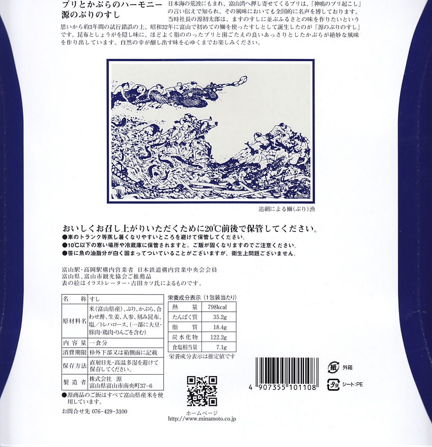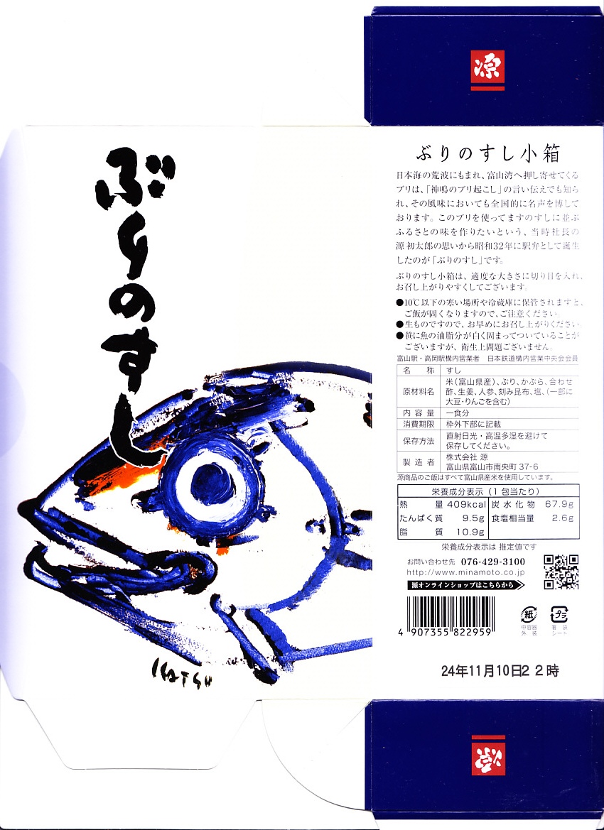 このバージョンはおそらく、2024(令和6)年7月までに東京や大阪で発売。下記の富山駅弁「ぶりのすし小箱」について、箱の絵柄を通常版の「ぶりのすし」と同じ絵柄と似せた構造に変え、容器や中身は「ぶりのすし小箱」のまま、価格を当時の250円増しの1,400円とした。富山の駅弁「ぶりのすし」と同じものであることが分かりやすくなったのに、現地版に反映されないのは不思議。この二重価格も不思議に思える。