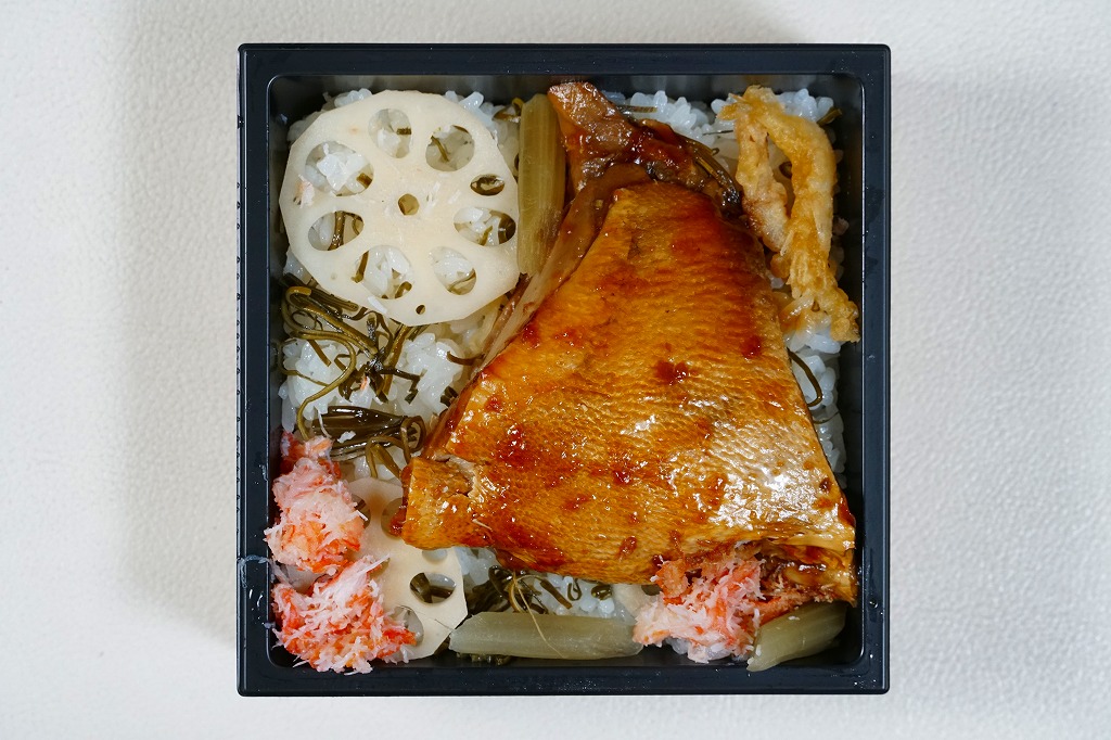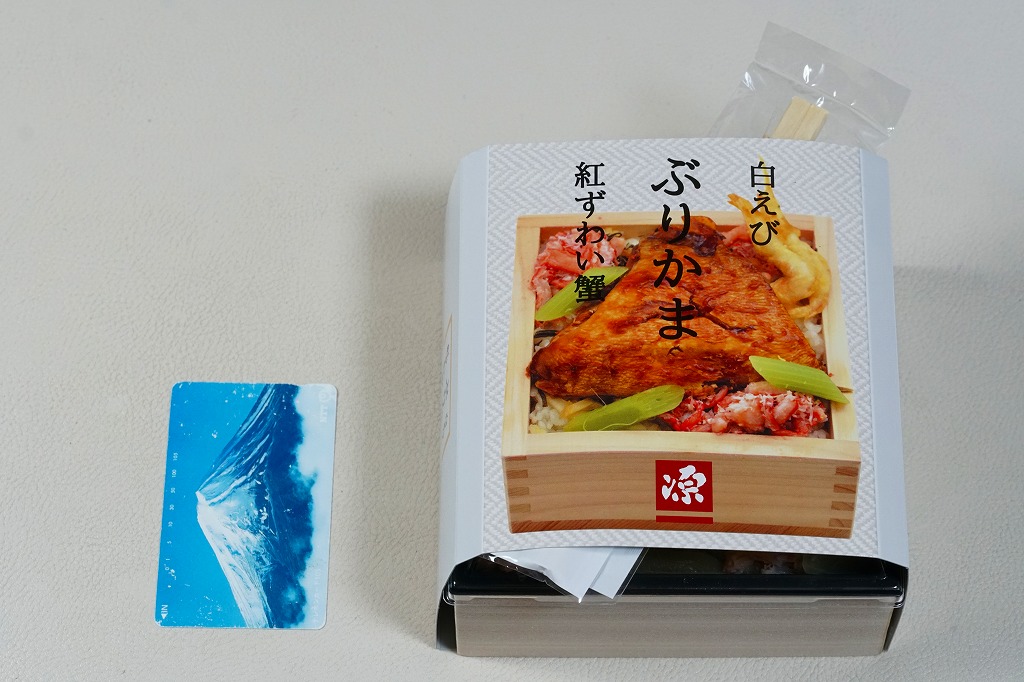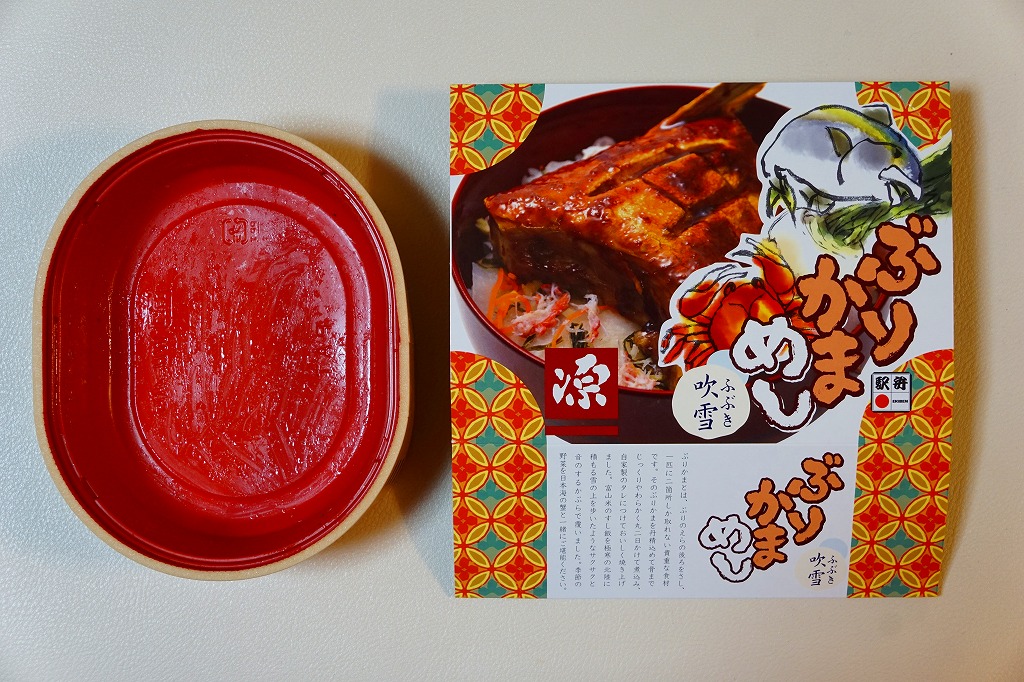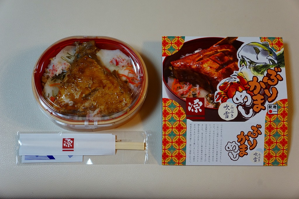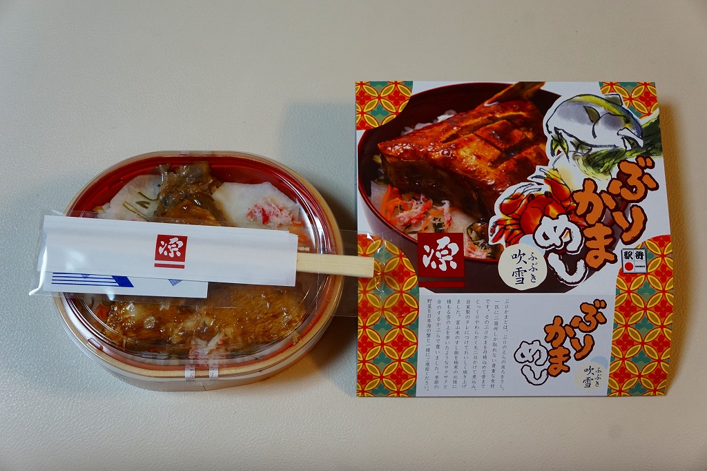 正方形のプラ容器に酢飯を敷き、刻み昆布をまぶし、ぶりかまの煮焼きを置き、カニとフキとレンコンと白海老天で彩り、そんな中身を枡に詰めた写真のスリーブに収める。つまり、冬に人気の富山駅弁「ぶりかまめし」の変型。この味は何度でもいける。値段は2017年時点で1,380円、2018年時点で1,300円。2022年時点で11月から3月まで1,550円で販売する季節の駅弁になった模様。