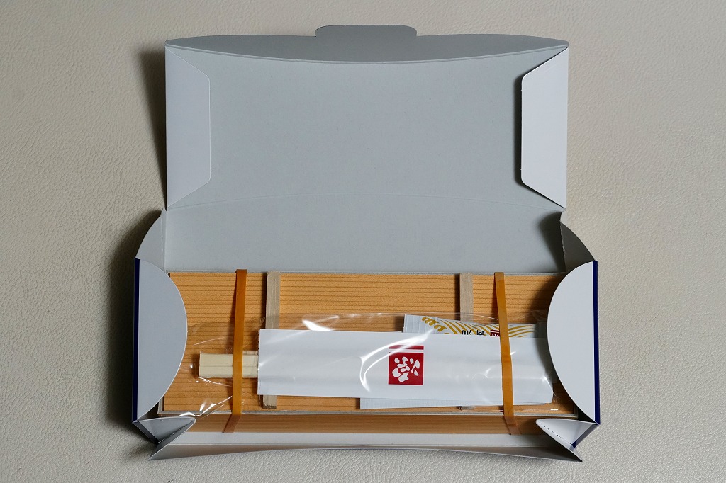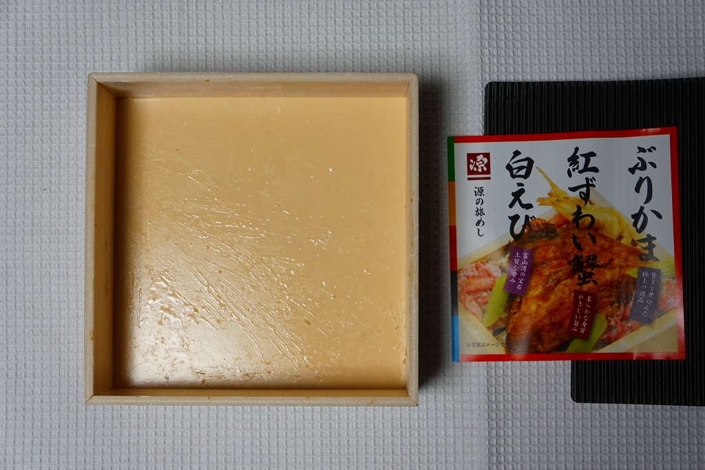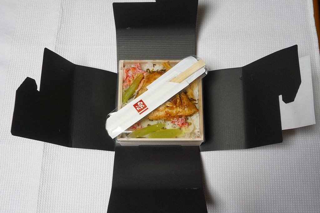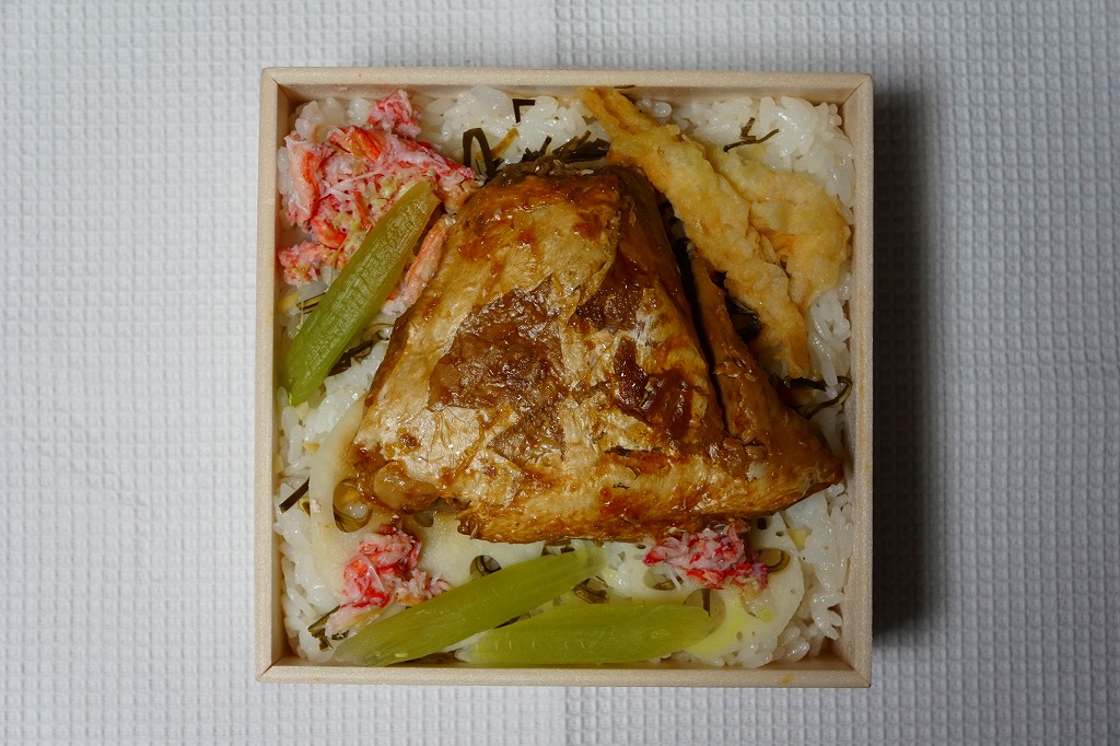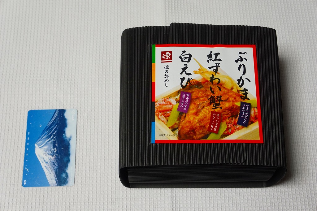 正方形のプラ容器に酢飯を敷き、刻み昆布をまぶし、ぶりかまの煮焼きを置き、カニとフキとレンコンと白海老天で彩り、そんな中身を枡に詰めた写真のスリーブに収める。つまり、冬に人気の富山駅弁「ぶりかまめし」の変型。この味は何度でもいける。値段は2017年時点で1,380円、2018年時点で1,300円。2022年時点で11月から3月まで1,550円で販売する季節の駅弁になった模様。
