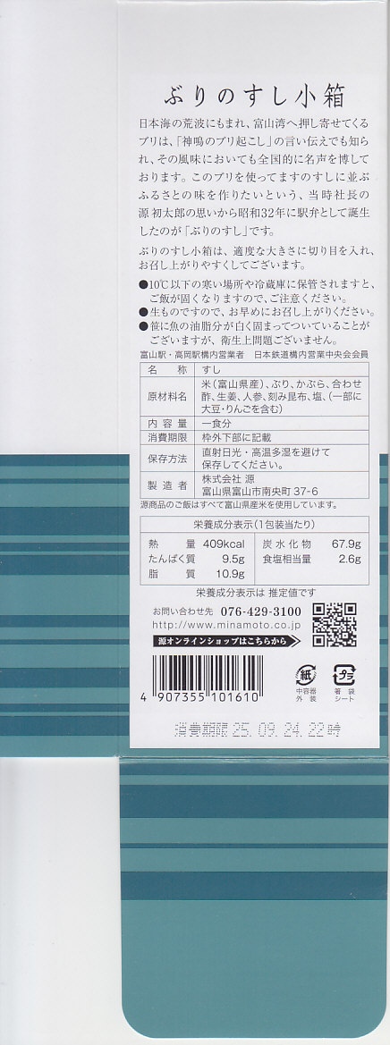 富山駅弁「ぶりのすし」の、1人前の商品。昭和時代から売られているはず。過去には「ぶりのすし弁当」の名前で売られ、2008年から現在の「ぶりのすし小箱」になった。酢飯にブリの身を貼り、生姜と人参と昆布の刻みとかぶらの輪切りも貼り合わせるブリ寿司について、ここでは円筒状でなく棒状とし、一口サイズにカットし、笹の葉で包むのではなく載せてフィルムで包み、木製容器でなくボール紙箱に詰めて輪ゴムで押し、余裕なく容器にぴったりの紙箱に収める。