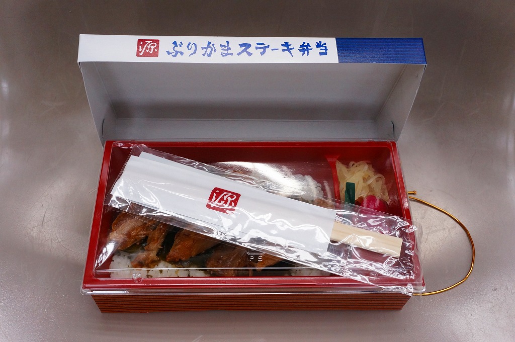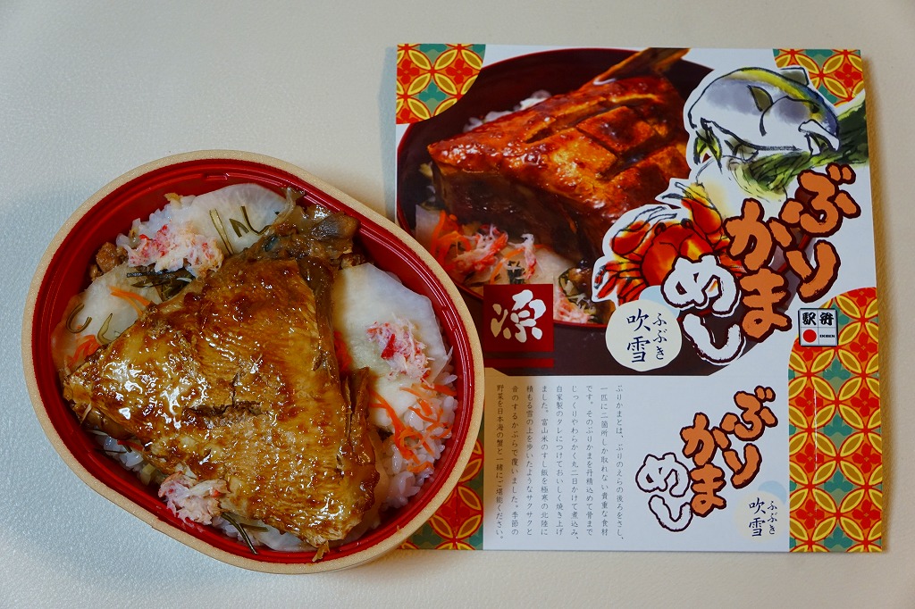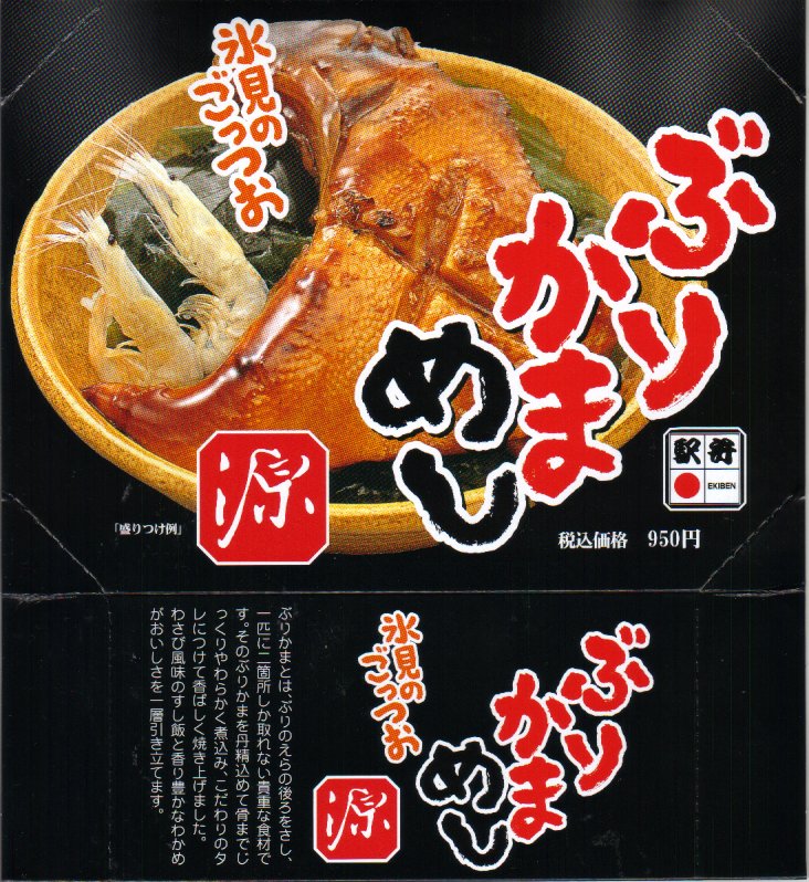2012(平成24)年の12月までに発売か。デビューの地や主戦場はもしかすると、東京駅の駅弁売店「駅弁屋 祭」かもしれない。中身は上記の名駅弁「ぶりかまめし」とほぼ同じ。違いは、ブリのカマが1個ではなく3切れになったこと、ラッキョウの赤ワイン漬と甘酢生姜の付合せが付いたことと、丸い容器が四角くなったことと、ふたに富山駅の名物駅弁「ぶりのすし」の絵柄を持ってきたこと。味の良さは折り紙付き。できればこの味は、酢の入らない飯でいただきたいところ。2020年までの販売か。