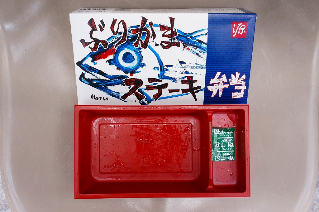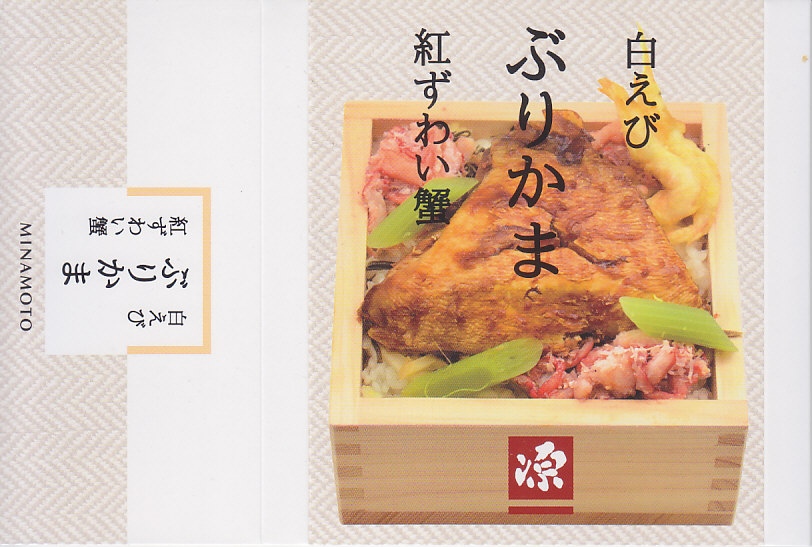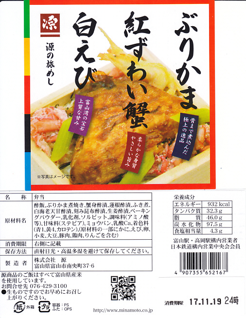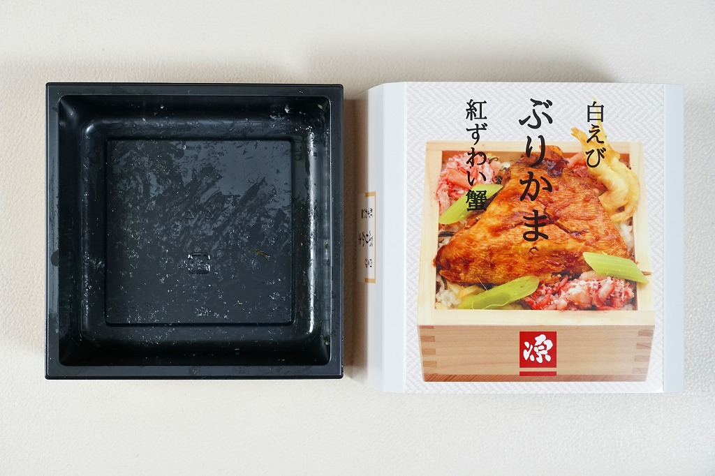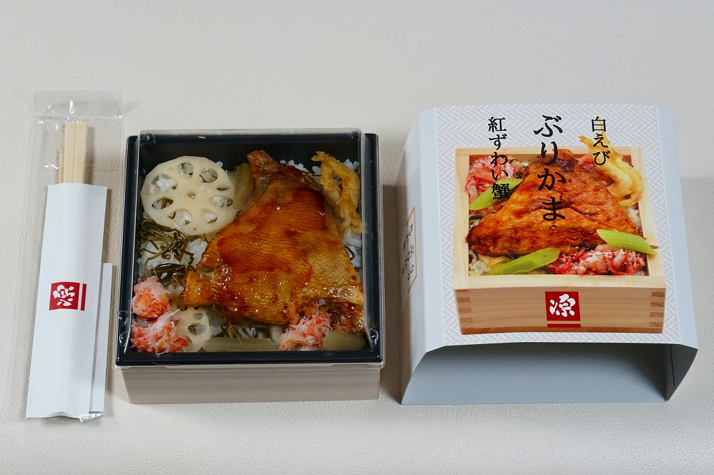 上記の駅弁「ぶりかま紅ずわい蟹白えび」の、2017(平成29)年時点での姿。当時は正方形の容器を黒い紙で包んで掛紙を載せており、そこに「源の旅めし」の表記があった。中身は変わらない。