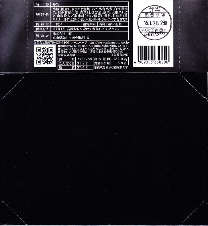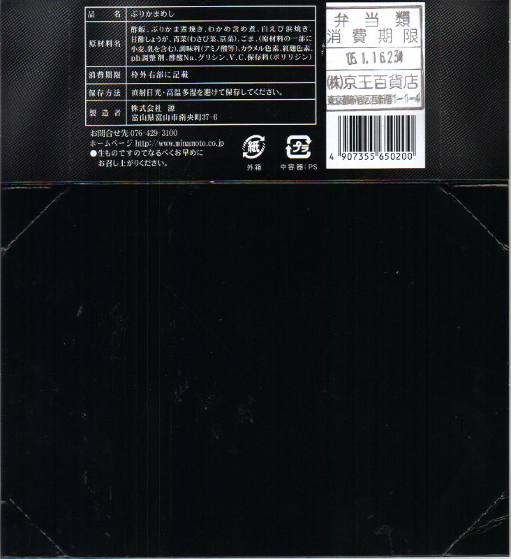 2004(平成16)年5月21日に購入した、富山駅弁のパッケージ。下記の2001年のものとはほとんど、上記の2020年のものとはまったく、変化がないことに驚く。駅でなくスーパーマーケットで買ったので、閉店前で30%引きのシールが貼られた。これは普通の駅弁とは違い、製造後20時間から30時間が一番の食べ頃というから、こんな割引後のほうがおいしいかもしれない。