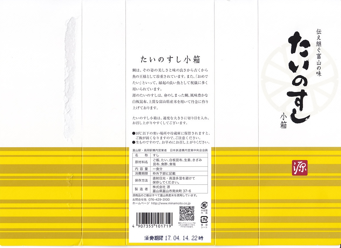 富山駅の知られざる駅弁。2000年代には発売されていたようで、駅で普通に買えるようになったのは2010年頃からか、あるいは北陸新幹線富山駅の開業後か。これは「小箱」シリーズのサイズで、有名な駅弁「ますのすし」「ぶりのすし」と同じように、酢飯にタイの身を貼り合わせ、白板昆布で覆う。味はマスやブリと違い淡泊で、それらに比べて印象に残りにくい感じ。2019年頃までの販売か。