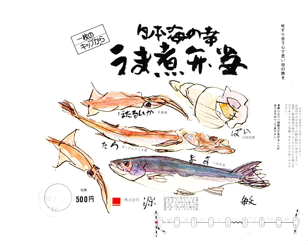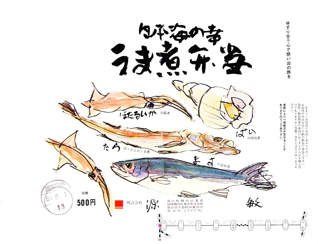1976(昭和51)年8月1日の調製と思われる、昔の富山駅弁の掛紙。魚介類の絵柄には、ほたるいか甘露煮、ぼうだらのうま煮、ますの昆布巻、ばい貝時雨煮と付けており、イカを含めた中身の食材を絵柄で示したものか。立山黒部アルペンルートの路線図も掲載。