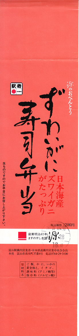 1999(平成11)年2月28日18時の調製と思われる、昔の富山駅弁の掛紙。日本海産ズワイガニがたっぷりな、北陸タイプの四角いカニの押寿司を、正八角形の容器に列べたものだったらしい。