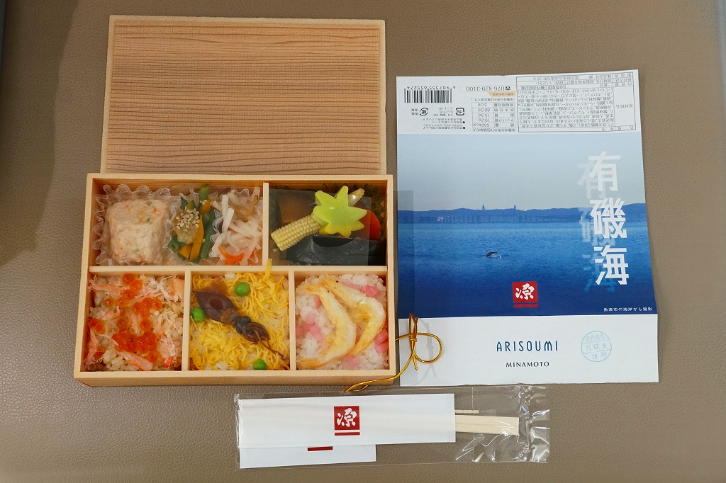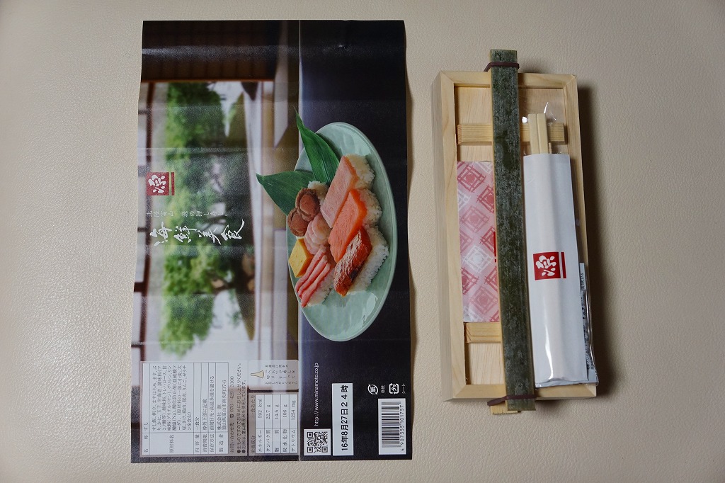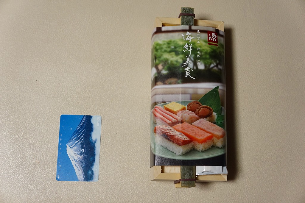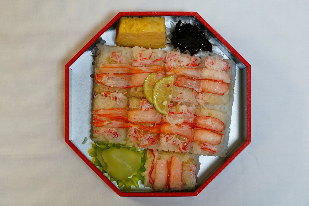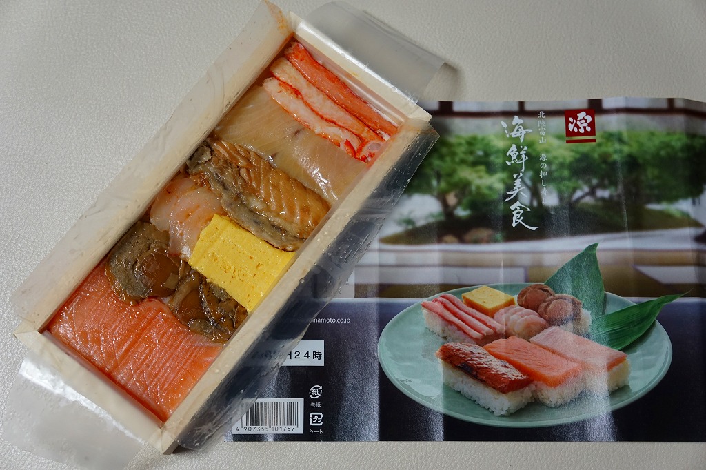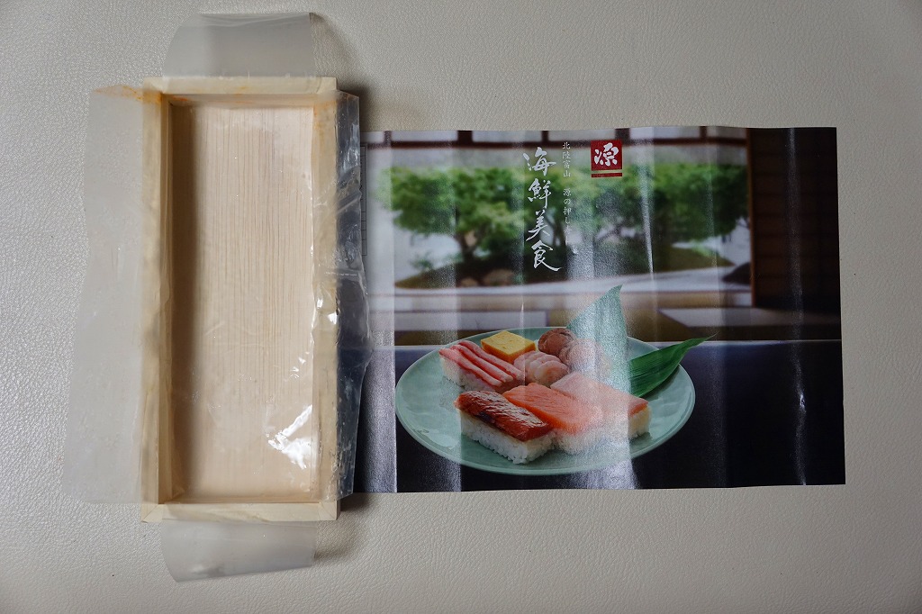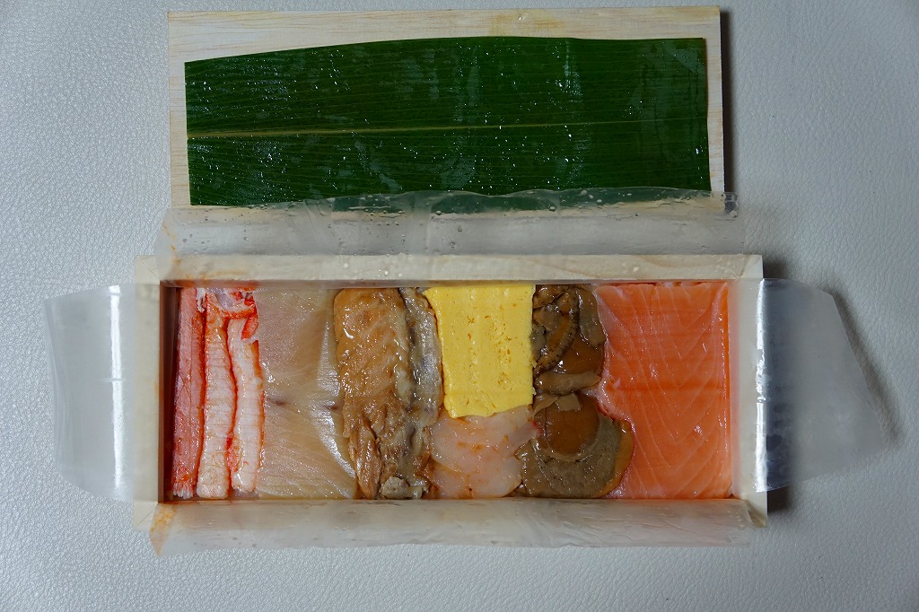 2015(平成27)年の夏または年末に発売か。とてもコンパクトな長方形の押寿司容器に、美しい見本写真の掛紙を巻く。中身はその写真のとおり、マス、マスのハラミ、ホタテ、ブリ、カニ、タマゴ、アマエビの具を並べた押寿司。実物は酢飯がつながっていて、添付のヘラまたは割り箸で切りながら食べる。