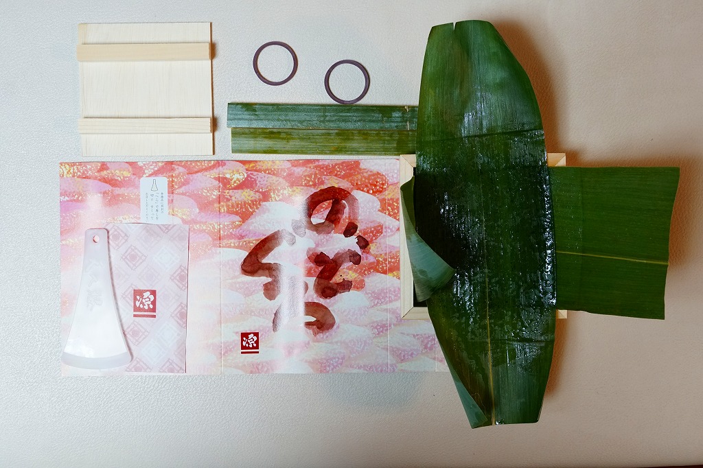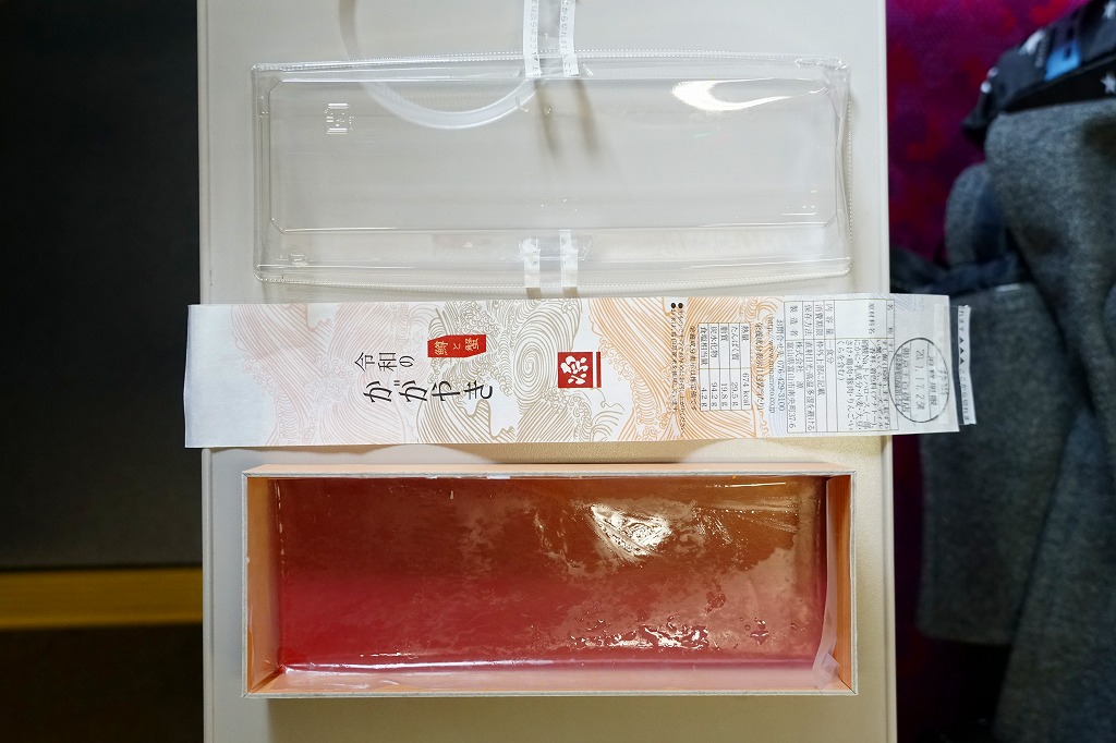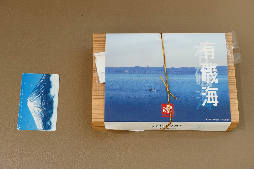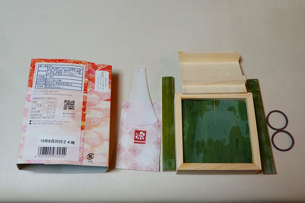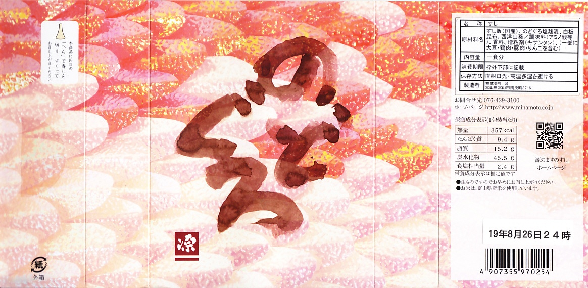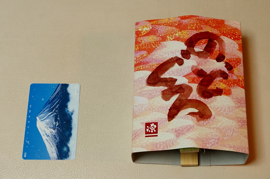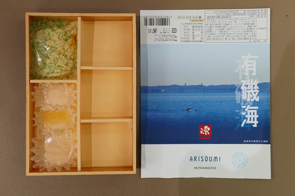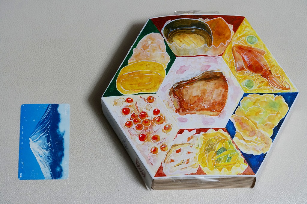 2015(平成27)年の夏または年末に発売か。とてもコンパクトな長方形の押寿司容器に、美しい見本写真の掛紙を巻く。中身はその写真のとおり、マス、マスのハラミ、ホタテ、ブリ、カニ、タマゴ、アマエビの具を並べた押寿司。実物は酢飯がつながっていて、添付のヘラまたは割り箸で切りながら食べる。