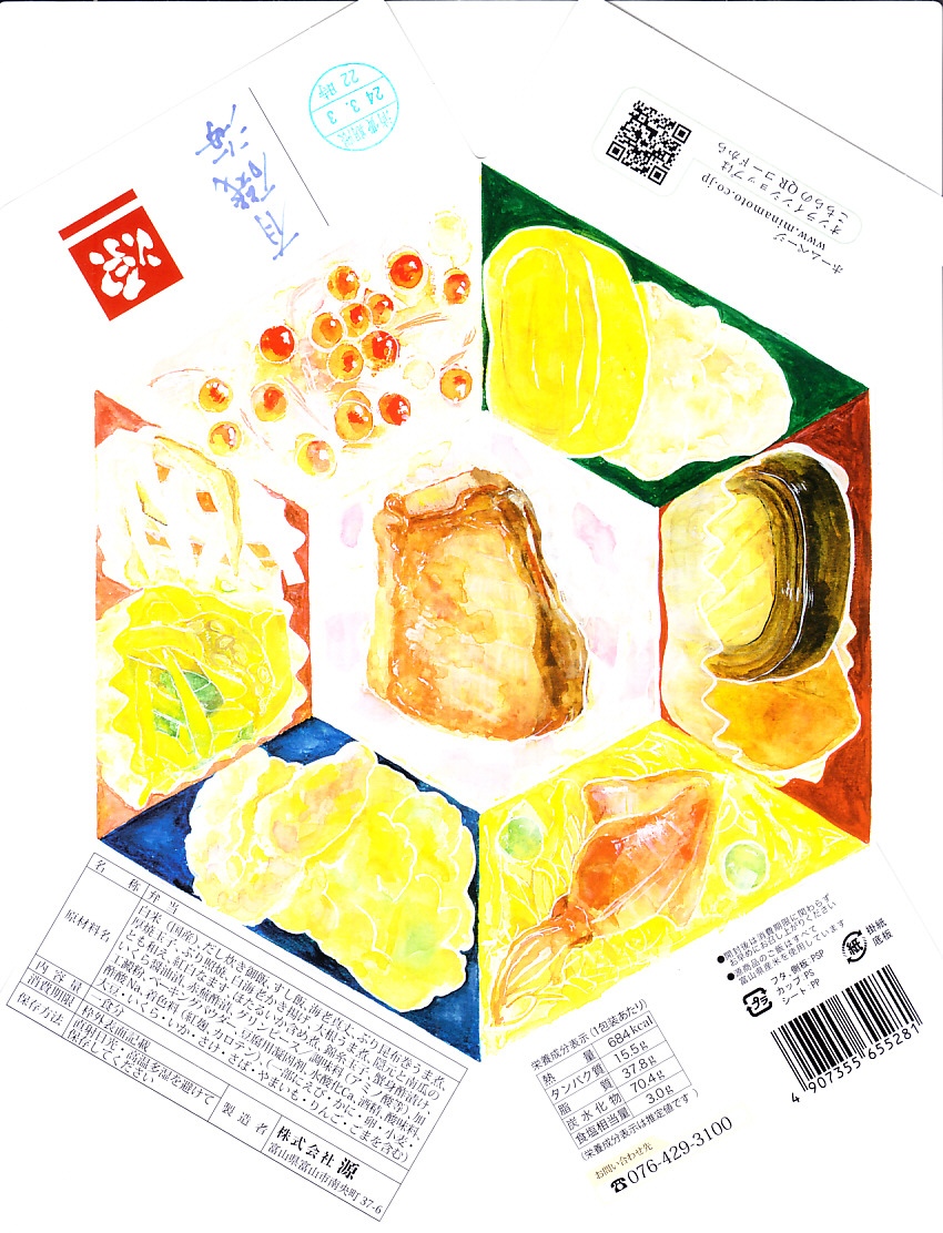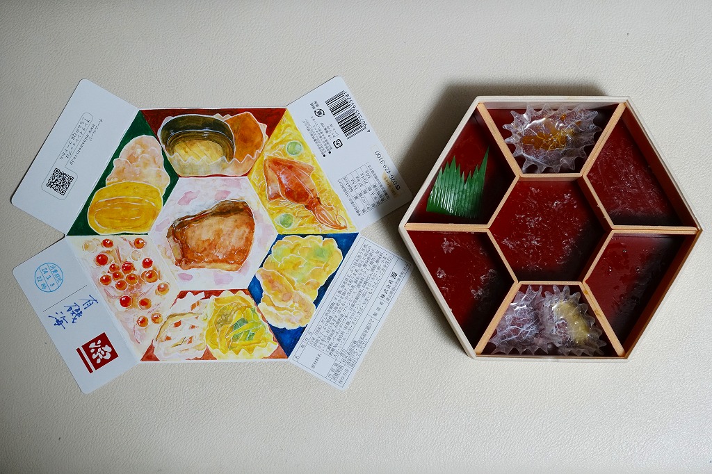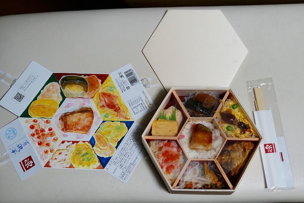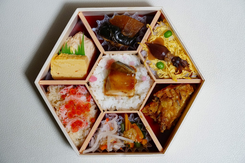 各角と中央で7区画の中身は、ベニズワイガニとイクラのだし炊き御飯、ホタルイカとグリーンピースと錦糸卵の酢飯、ぶり照焼と赤かぶ酢漬の白飯で3区画の御飯に、海老しんじょうと厚焼き玉子、白海老かき揚げ、ぶり昆布巻と大根のうま煮、いんげんとカボチャのとも和えと紅白なます。富山の食をおめでたく、そして落ち着いて詰めた感じ。日本酒に合うお食事かもしれない。価格は2021年時点で1,000円、2022年時点で1,100円、2023年時点で1,150円。