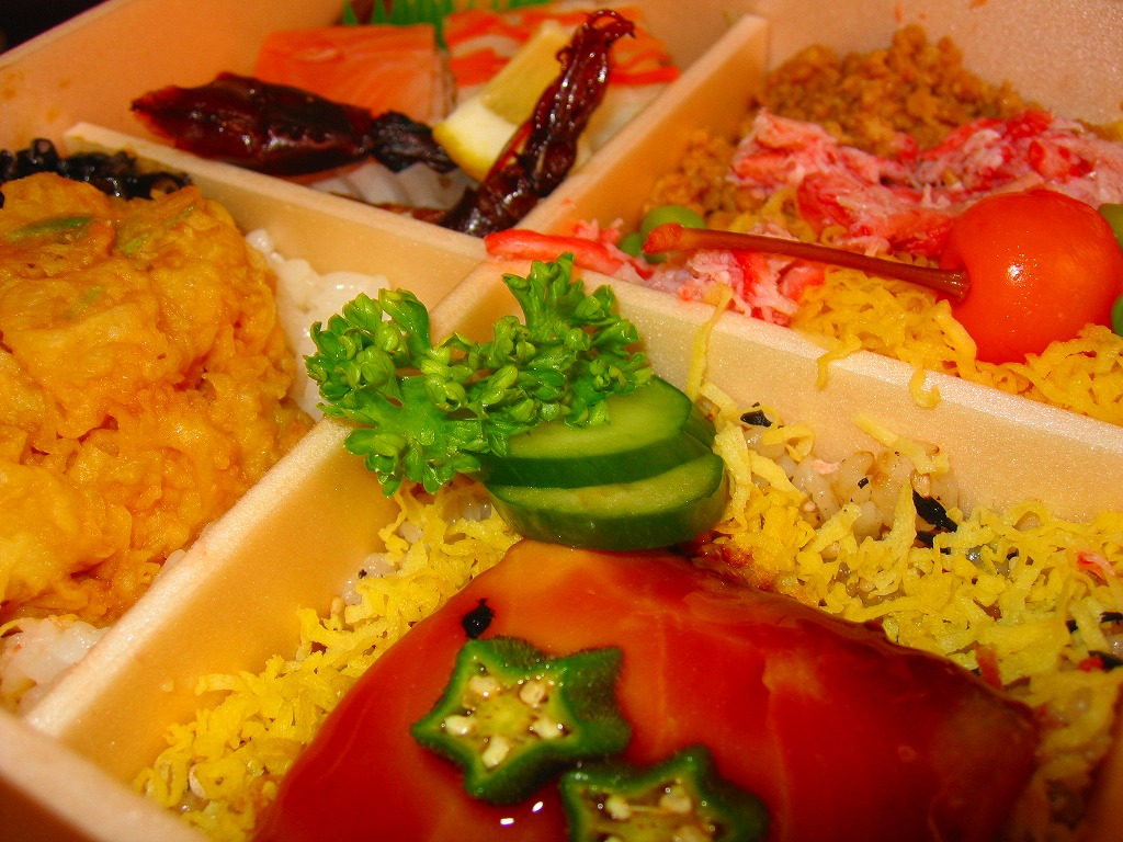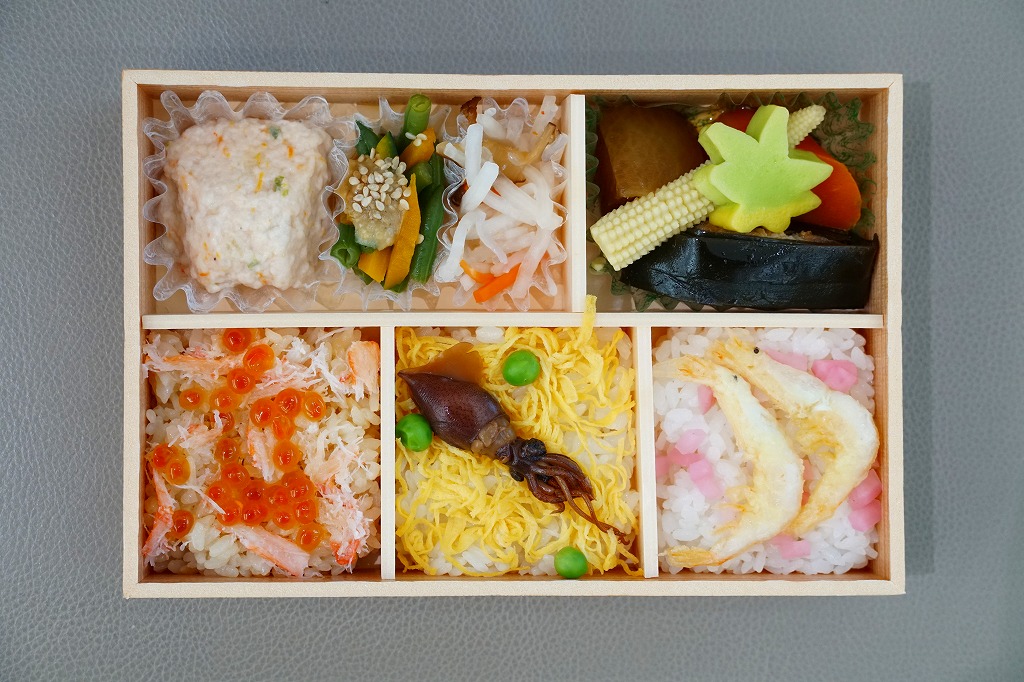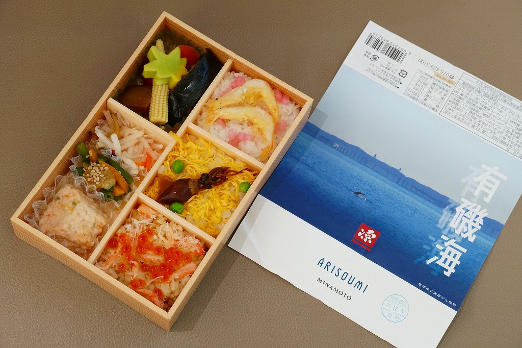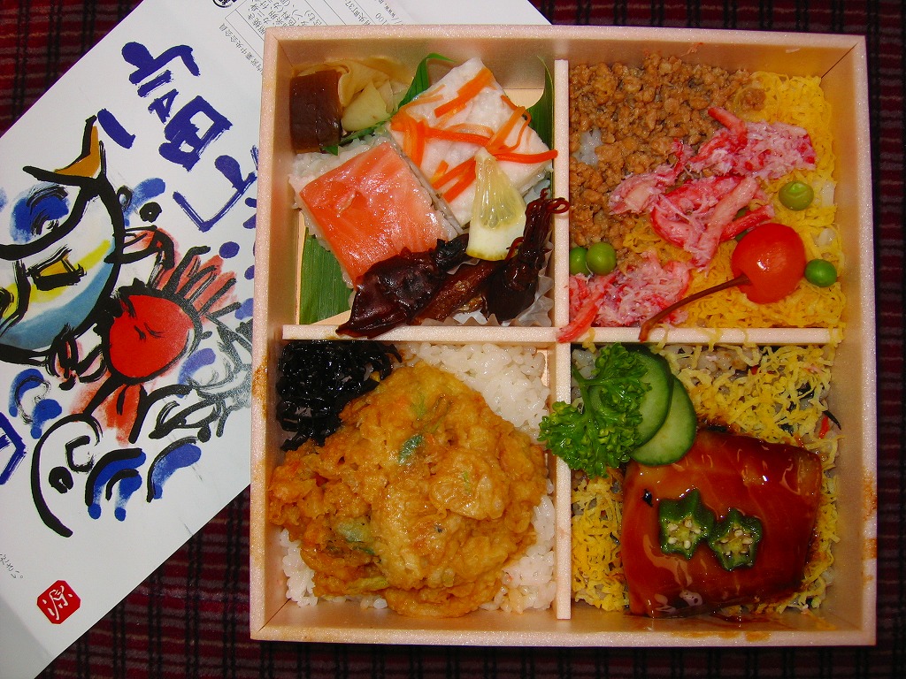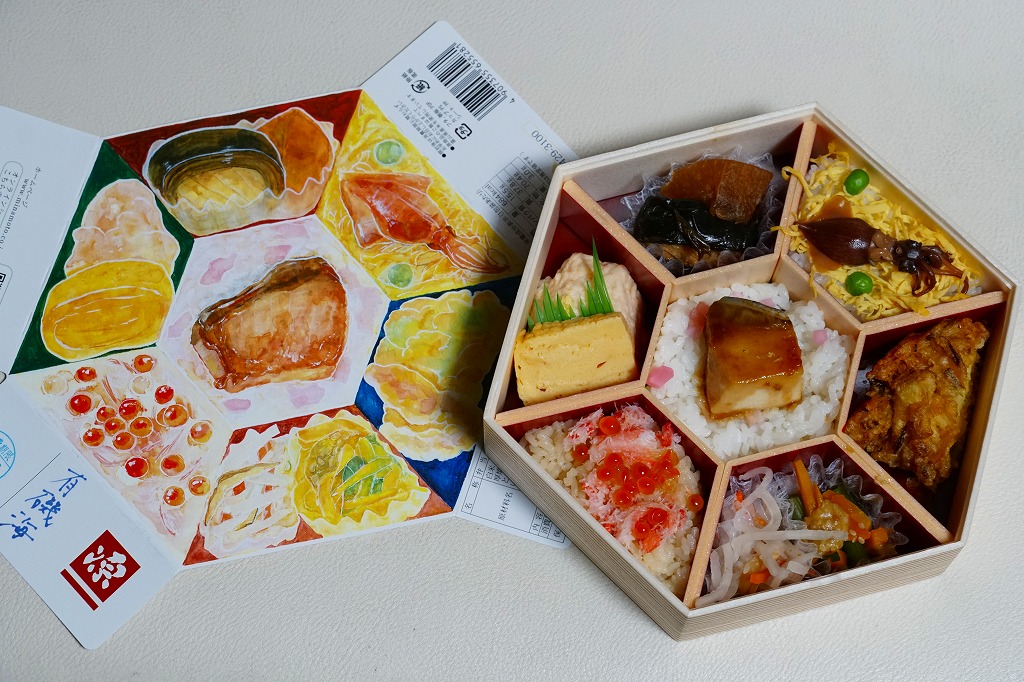 2003(平成15)年11月11日に発売。小柄な正方形の容器に、カニとブリとイカと海を描いた掛紙を巻いて、金色のゴムでしばる。松花堂風に4分割された中身は全区画に御飯が入り、ブリ照焼、白エビかき揚げ、カニと錦糸卵と鳥そぼろ、ますのすしとぶりのすしに焼ホタルイカが入る。