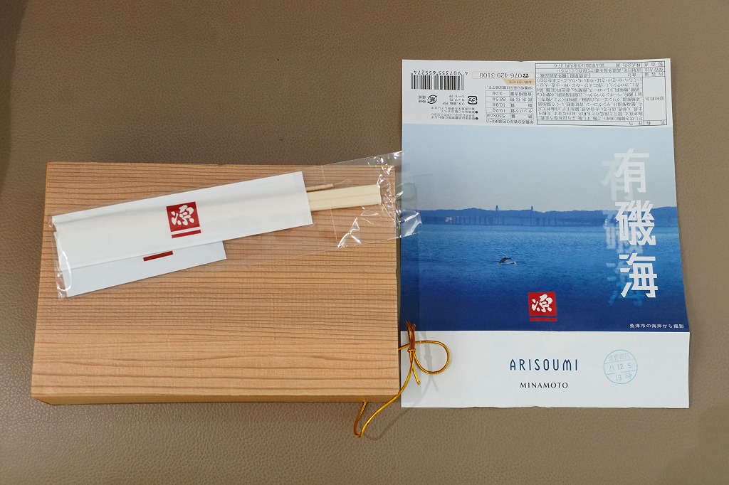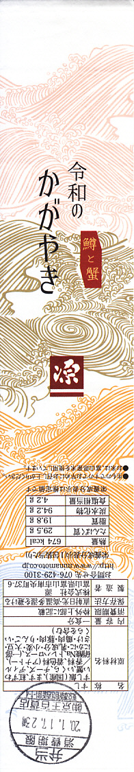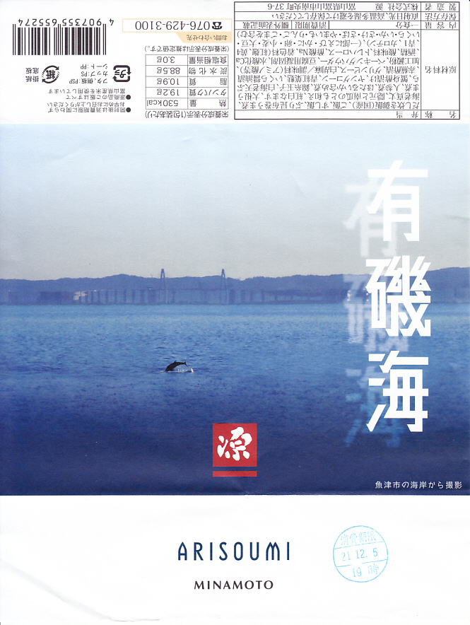 2021(令和3)年12月5日に購入した、富山駅弁の掛紙。同年の発売時の姿。「魚津市の海岸から撮影」とある、しかし射水市の富山新港に架かる新湊大橋を正面に据えた富山湾の写真を使う。2022年の春頃に上記のとおり、まったく異なる姿に変わった。中身はあまり変わらない。