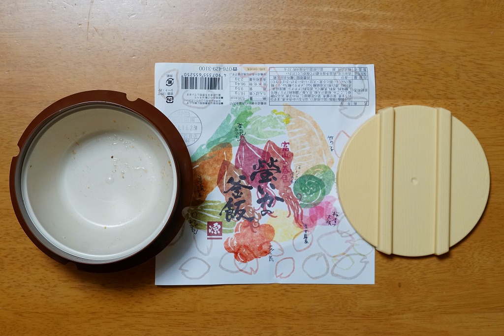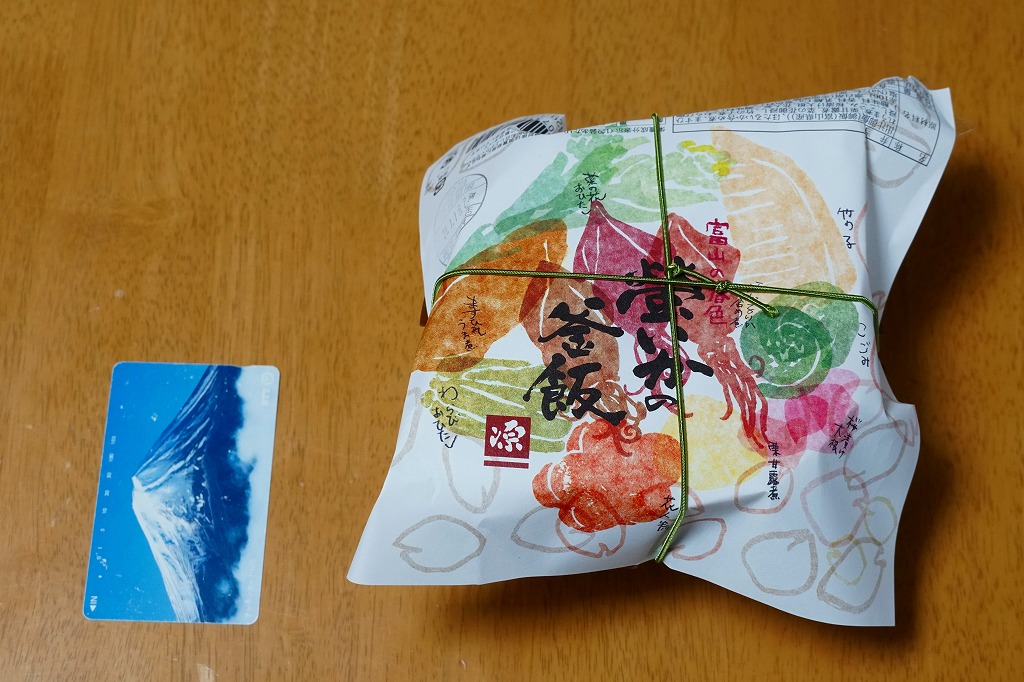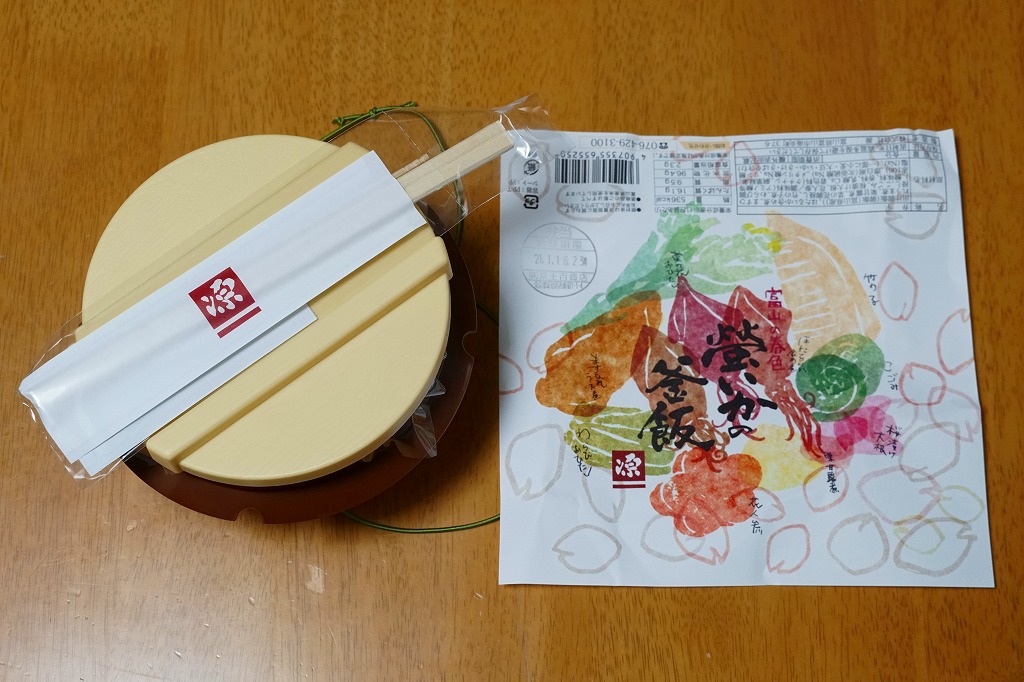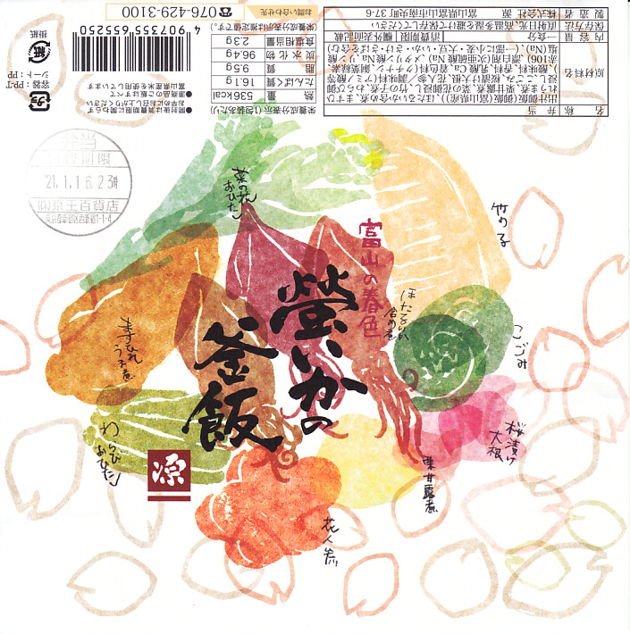 富山で春季に、4月頃に売られる駅弁。2021(令和3)年1月の京王百貨店の駅弁大会では、新作の駅弁として実演販売された。中身の食材をデザインした掛紙は、この催事のために新たに起こされたのだろう。プラ製の釜飯駅弁向け容器に茶飯を詰め、ホタルイカの含め煮、マスのヒレのうま煮、くり、菜の花、タケノコ、ワラビ、こごみ、ニンジン、大根桜漬で覆う。内容の個性と、おしとやかな風味に掛紙。車窓が欲しくなる優れ物。2021年の京王百貨店の駅弁大会では1,200円で売られたが、現地では1,000円。2023年時点で1,100円。
