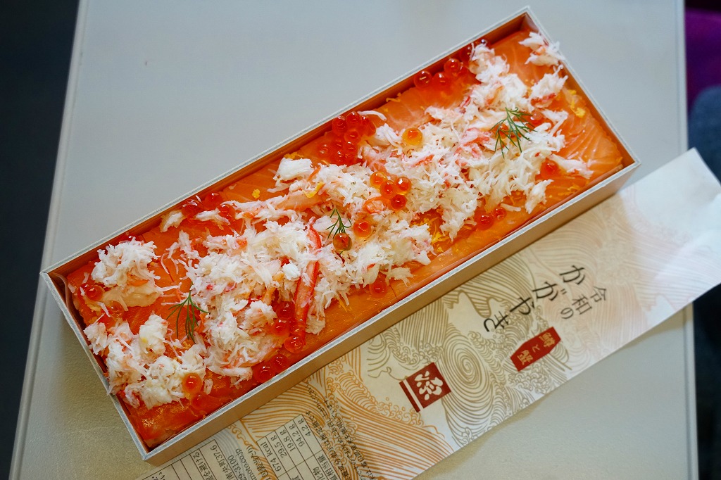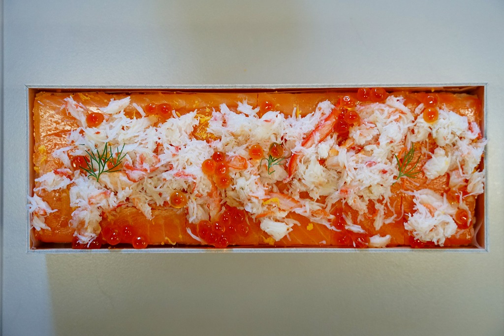 2020(令和2)年1月の京王百貨店の駅弁大会で実演販売。細長い容器に酢飯を詰め、マスで覆い、カニとイクラとチーズを振りかける。富山駅弁のマスの棒寿司「ますのすし小箱」に具を載せたようなもの。「ますのすし」の駅弁屋なので、マスの厚みと旨さは抜群だったが、この催事場で会期の前半に実演販売し例年どおりの人気だった「ぶりかまめし」と違い、この新作はおしとやかすぎて客が付いていなかった。