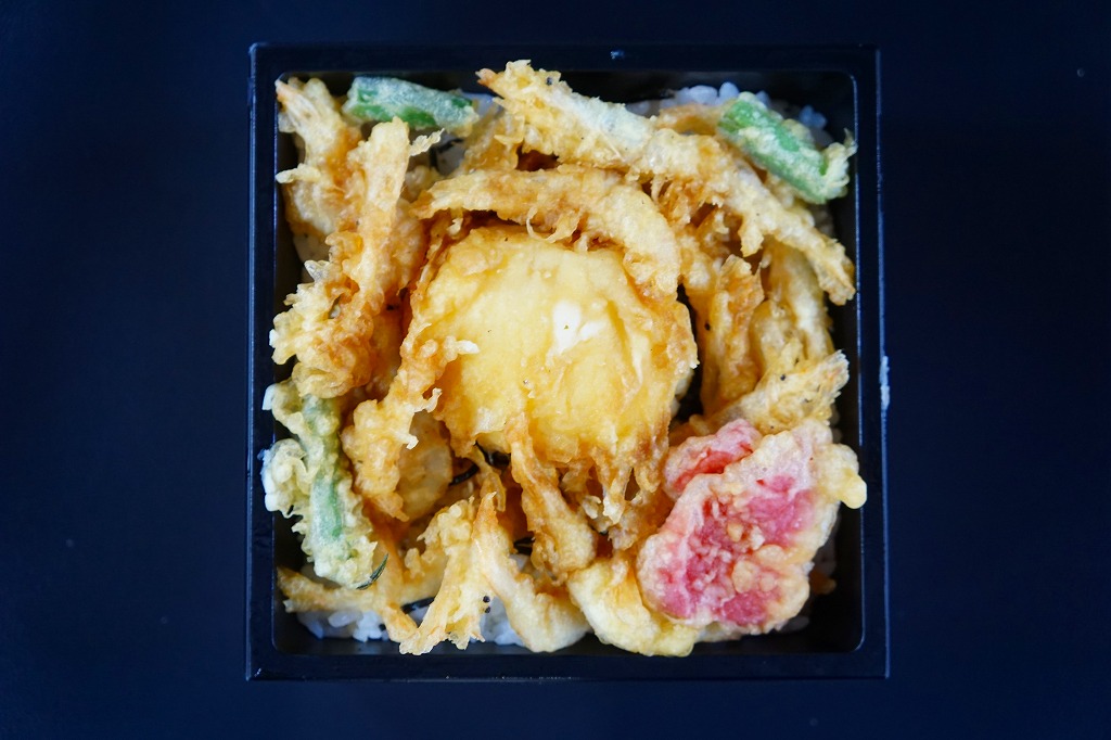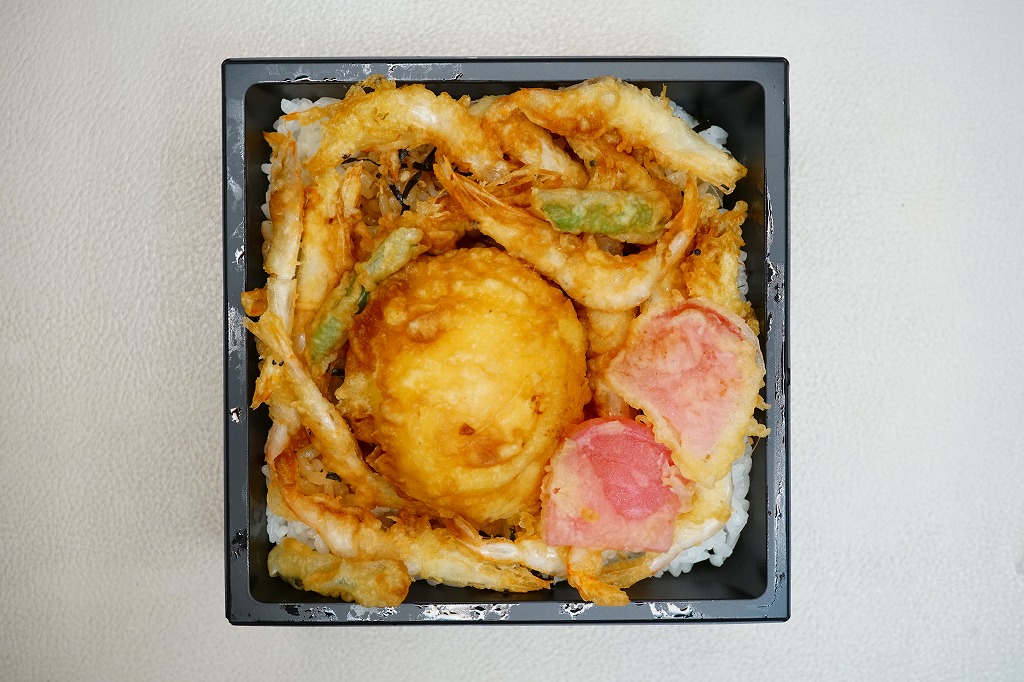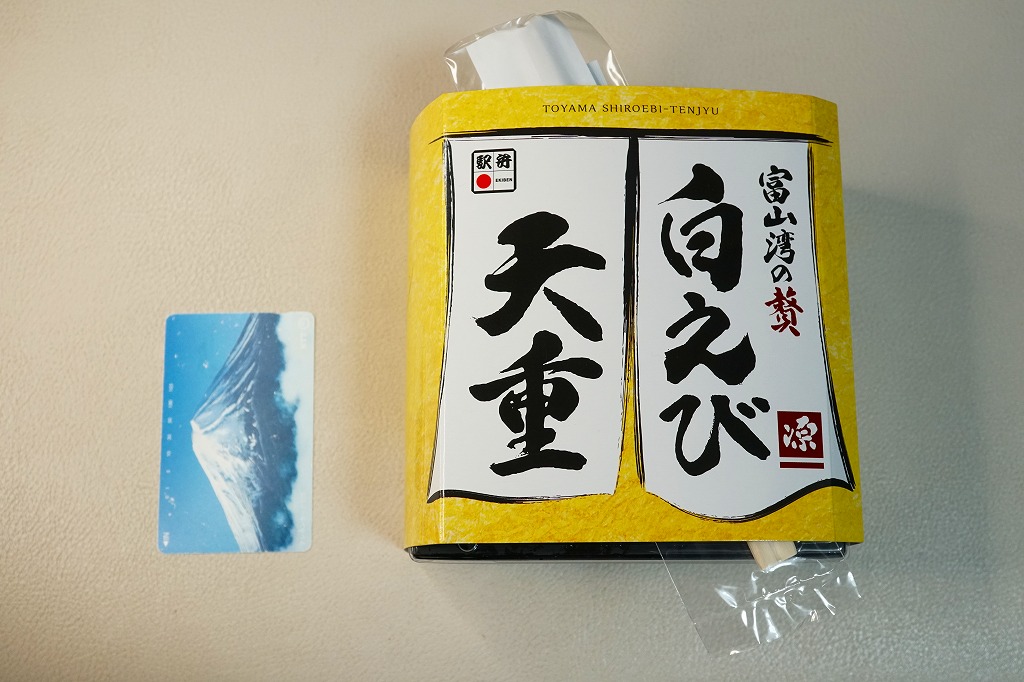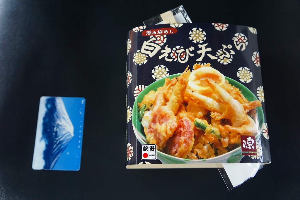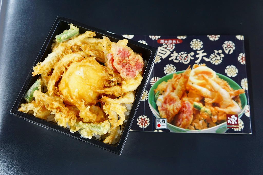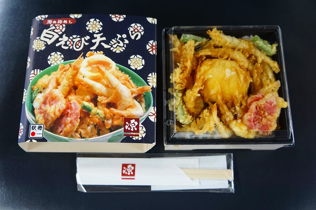 2023(令和5)年4月10日に、富山駅でなく東京駅の駅弁売店「駅弁屋 祭」で発売だそうな。正方形のプラ容器に白飯を詰め、白海老天ぷら、半熟卵天ぷら、赤蕪天ぷら、隠元天ぷらで覆う。そんな中身は、2017年から2019年まで売られた富山駅弁「源の旅めし 白えび天ぷら」と同じで、値段が600円も上がった。さすがに常温では衣と油で具の風味を感じづらいものの、おいしくいただける天丼。