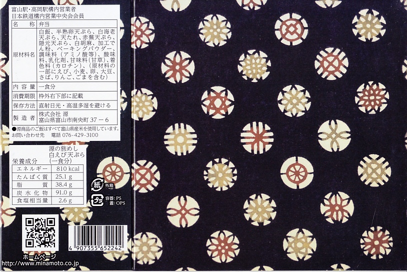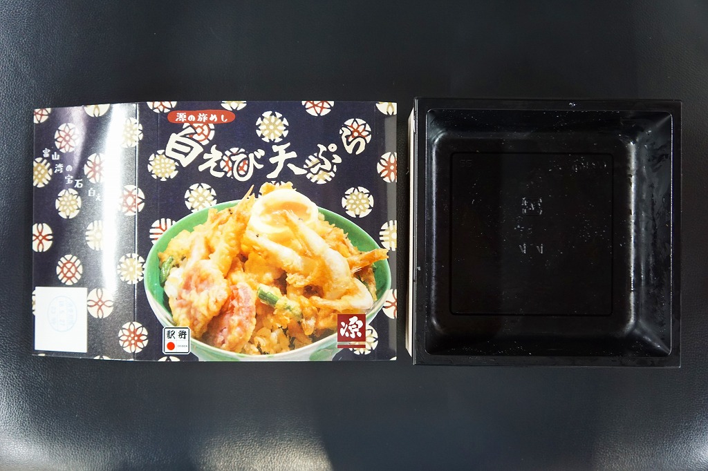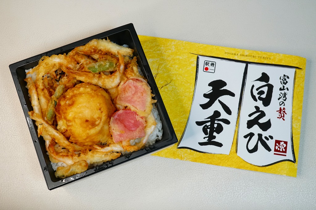 2017(平成29)年4月9日に富山、金沢、新高岡の各駅で、加熱機能付き容器を使い1,100円で発売。翌2018(平成30)年の春に、容器を加熱機能付きでなくしたこの900円のものへリニューアル。富山駅の駅弁屋の駅弁シリーズ「源の旅めし」の第一弾だと思われる。中身は白御飯の上に天ぷらのみを載せる天丼。その内容はパッケージの写真のとおりで、具の多くが白えびで、他に赤かぶ、いんげん、そしてなんと半熟卵も天ぷらになっていた。常温の天丼という地雷なのに、味は意外に爽やか。2019年までの販売か。