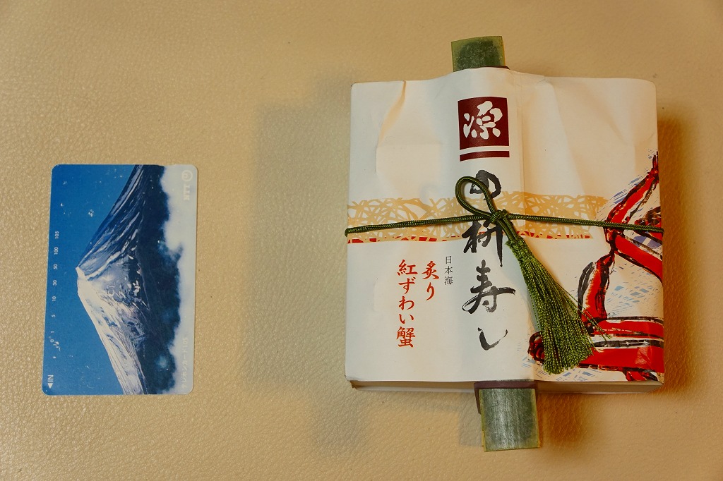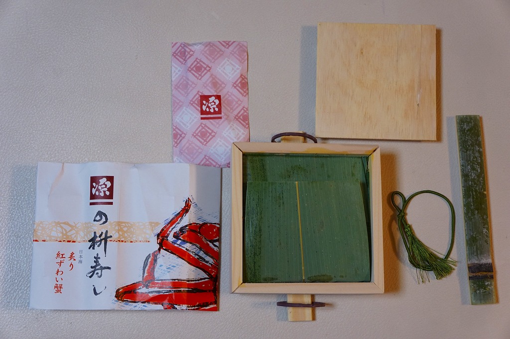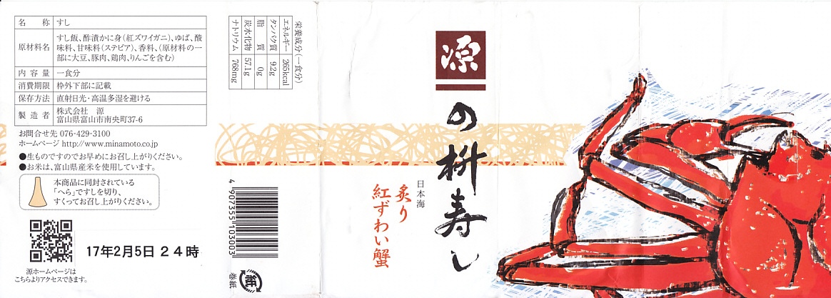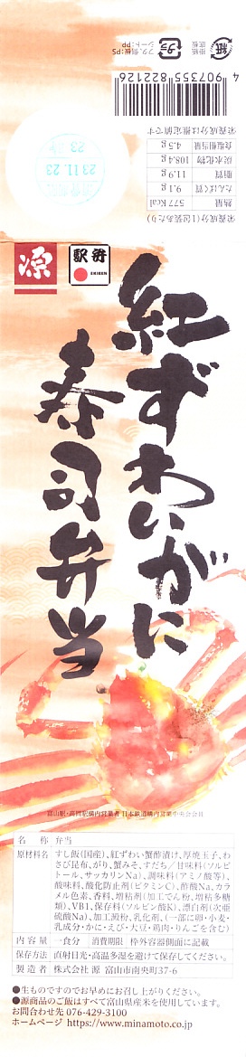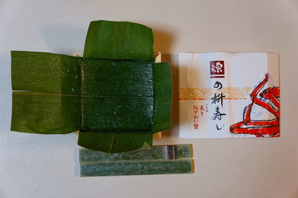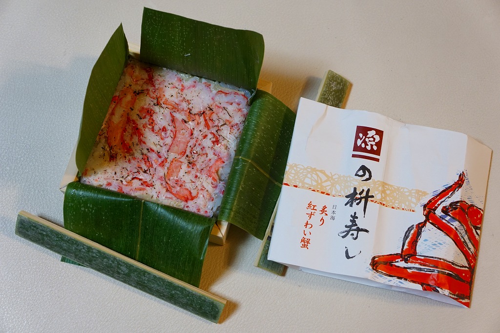 2016(平成28)年の秋に発売か。名称は「源の枡寿し」のものと「能登枡寿し」のものがあった模様。これは翌2017年2月の熊本市の鶴屋百貨店での駅弁大会で購入したもので、四角い小箱にカニ寿司が収まる。富山駅の有名駅弁「ますのすし」のように、真っ白な酢飯を身で覆い、笹の葉に包まれ、竹と輪ゴムでしっかり押されていた。1年間ほどの販売か。