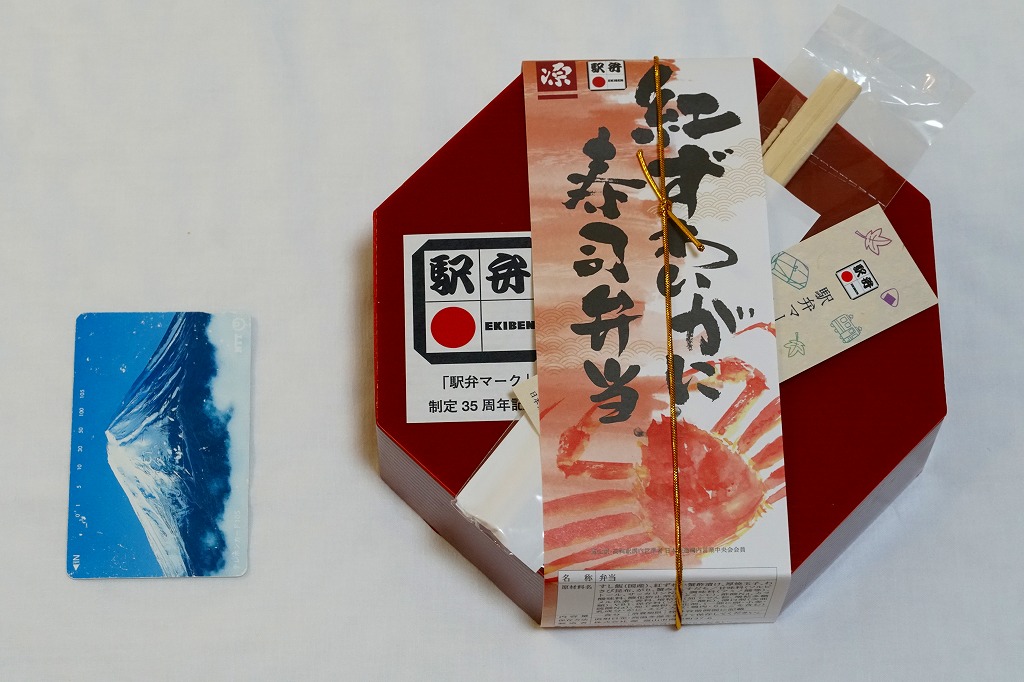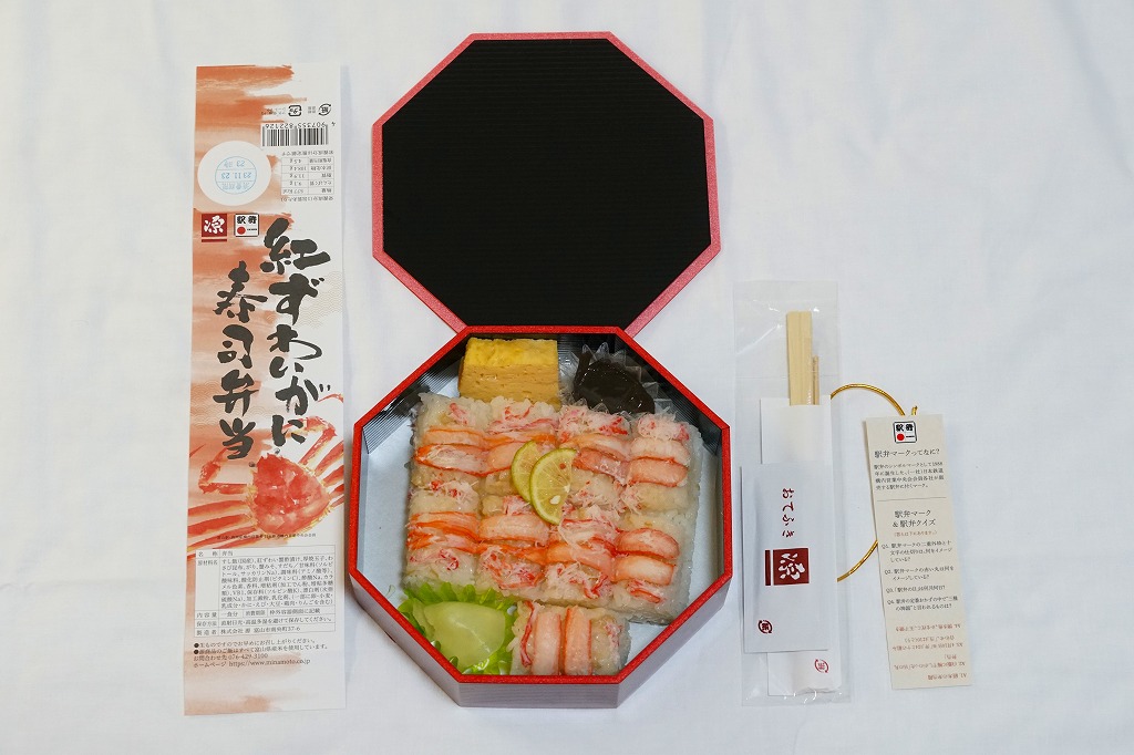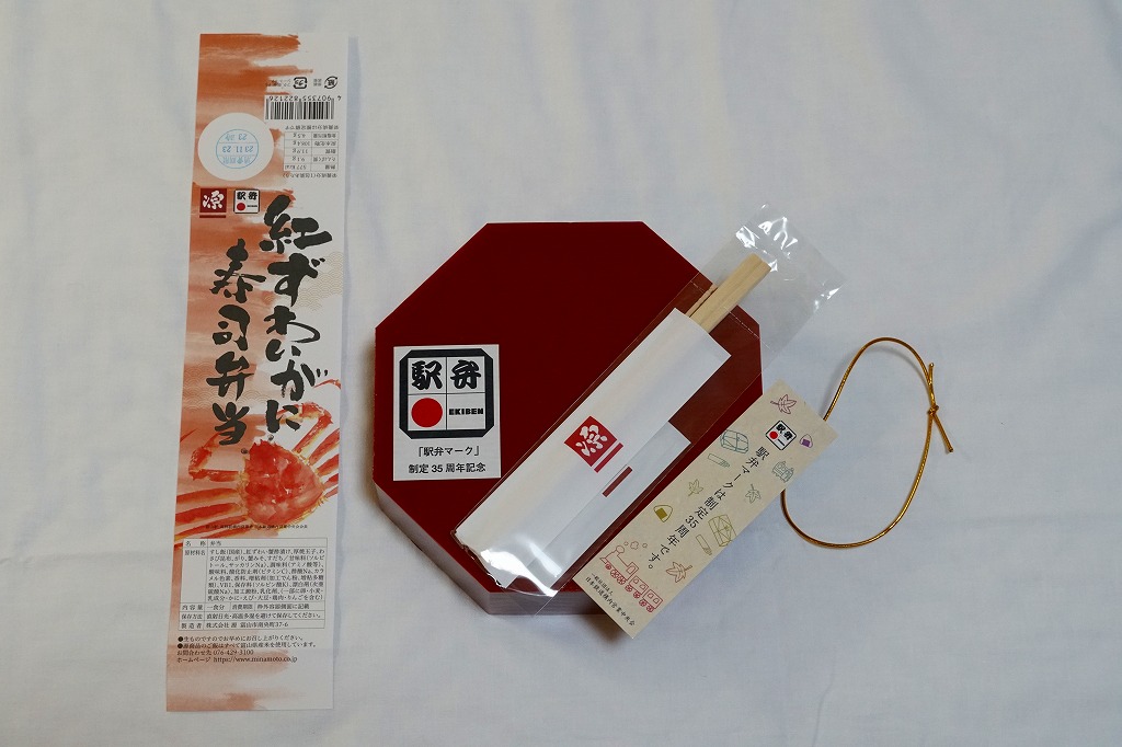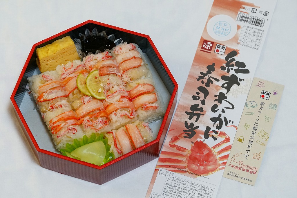 2023(令和5)年11月11日に、金沢、新高岡、富山の各駅などで発売。日本鉄道構内営業中央会の「駅弁マーク」制定35周年を記念し、会員のうち29社が主に11月10日から期間限定で販売した31種類の記念駅弁のうち、富山駅の駅弁屋のもの。正八角形の容器のふたに、大きめの駅弁マークのシールを貼り、記念のしおりを挟み、商品名とカニを描いた紙帯を締める。