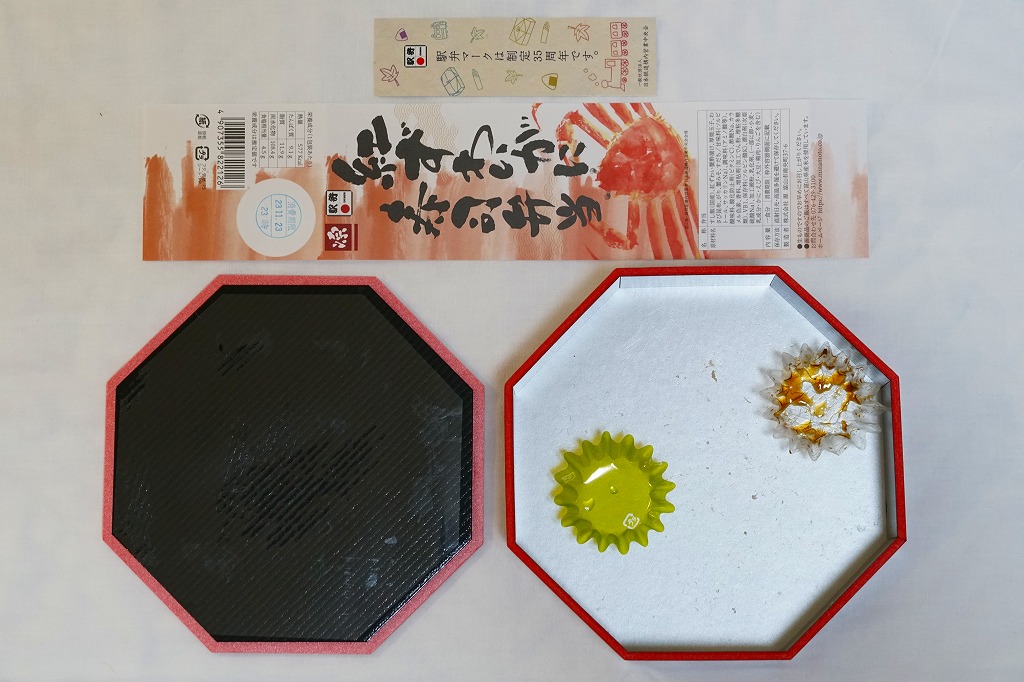 中身は俵型で蟹みそ混じりの酢飯にベニズワイガニのほぐし身と脚肉を載せたもの9個に、すだちを載せ、ガリ、わさび昆布、玉子焼を添えたもの。駅弁にも富山にもこだわらない、北陸地方を含め他駅の駅弁にないような、上品なカニ寿司に仕上がった感じ。11月11日から当分の間販売。価格は2023年の発売時で1,400円、2026年1月から1,550円。