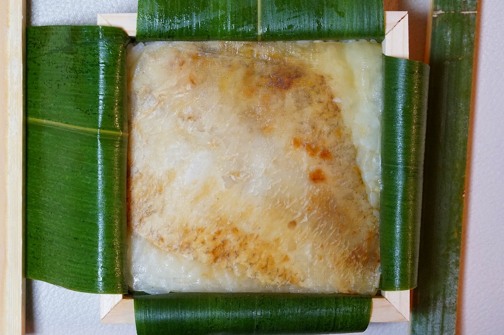 富山と駅弁の名物「ますのすし」と同じ構造を持つ、正方形の押寿司向け木箱に、笹の葉を敷き、酢飯を詰め、ノドグロの塩麹漬を並べ、白板昆布で覆い、「のどぐろ」とのみ描いたスリーブに収める。酢漬けや炙りだった他駅の駅弁とも、押寿司の空弁とも異なる、脂もほどほどに身の詰まった白身魚を素材で味わえる軽食。プラ製のへらを添付するが、笹の葉ごとつまんでかじれば食べやすい。1年間ほどの販売か。