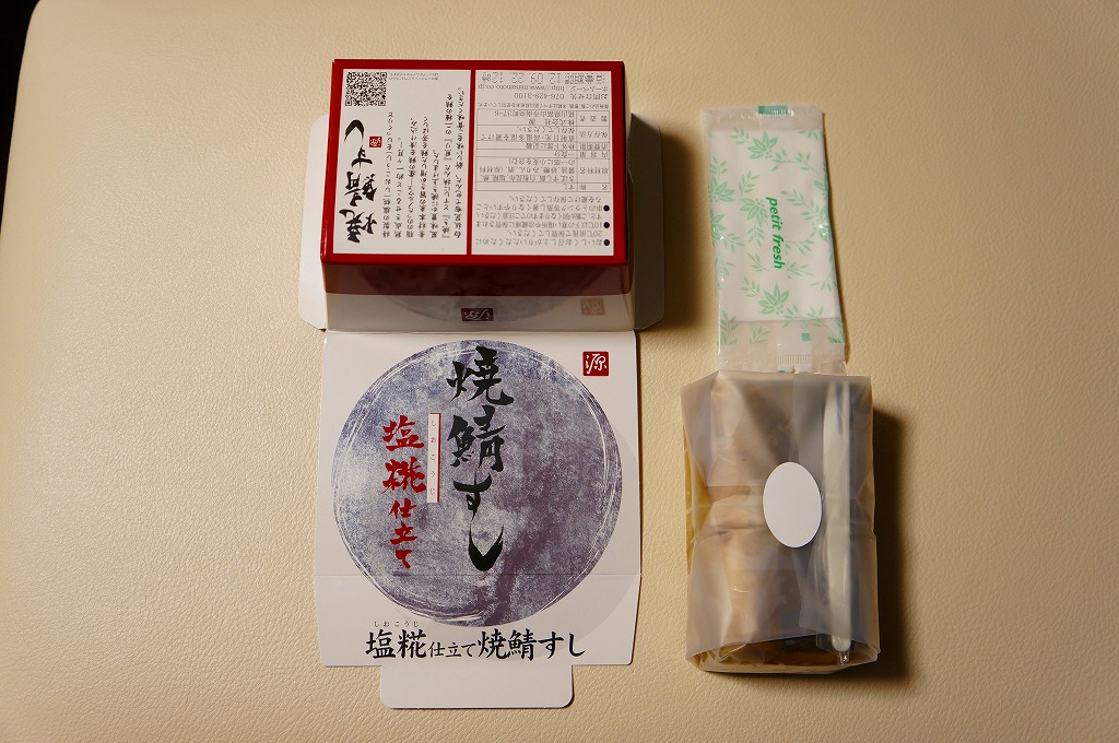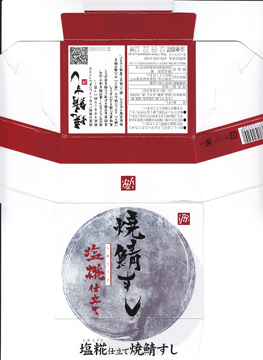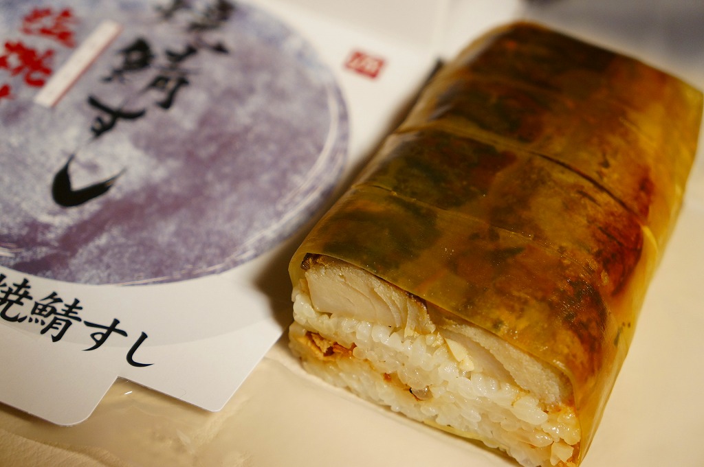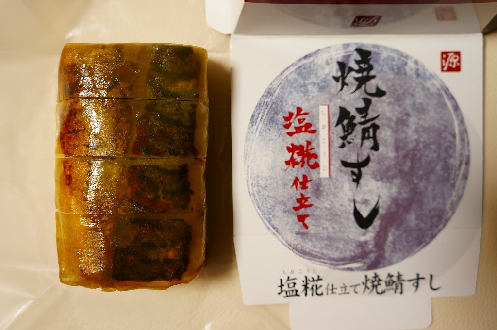 東京駅の巨大駅弁売店「駅弁屋 祭」で売られていた焼きサバ寿司。炙りサバを挟んだ寿司飯に焼きサバを乗せて、白板昆布で巻いてカットして、4切れ分を半透明なシートで梱包してボール紙の箱に収める。小さく軽く、お手軽な軽食。塩糀(しおこうじ)仕立てという接頭辞が付くが、シオもコウジもよくわからなく、各地の駅や空港やデパートで食べ慣れた普通の味。調製元が「ますのすし」で名高い富山駅の駅弁屋であるためここに収蔵したが、富山駅では売られているのだろうか。2019年時点で1,400円の高級駅弁になり、2024年4月から1,500円。