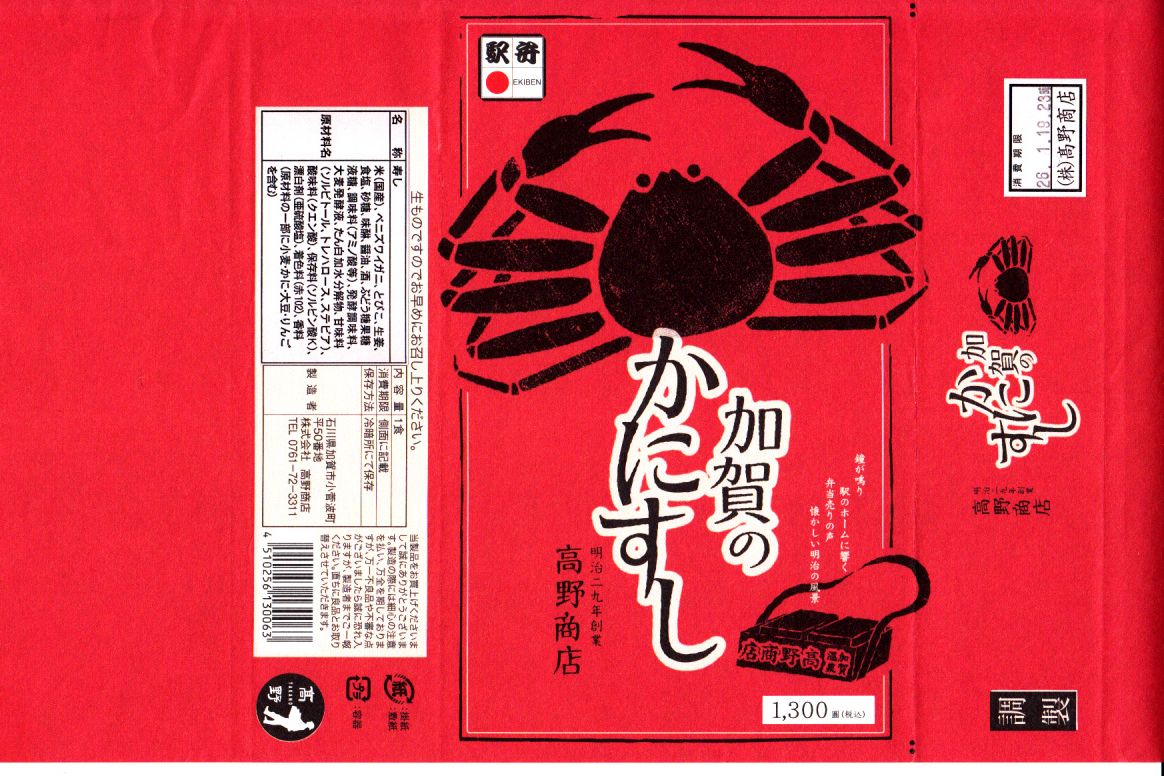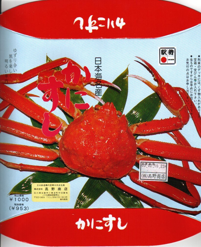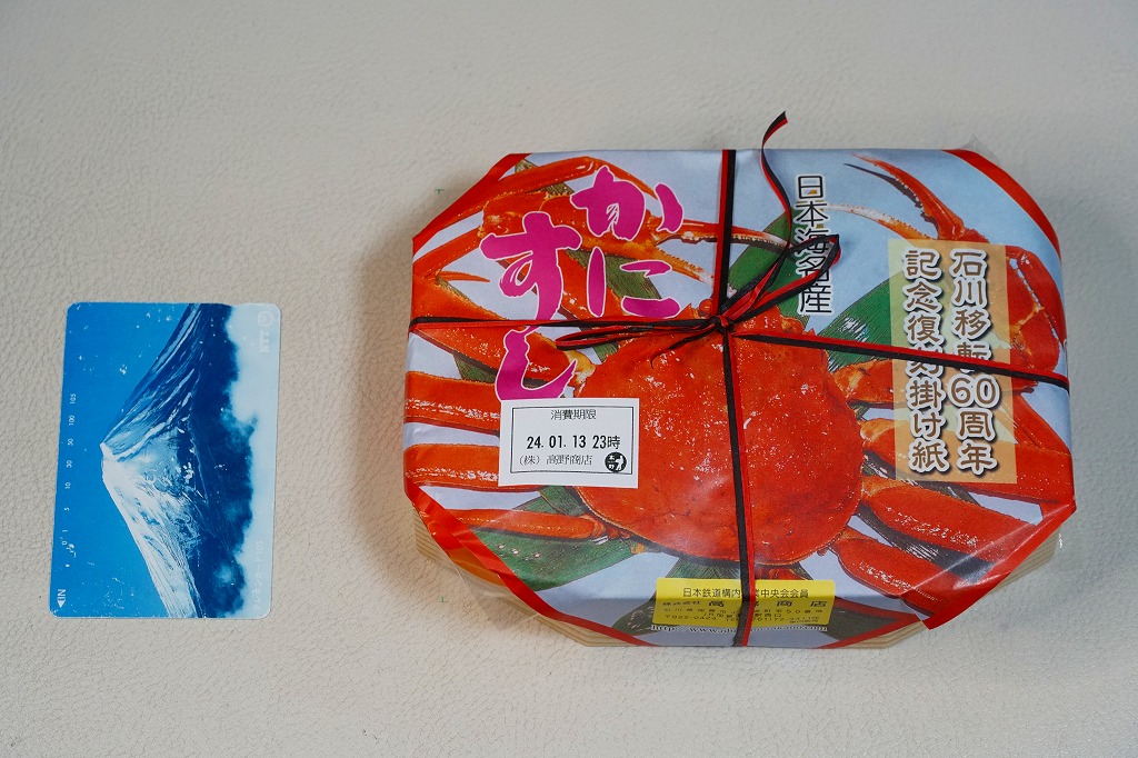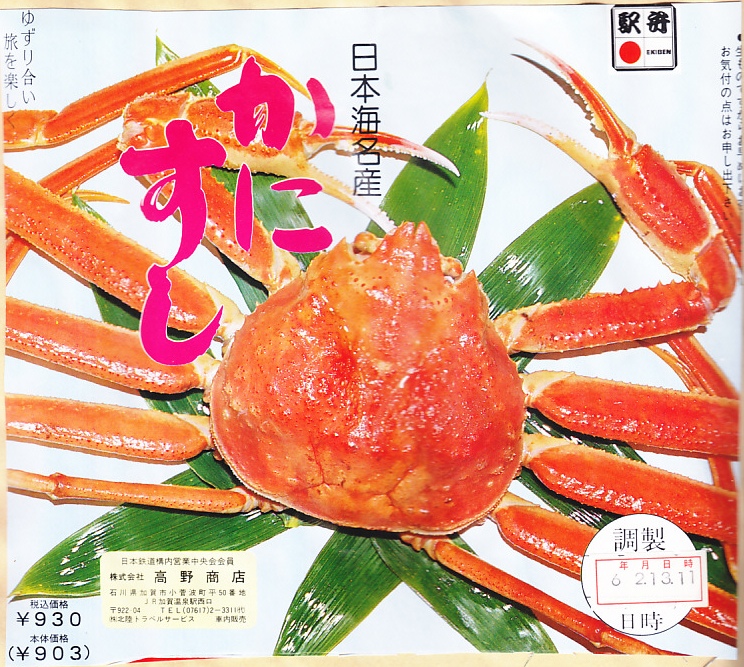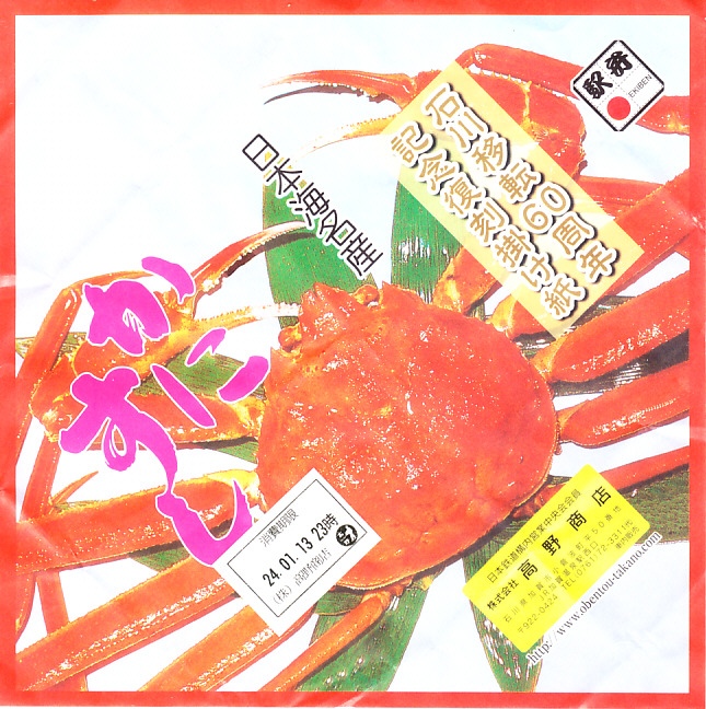 2024(令和6)年1月の京王百貨店の駅弁大会で輸送販売。この催事で、掛紙を復刻した駅弁「昭和レトロな掛け紙弁当」のひとつとして売られた。加賀温泉駅の名物駅弁「日本海名産かにすし」について、「石川移転60周年記念復刻掛け紙」と銘打ち、八角形の容器に普段のボール紙箱でなく掛紙をかけて販売した。絵柄は上記のとおり、現行のものと同じ。容器と中身と価格も同じ。「石川移転60周年」とは、調製元が福井県の今庄駅から石川県の大聖寺駅へ移転した1962(昭和37)年から起算したのだろうが、60年を一年半くらい過ぎており、その時に作った掛紙だろうか。
