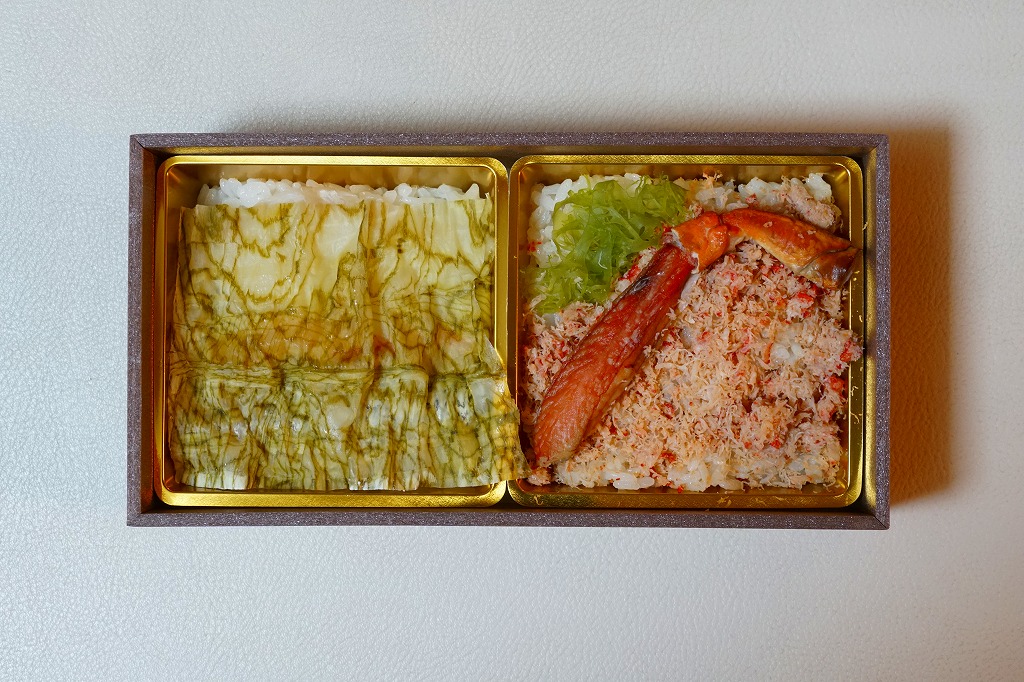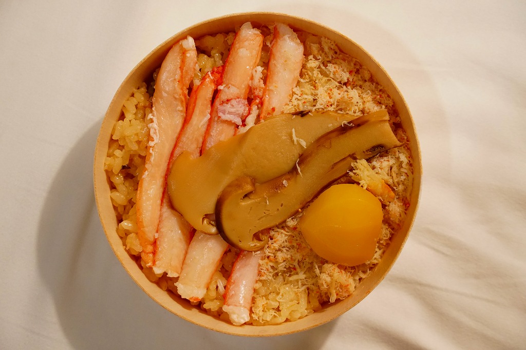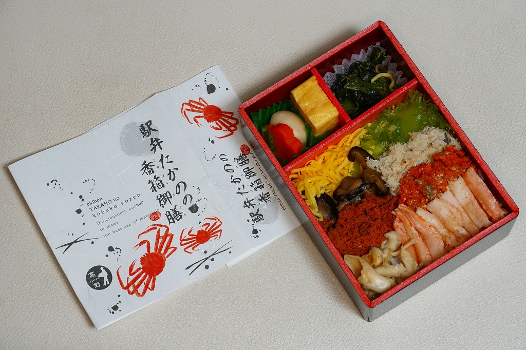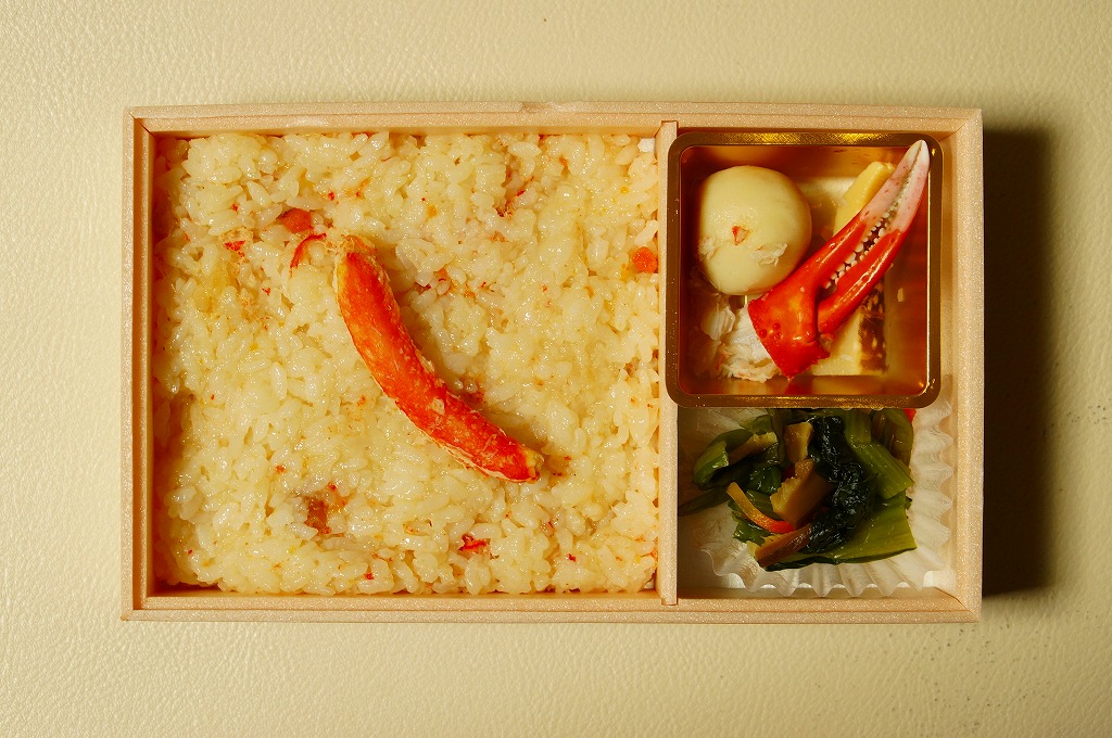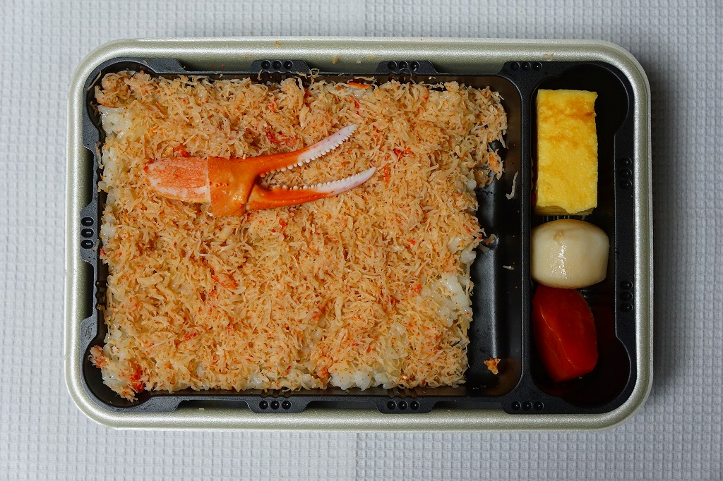 2023(令和5)年1月の京王百貨店の駅弁大会で実演販売。小柄で四角い容器に飯を詰め、蟹の脚肉、腹肉、ほぐし、内子を「ふんだんに」載せ、バイ貝と椎茸と海藻と錦糸卵で補い、玉子焼と煮物と青菜を添える。見た目でも詰め方でも、催事場のカニ弁当らしからぬ上品さを感じるが、香箱蟹やその内子が高価なのだろう、3000円以上の高額商品となり、催事場で苦戦していたようにみえた。